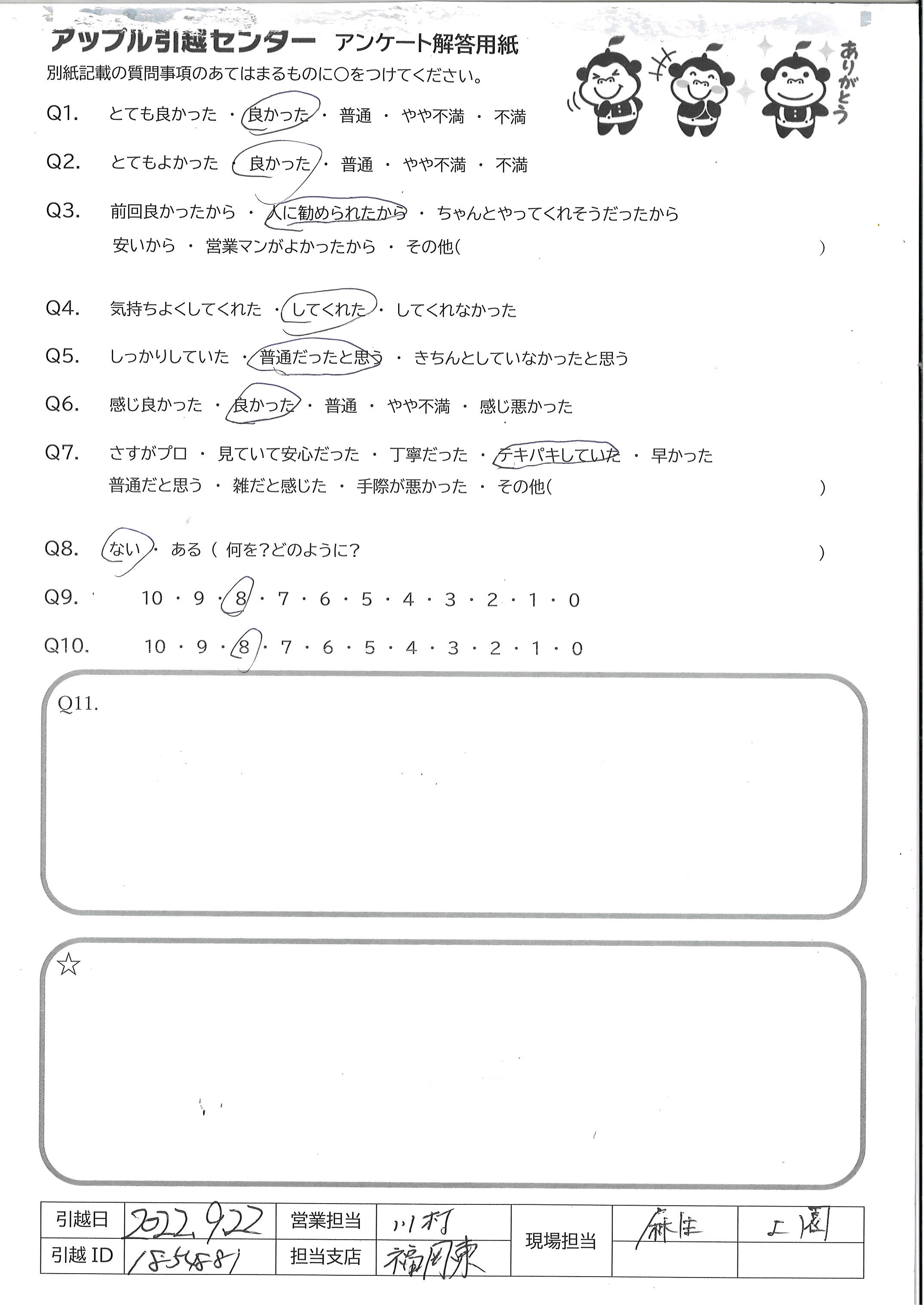 引越し日:2022年09月22日 エリア:福岡県福岡市博多区