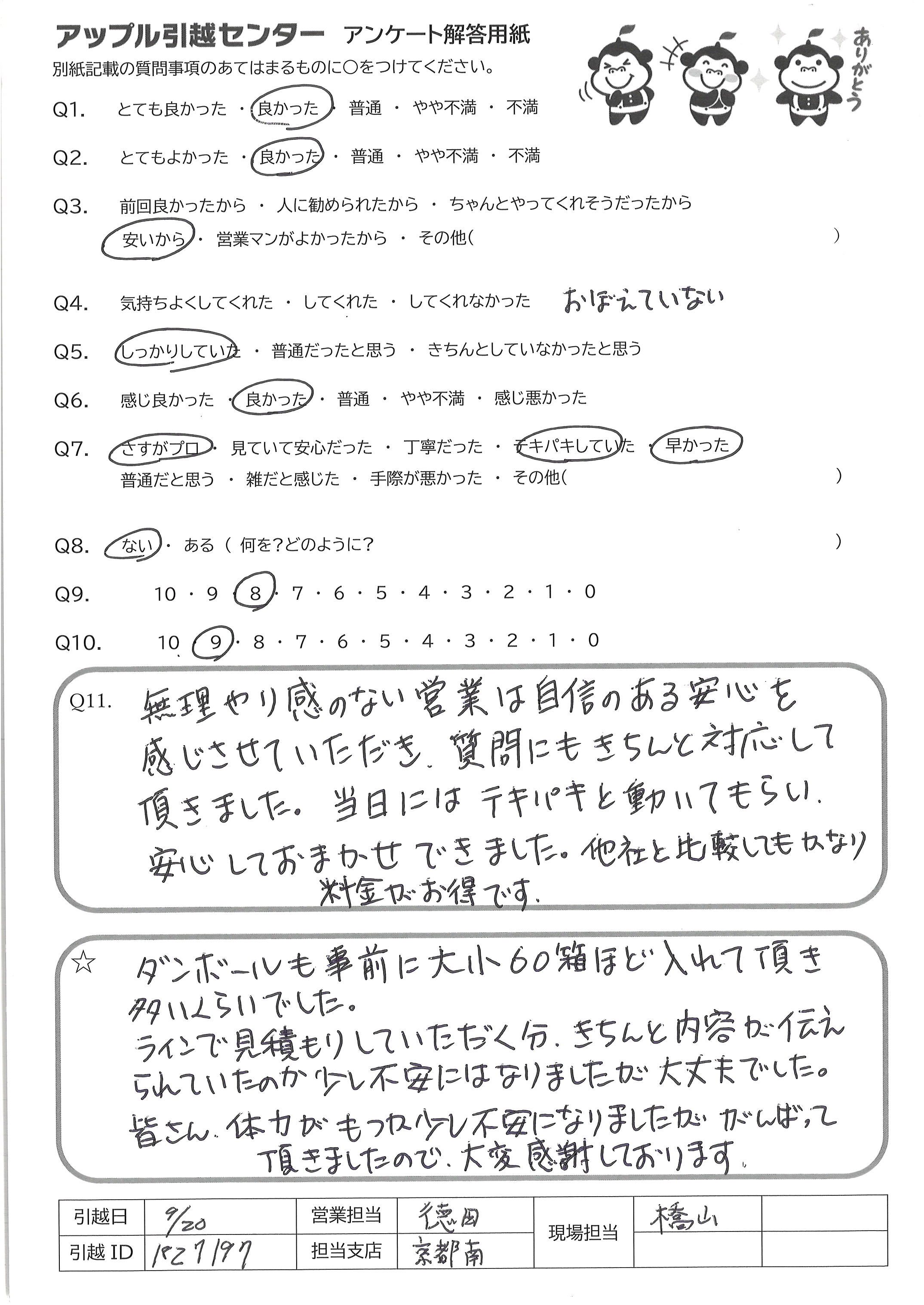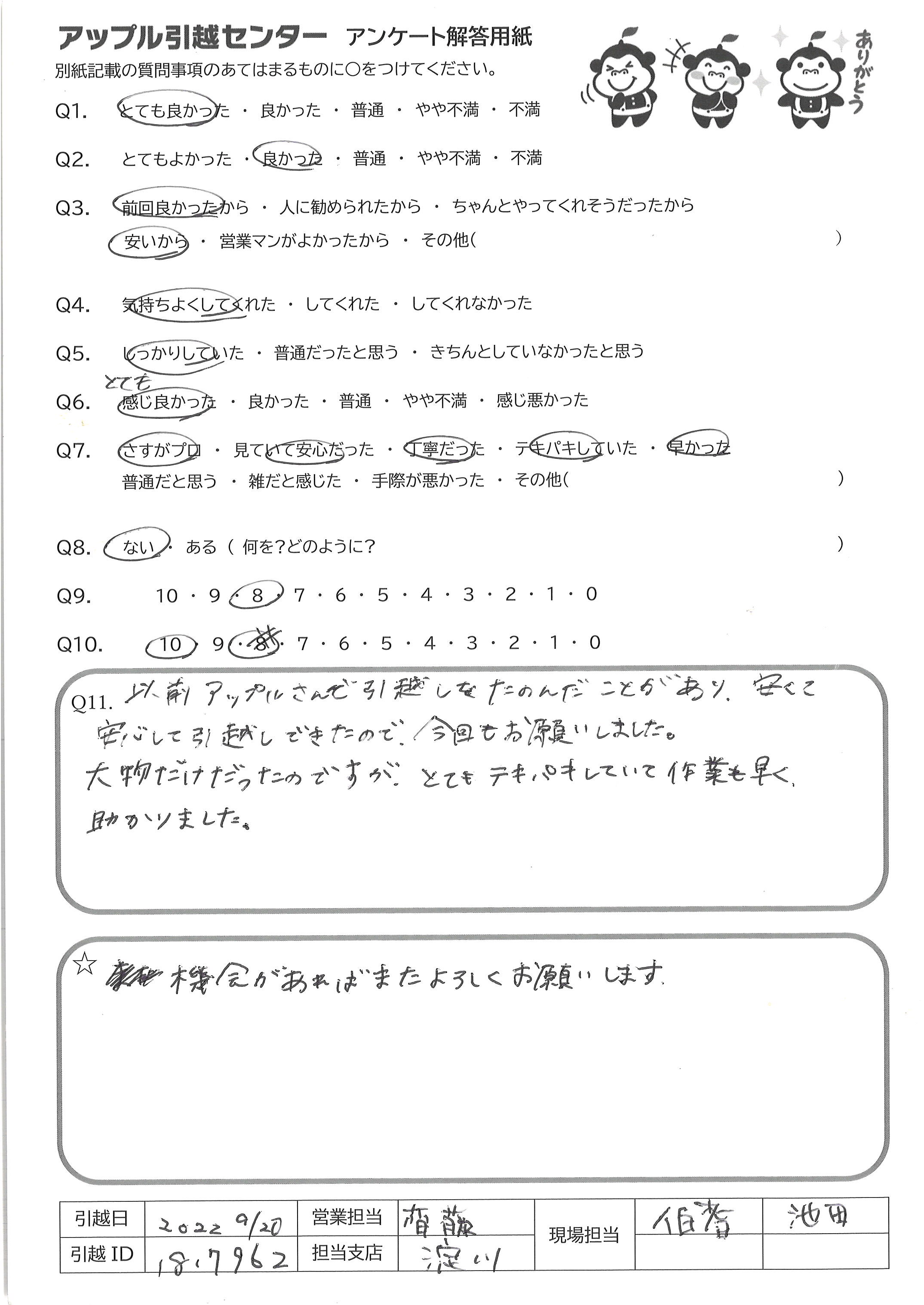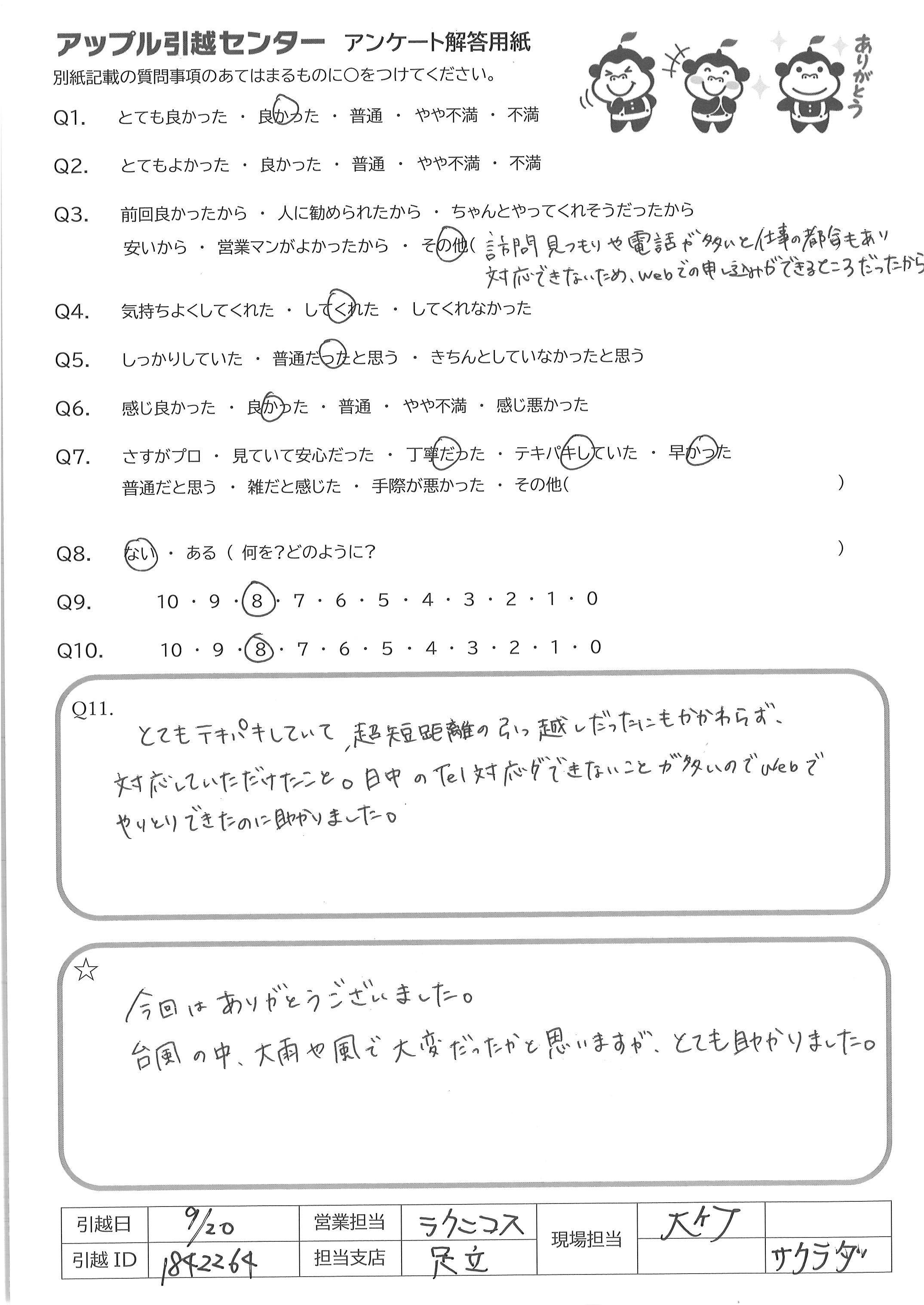 A.お電話について とても簡潔でまた感じも良かったです。 引っ越し作業について 最初に部屋に入られた時点から何が必要でどういう動きをするかを念頭に置かれながら仕事をされていることを感じました。また、こちらの引越し準備が不十分だった面があったにもかかわらず、丁寧にご対応くださいました。