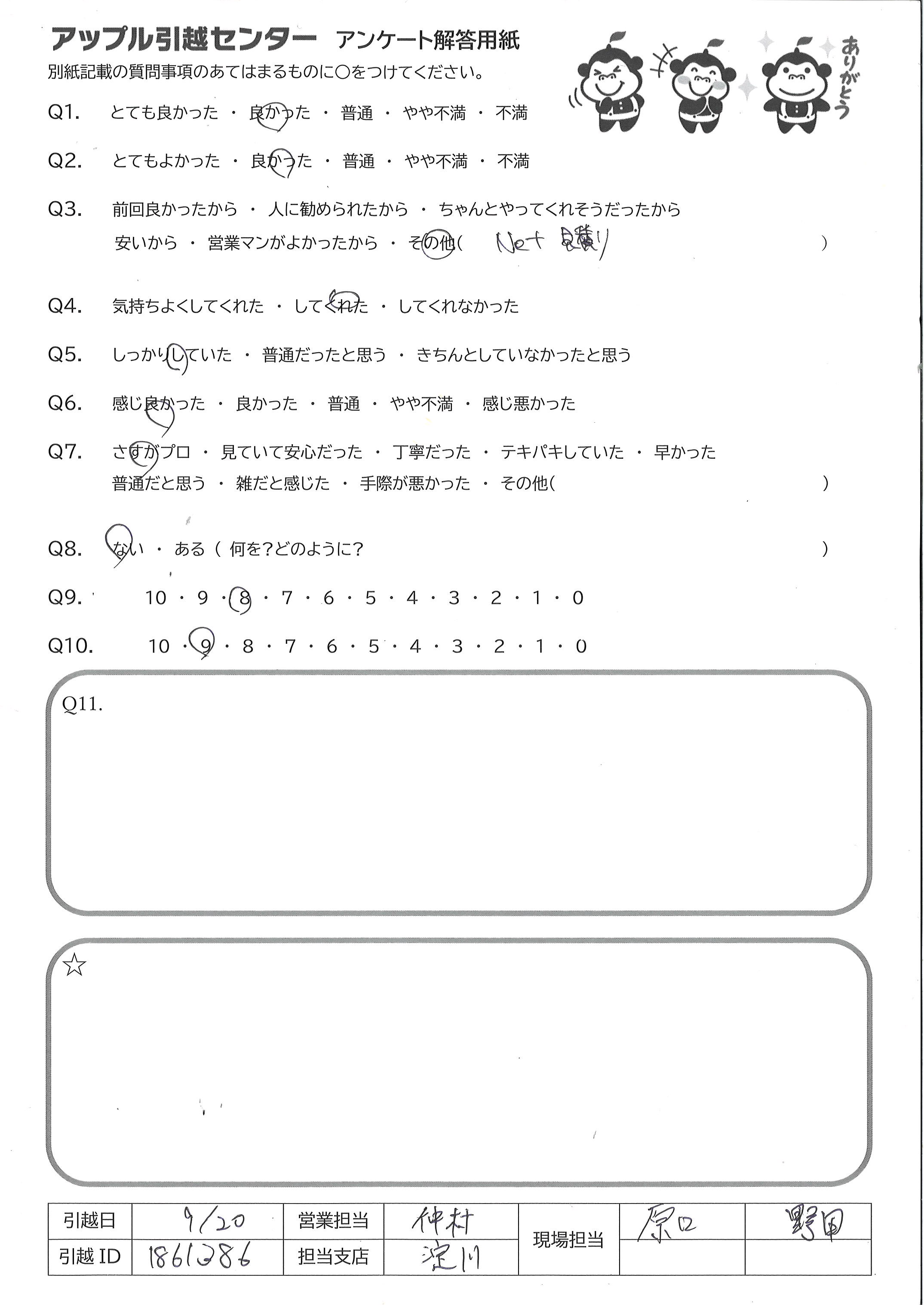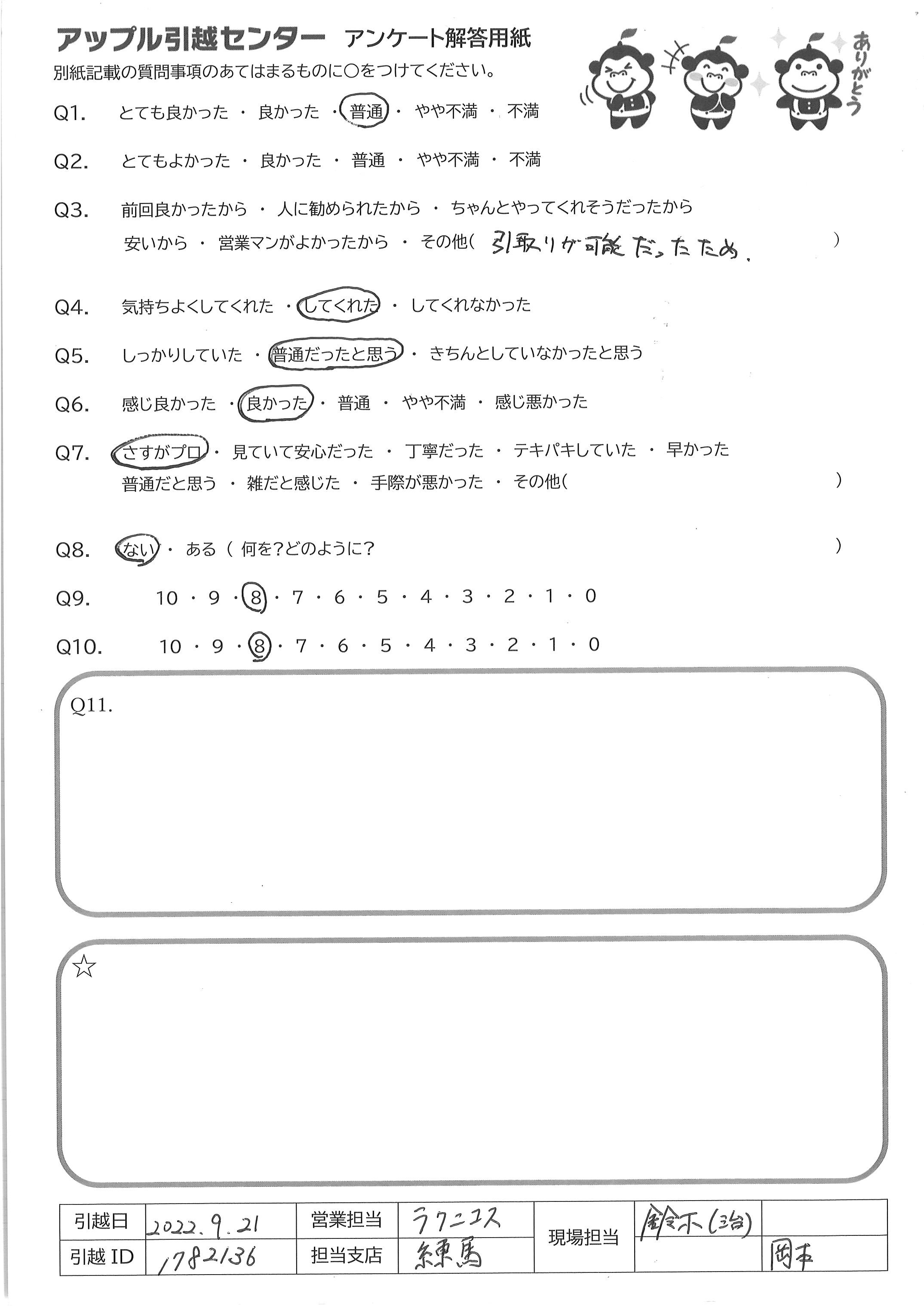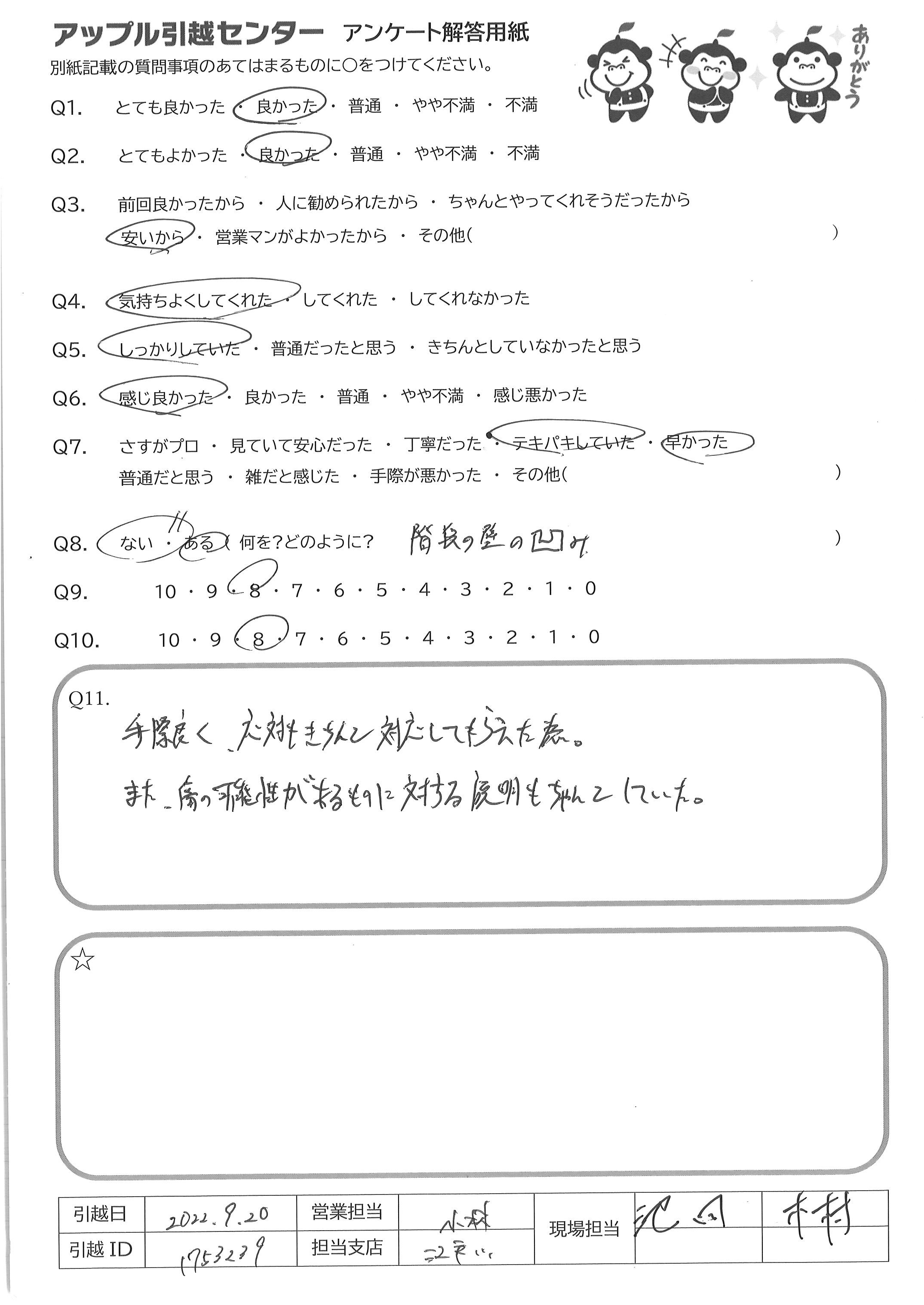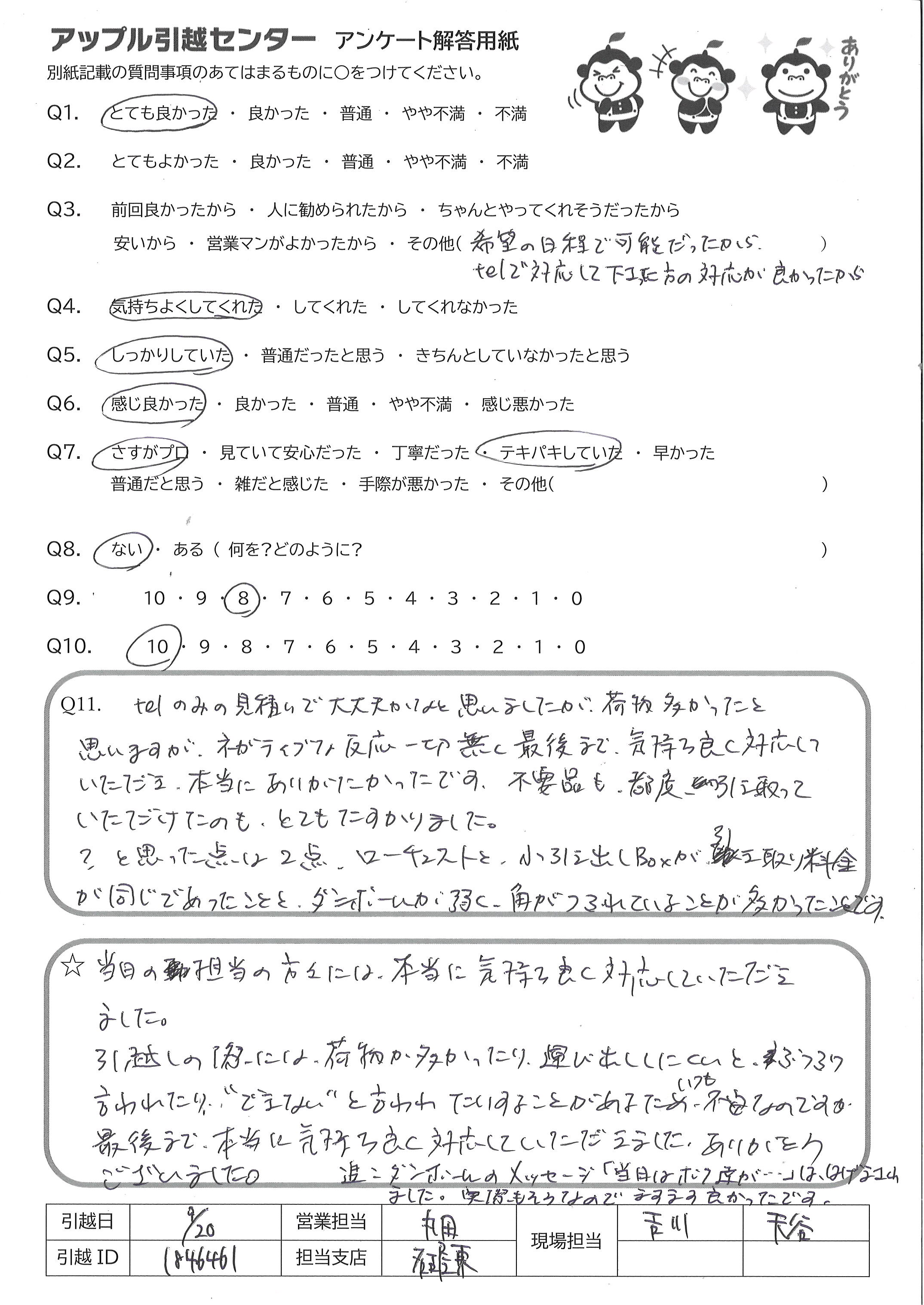 A.お電話について とても簡潔でまた感じも良かったです。 引っ越し作業について 最初に部屋に入られた時点から何が必要でどういう動きをするかを念頭に置かれながら仕事をされていることを感じました。また、こちらの引越し準備が不十分だった面があったにもかかわらず、丁寧にご対応くださいました。