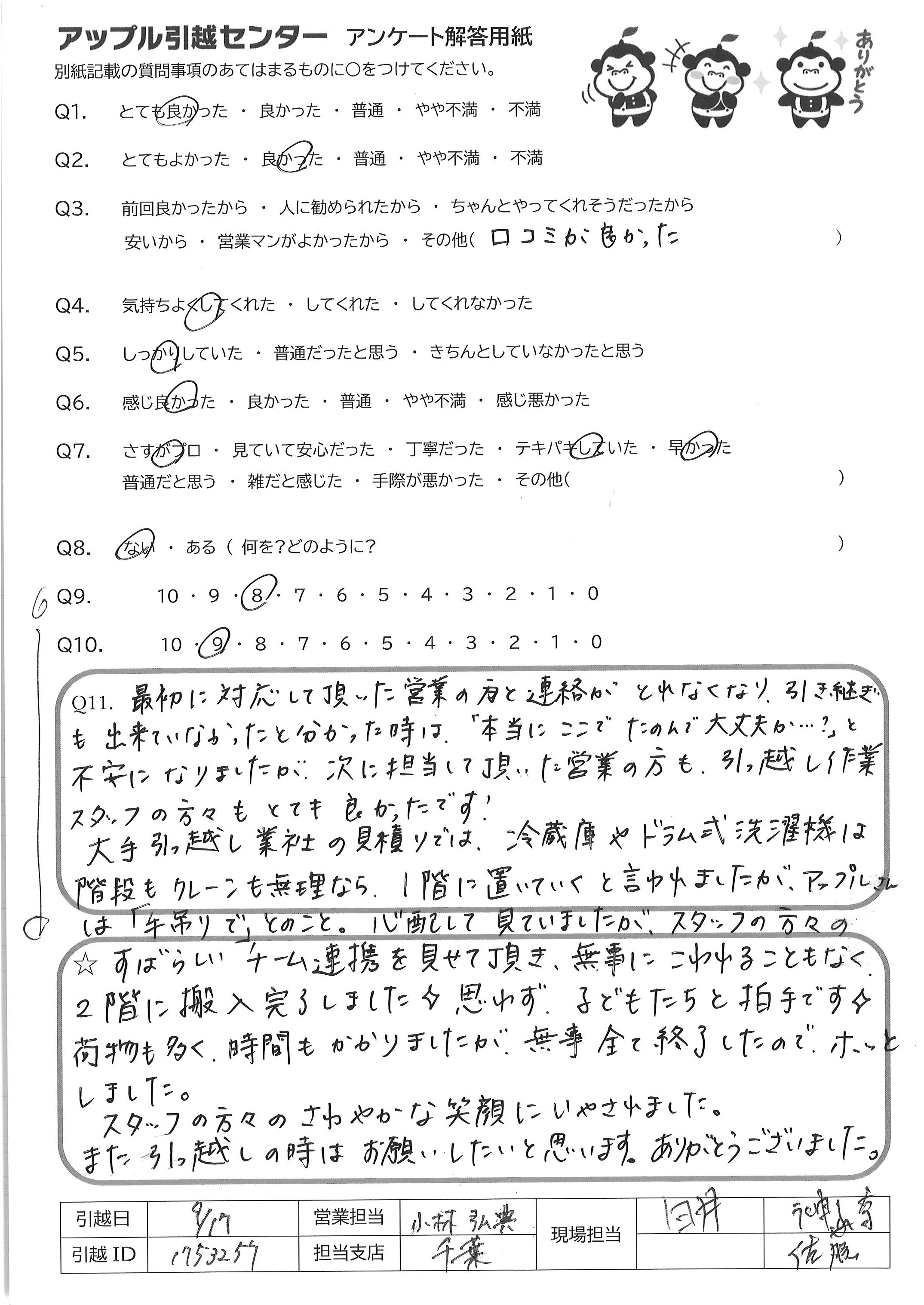 A.この度は、2世帯同時の引っ越しで、4日間お世話になりました。リーダーが90過ぎた両親を気遣いながら、又子供たちを楽しく手伝うように工夫してくれたり、本当にお世話になりました。暑い中大変な作業を、スタッフ皆さん頑張って下さり、無事に引っ越しが出来き感謝しております。大変な引っ越しでしたが楽しかったです。ありがとうございました!