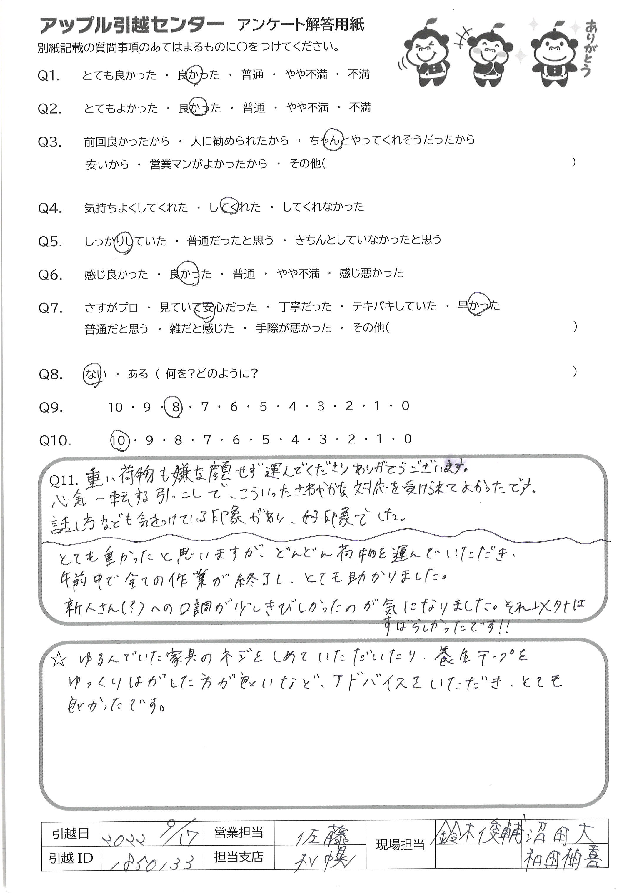 A.重い荷物も嫌な顔せず運んでくださりありがとうございます 心気一転する引っこしで、こういったさわやかな対応を受けられてよかったです 話し方なども気をつけている印象があり、好印象でした とても重かったと思いますが、どんどん荷物を運んでいただき 午前中で全ての作業が終了し、とても助かりました 新人さん(?)の口調が少しきびしかったのが気になりました。それ以外は すばらしかったです!!