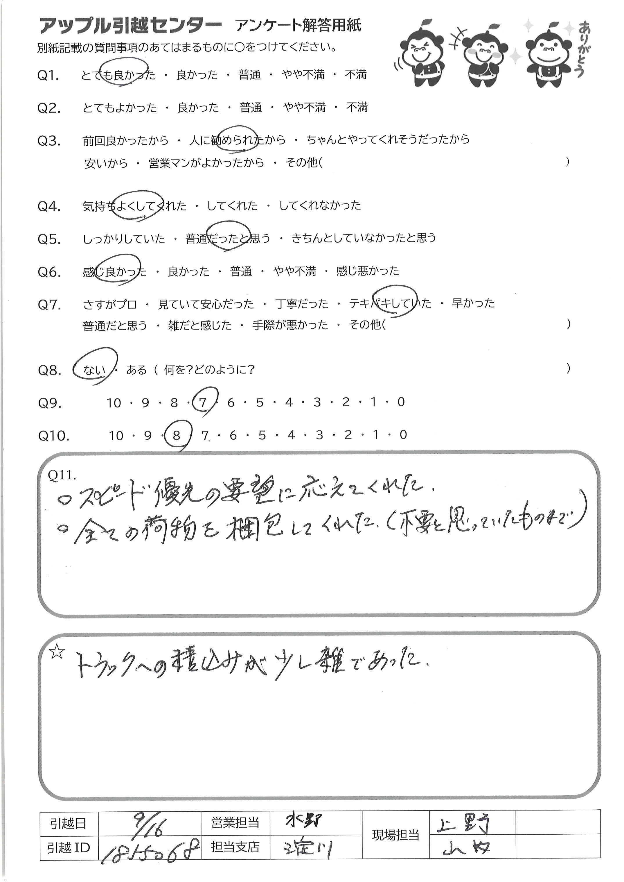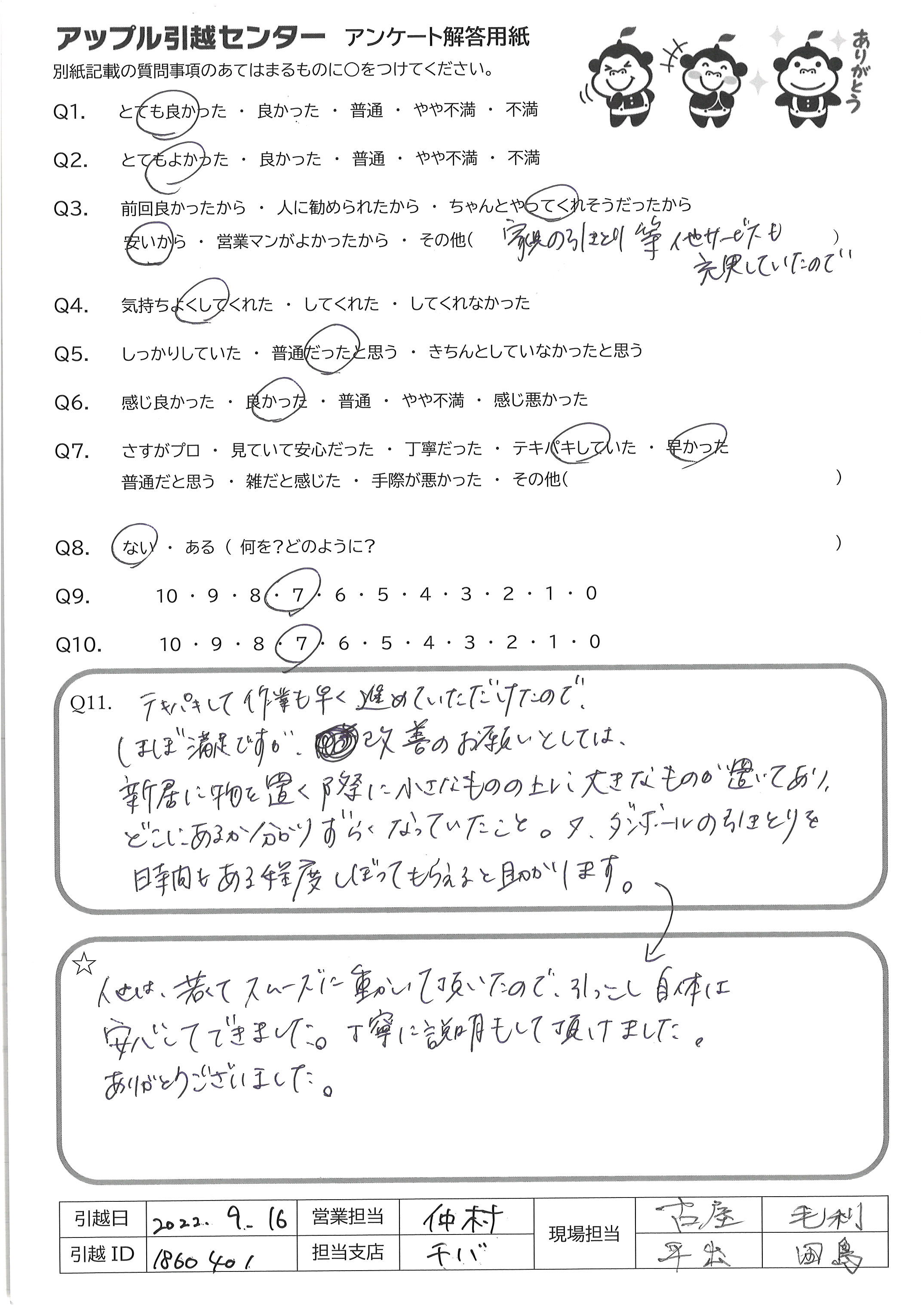 A.テキパキ作業も早く、進めていただけたので ほぼ満足です。改善のお願いとしては 新居に物を置く際に小さなものの上に大きなものが置いてあり どこにあるかわかりずらくなっていたこと。又、ダンボールの引きとりう 時間もある程度しぼってもらえると助かります