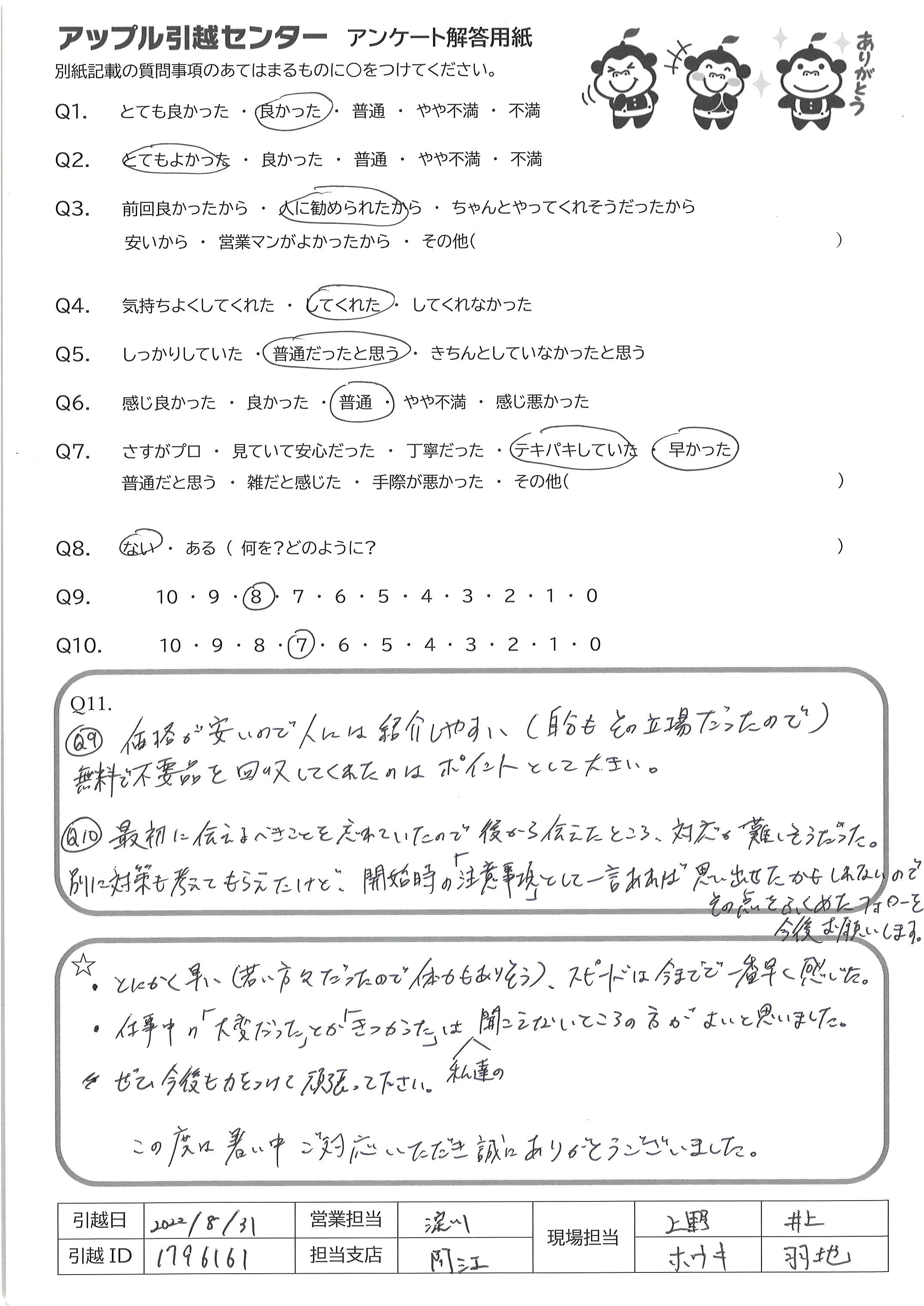 A.・とにかく早い(若い方々だったので体力もありそう)、スピードは今までで一番早く感じた ・仕事中の「大変だった」とか@きつかった」は私達には聞こえないところの方がよいと思いました ぜひ、今後も体力つけて頑張って下さい この度は暑い中、ご対応いただき誠にありがとうございました
