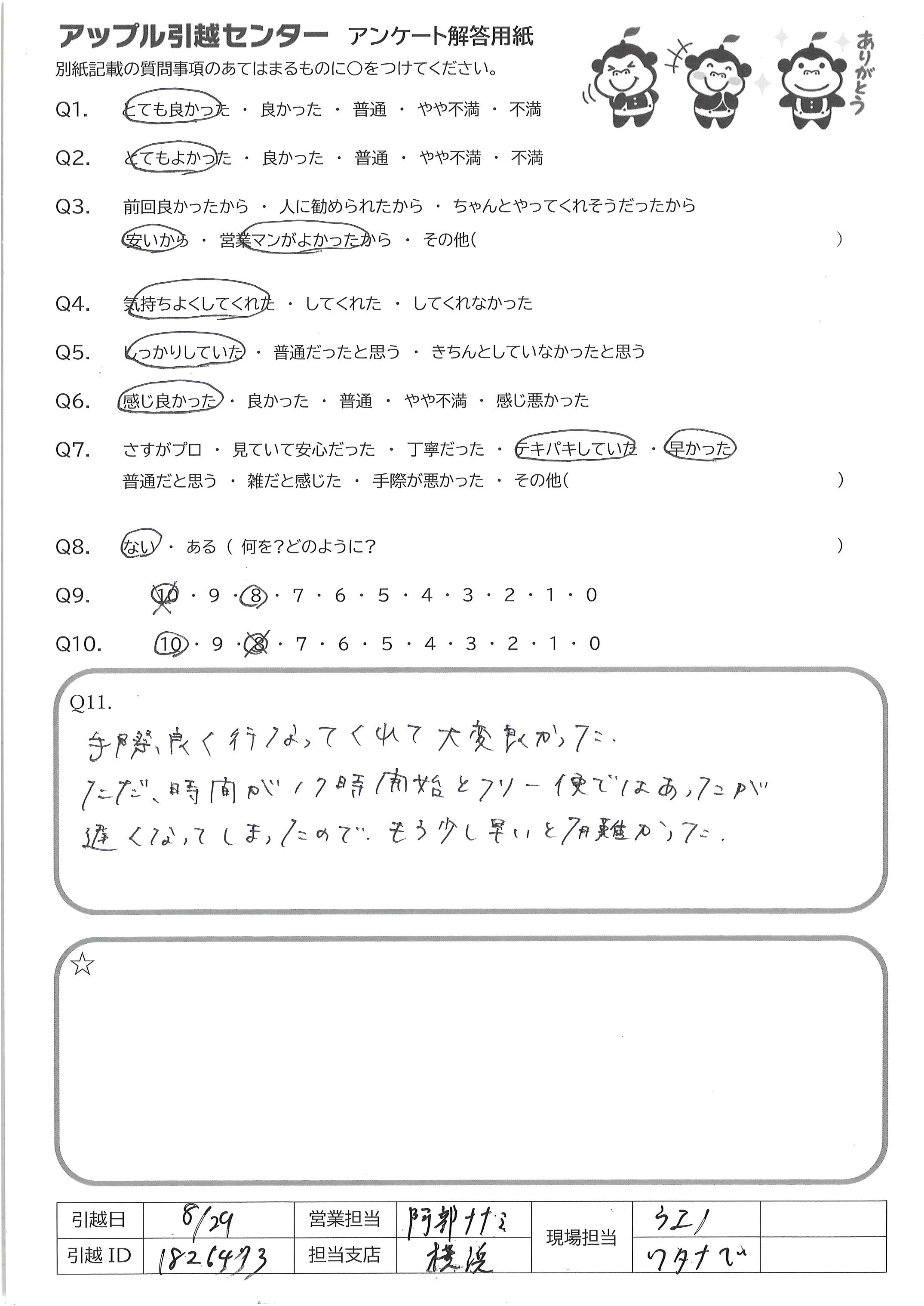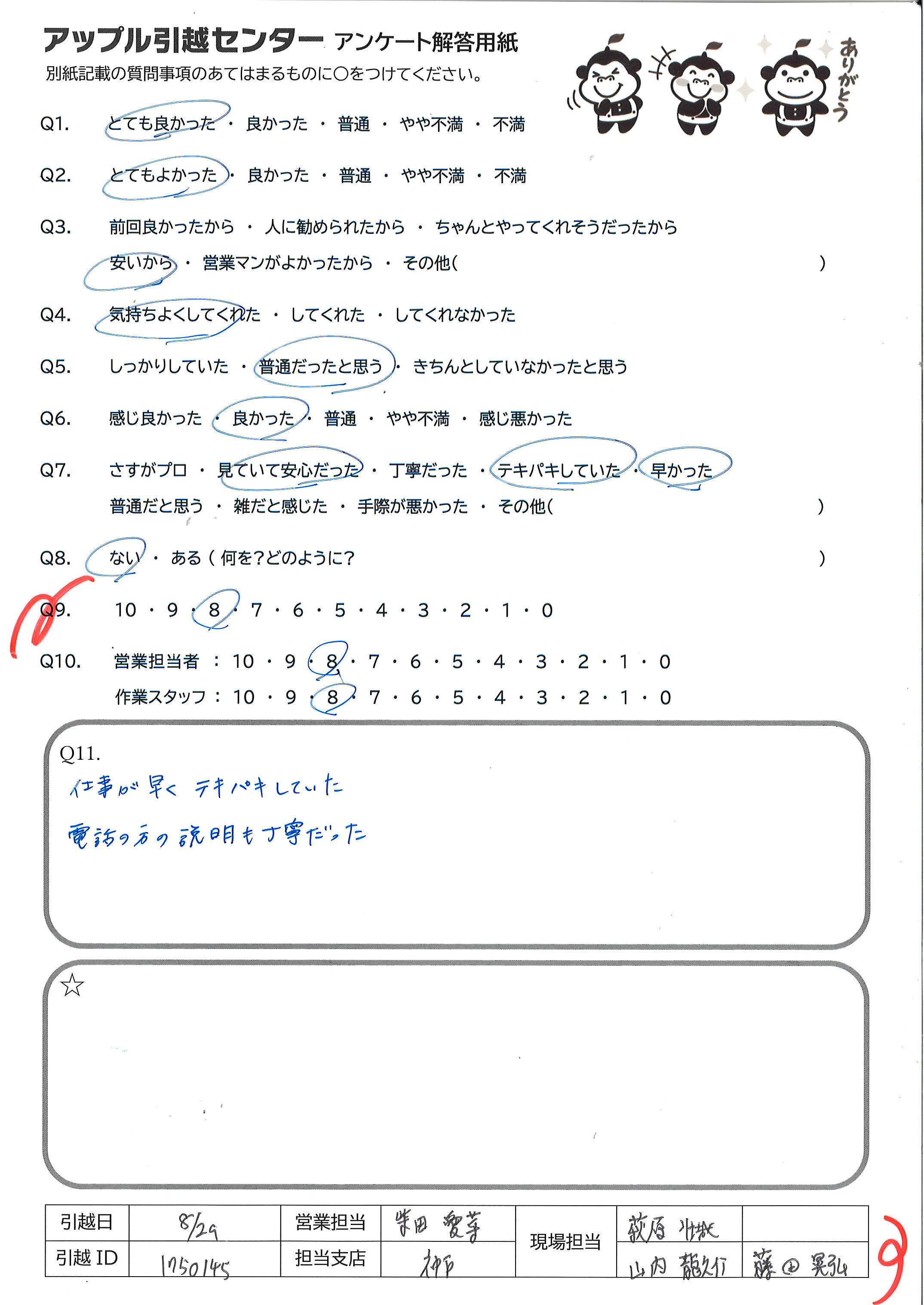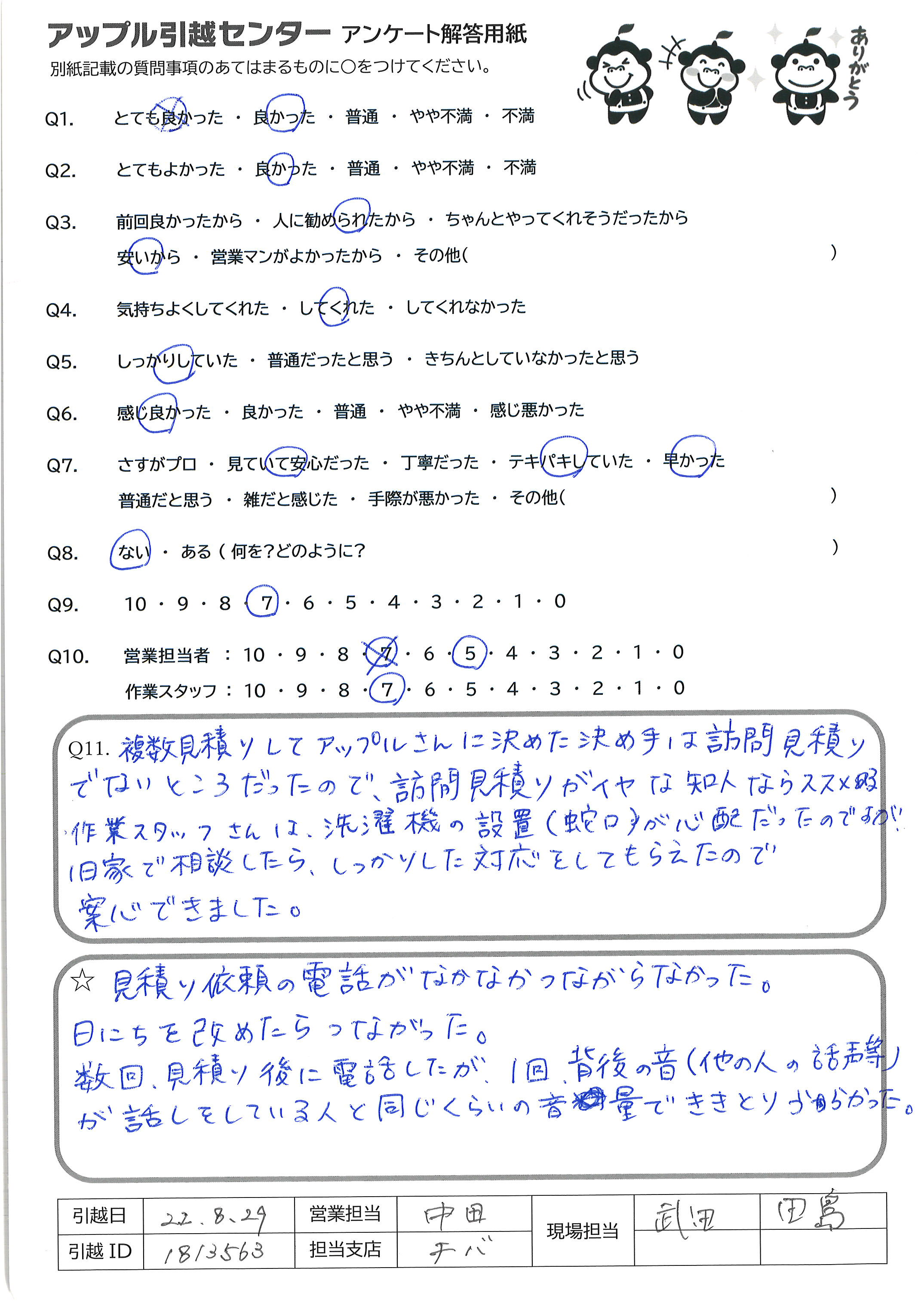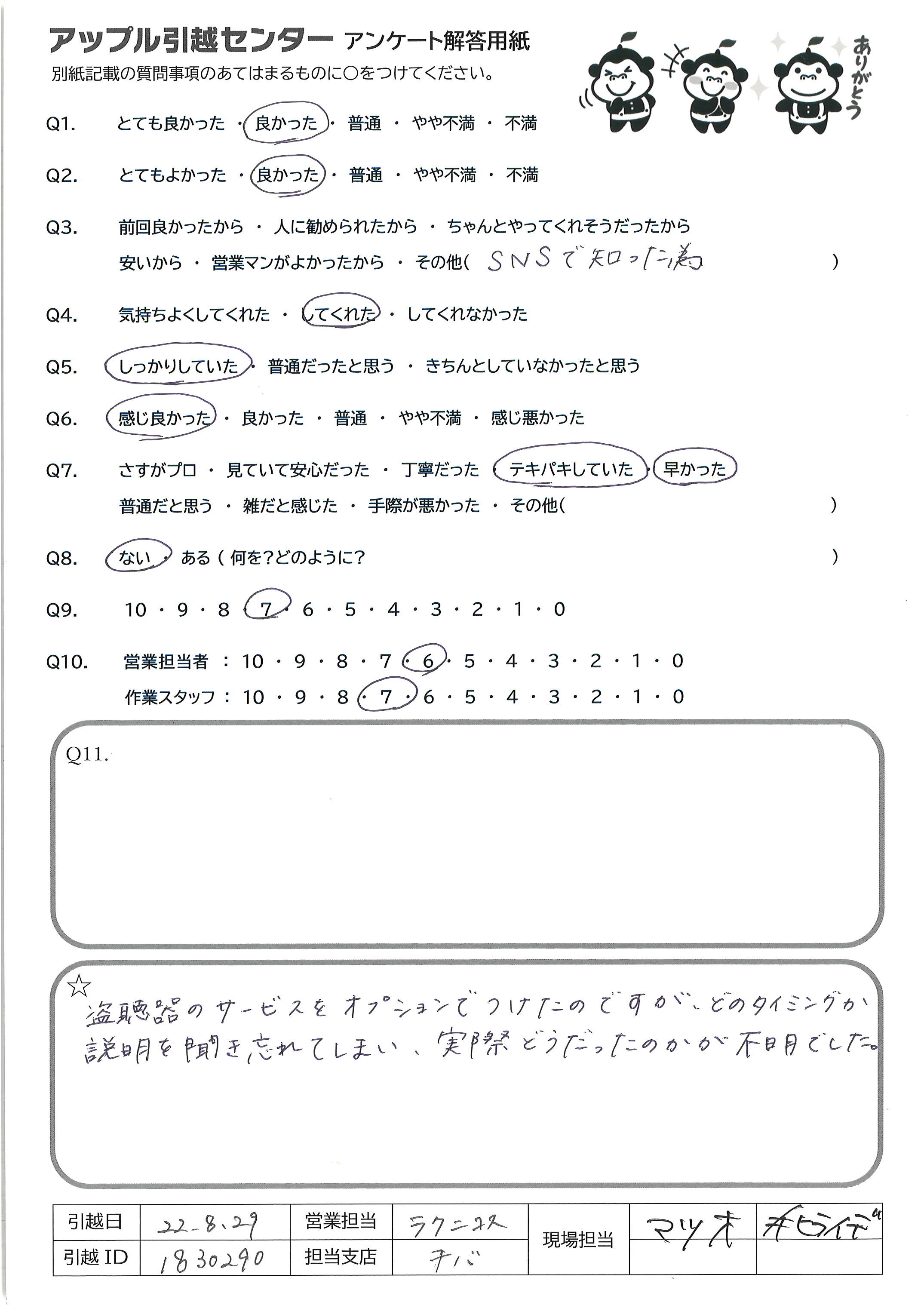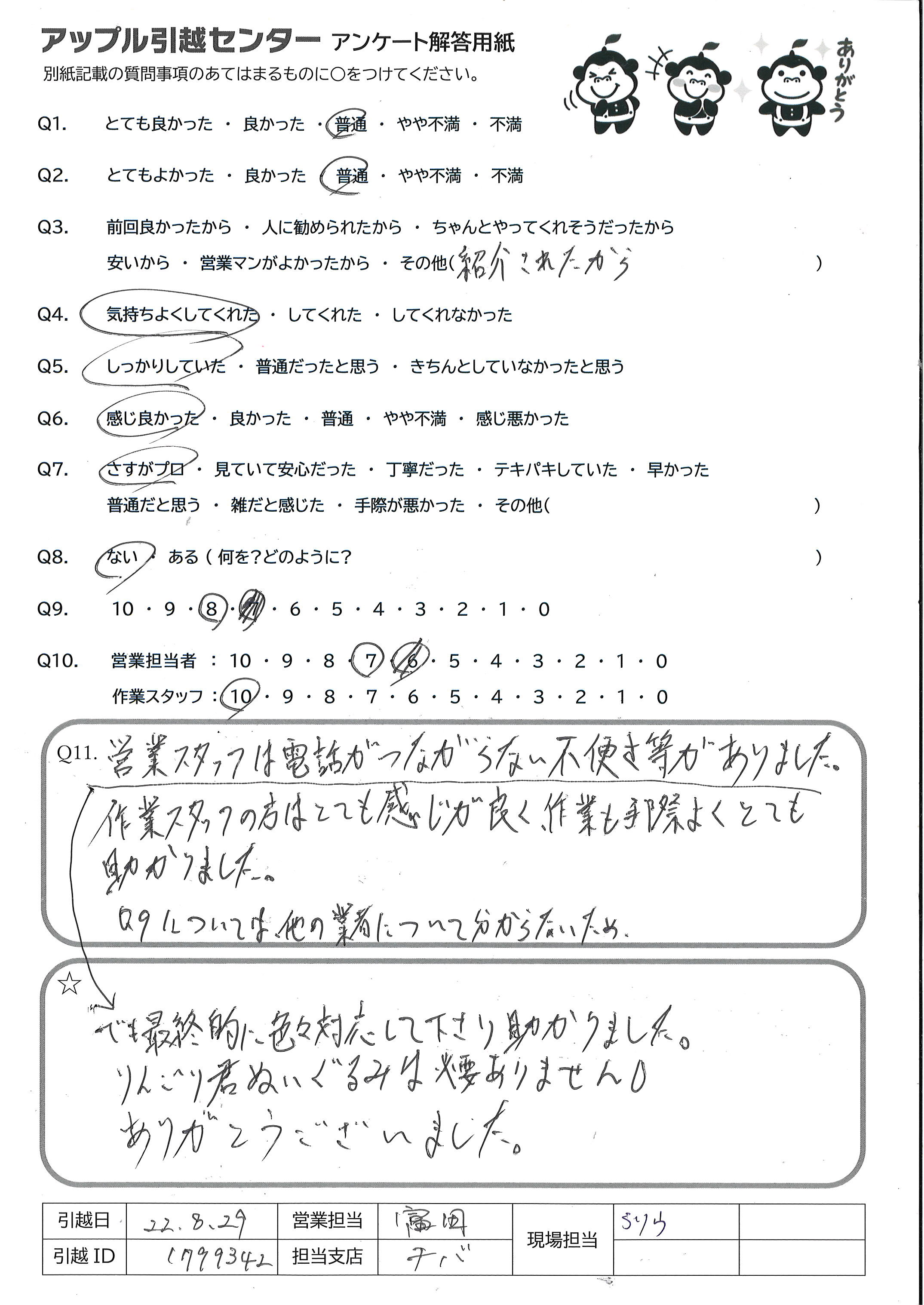 A.営業スタッフは電話がつながらない不便さ等がありました でも、最終的に色々対応して下さり、助かりました りんごり君ぬいぐるみは必要ありません。 ありがとうございました 作業スタッフの方はとても感じが良く、作業も手際よくとても 助かりました。 Q9について他の業者について分からないため