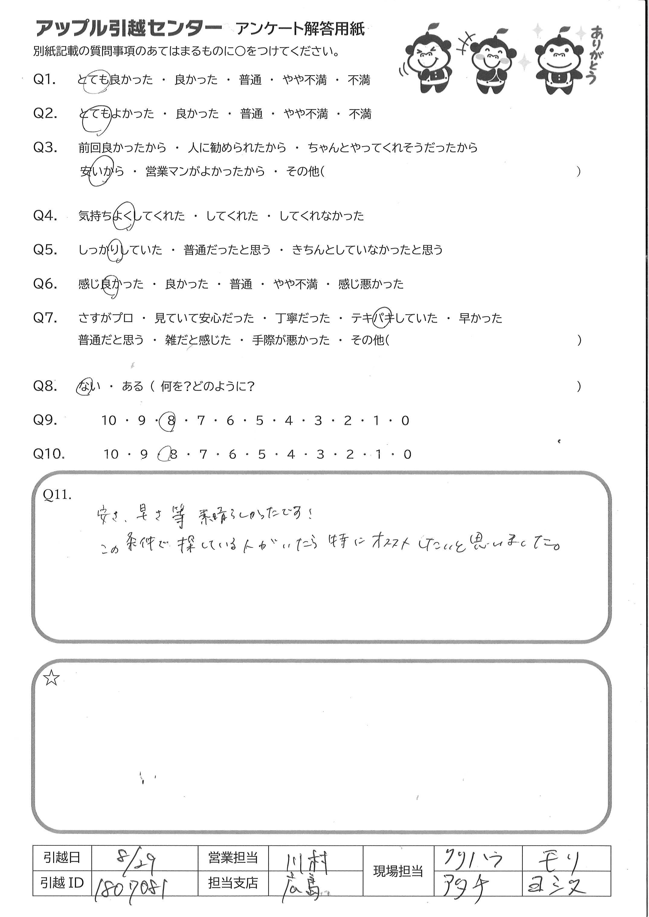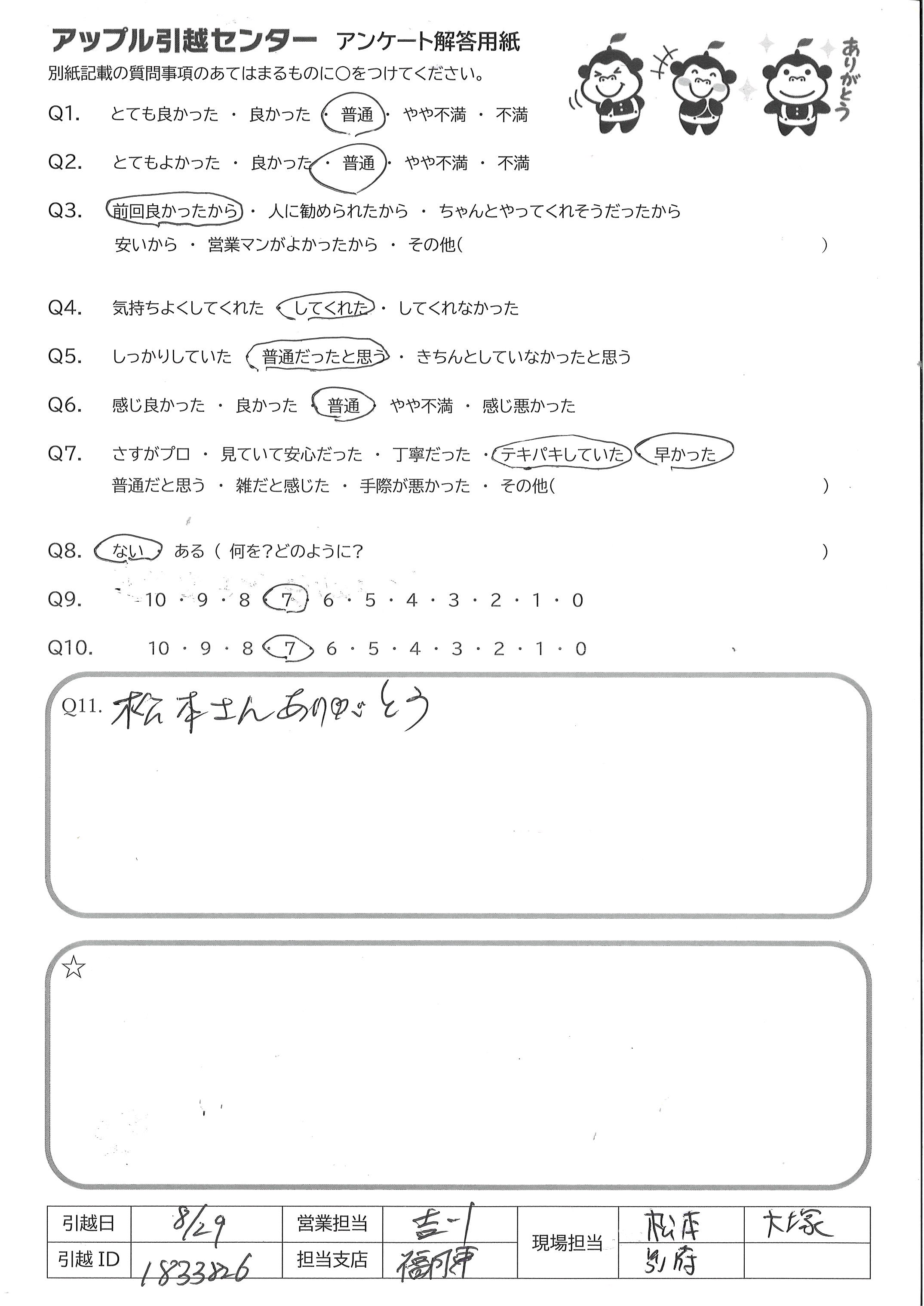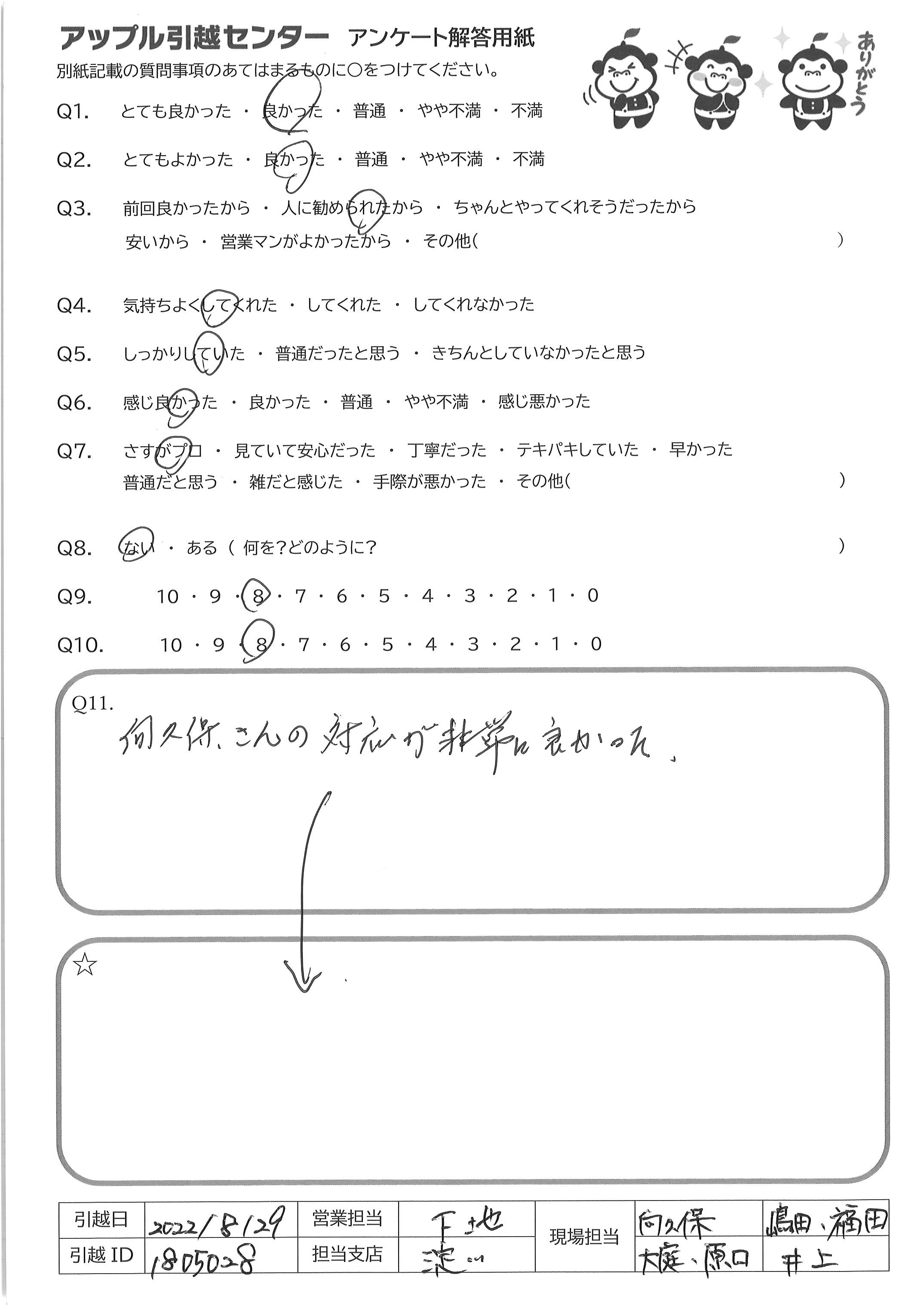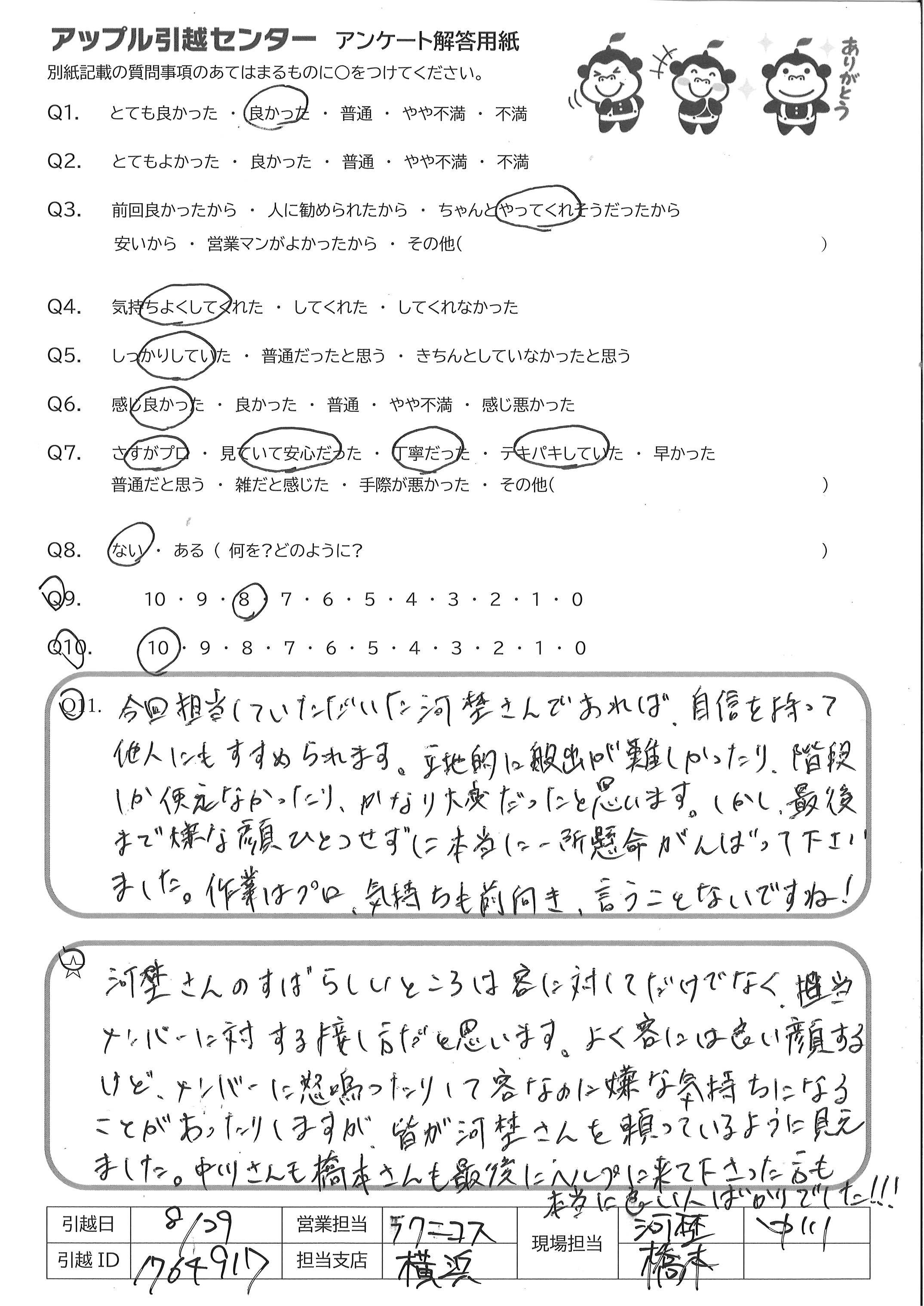 A.今回担当していただいた河埜さんであれば、自信を持って 他人にもすすめられます。立地的に搬出が難しかったり、階段 しか使えなかったり、かなり大変だったと思います。しかし最後 まで嫌な顔ひとつせずに、本当に一所懸命がんばって下さい ました。作業はプロ、気持ちも前向き、いう事ないですね!