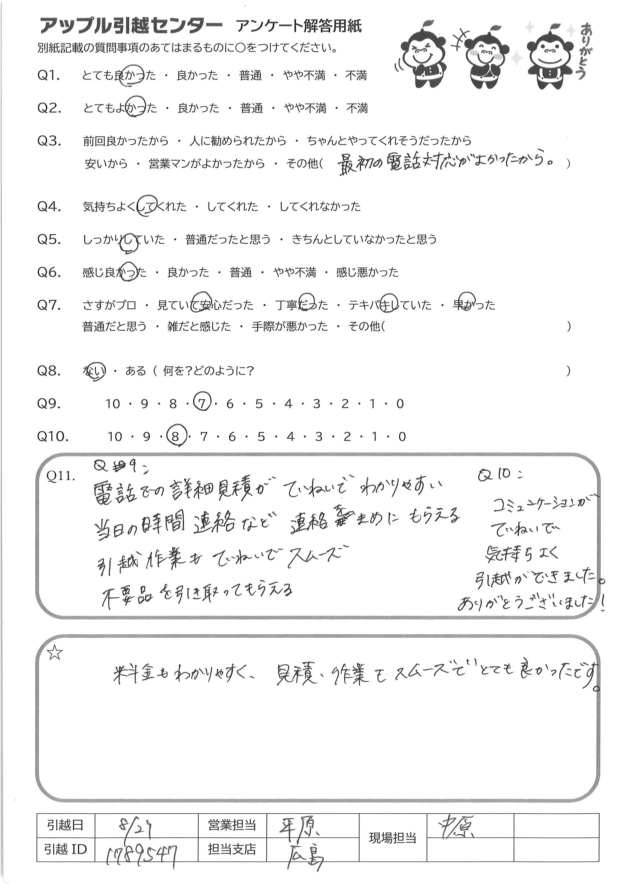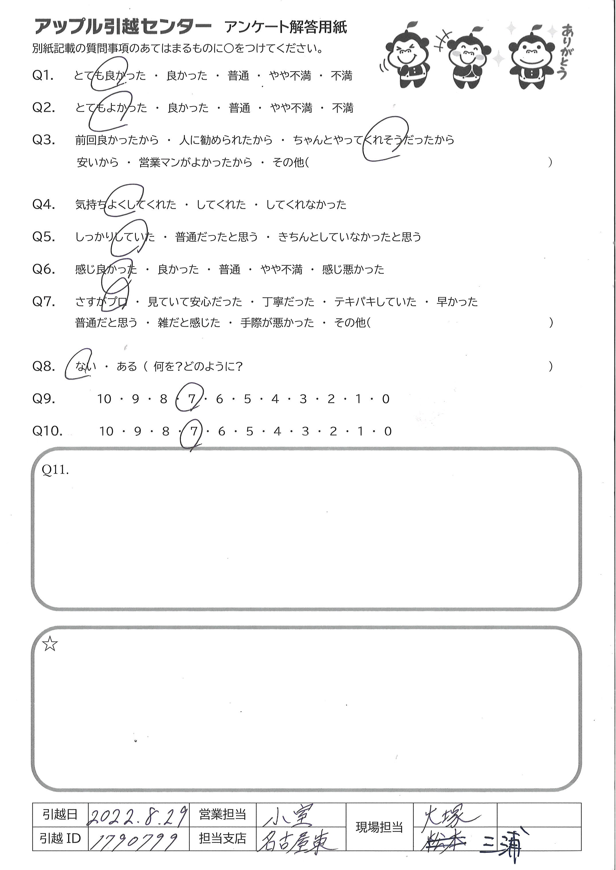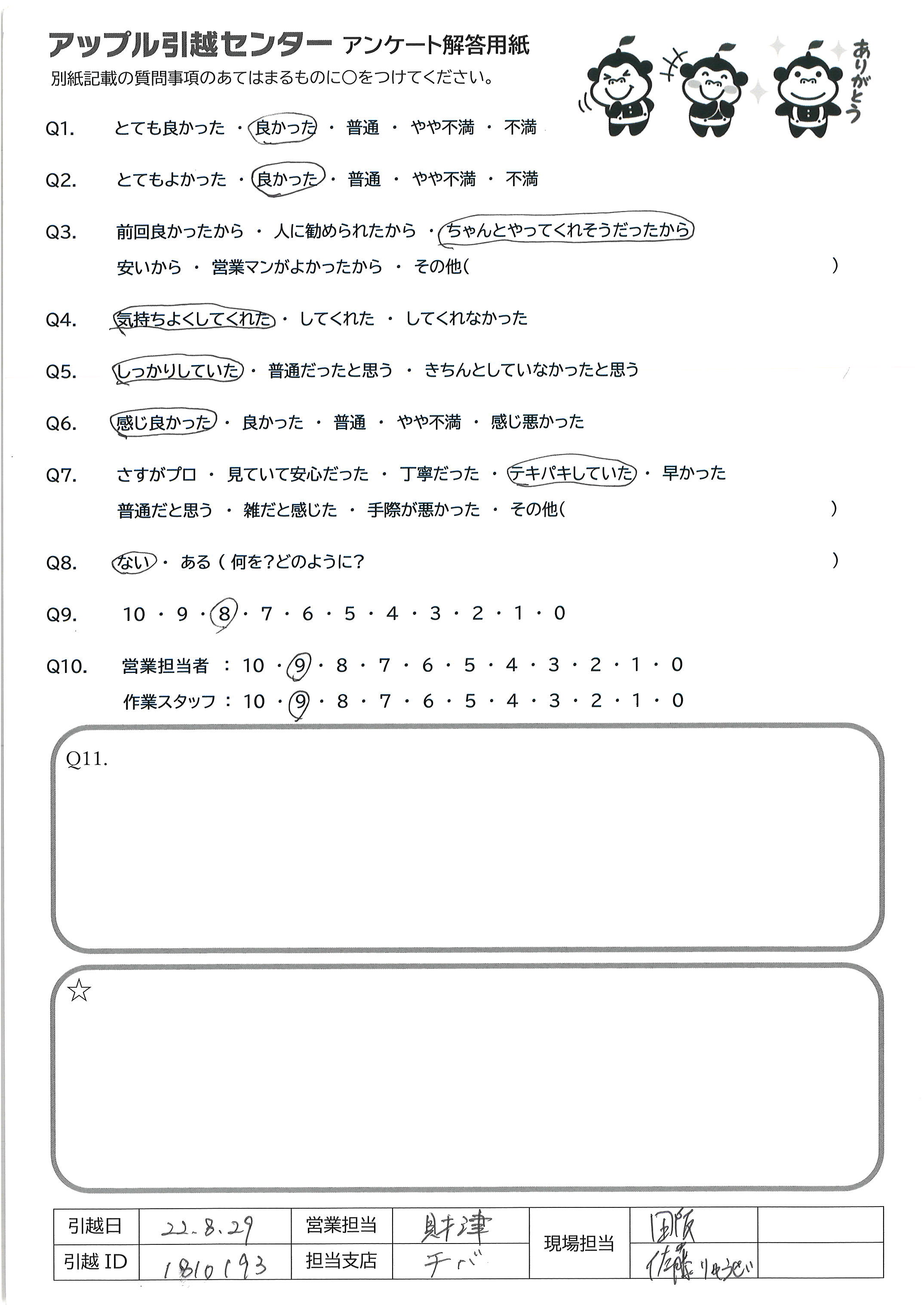 A.Q9:電話での詳細見積がていねいでわかりやすい 当日の時間連絡など連絡をまめにもらえる 引越作業もていねいでスムーズ 不要品を引き取ってもらえる Q10:コミュニケーションが ていねいで気持ちよく 引越ができました。 ありがとうございました!