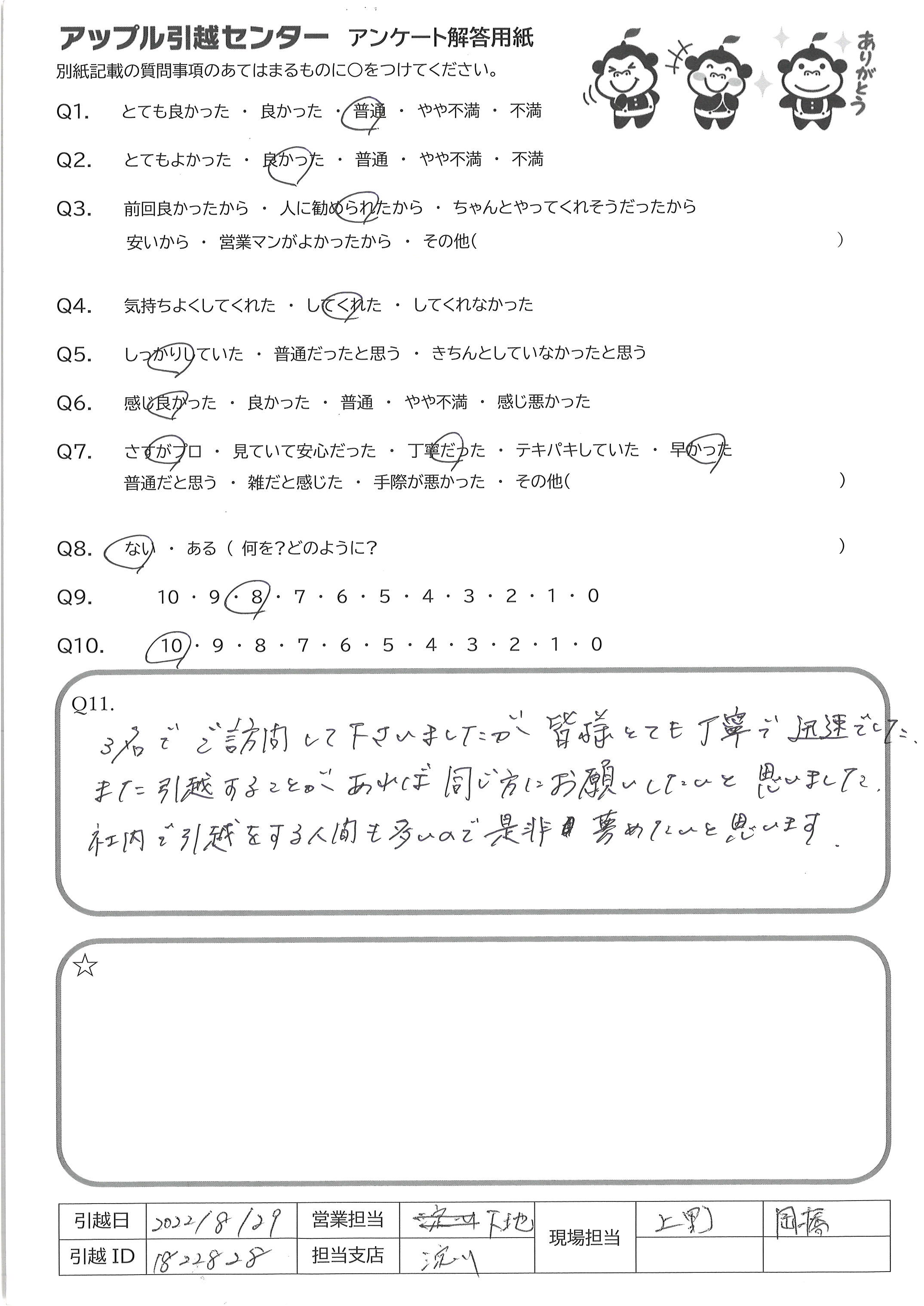 A.3名でご訪問して下さいましたが皆様とても丁寧で迅速でした。 また引っ越することがあれば同じ方にお願いしたいと思いました。 社内で引っ越しする人数も多いので是非お勧めしたいと思います。