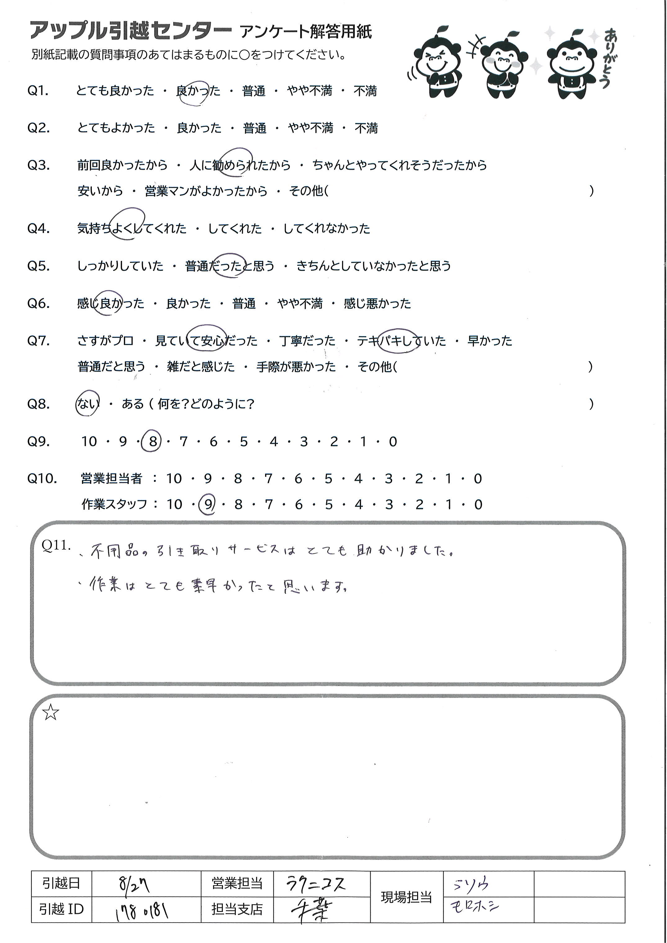 A.・不用品の引き取りのサービスはとても助かりました。 ・作業はとても素早かったと思います。