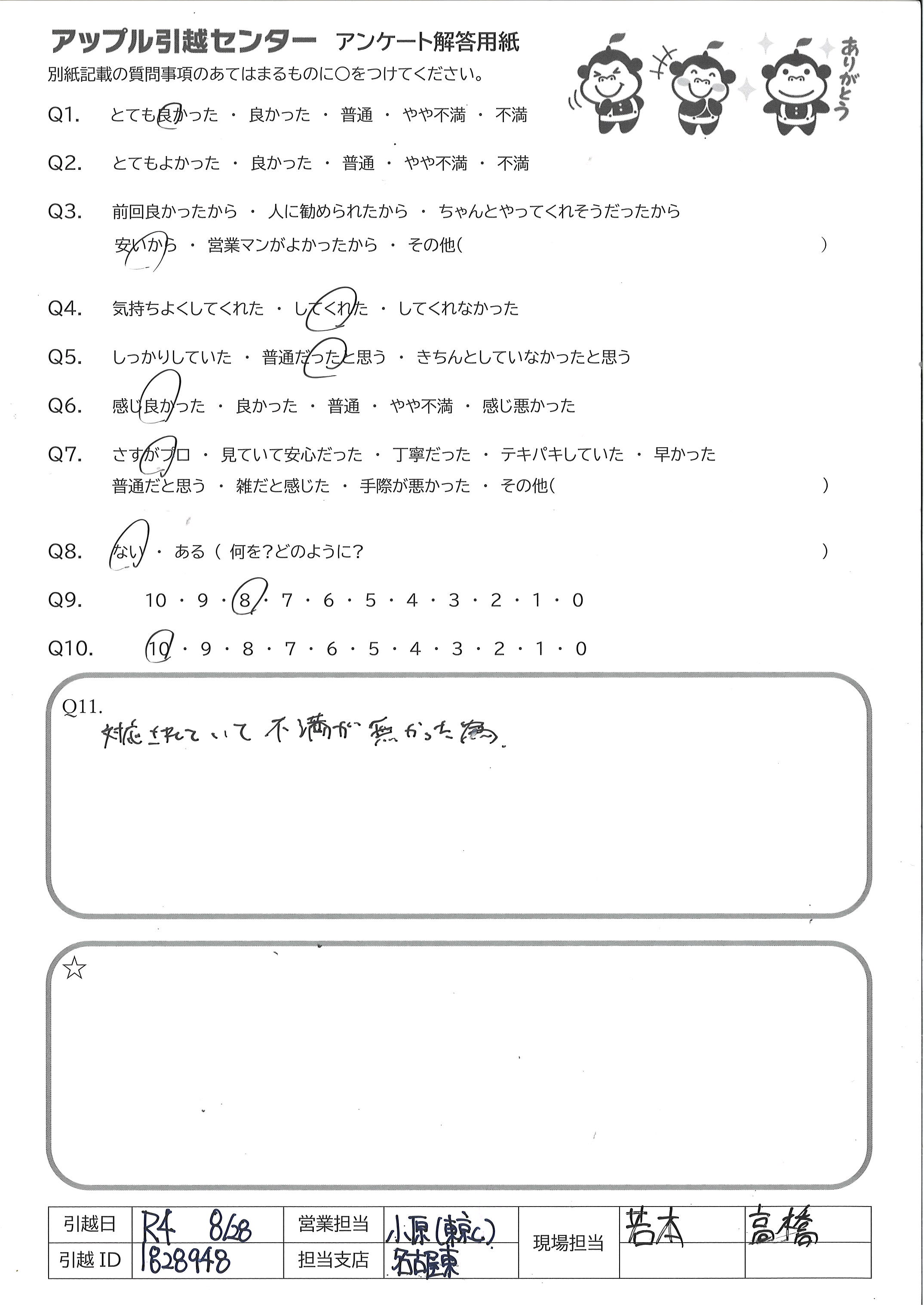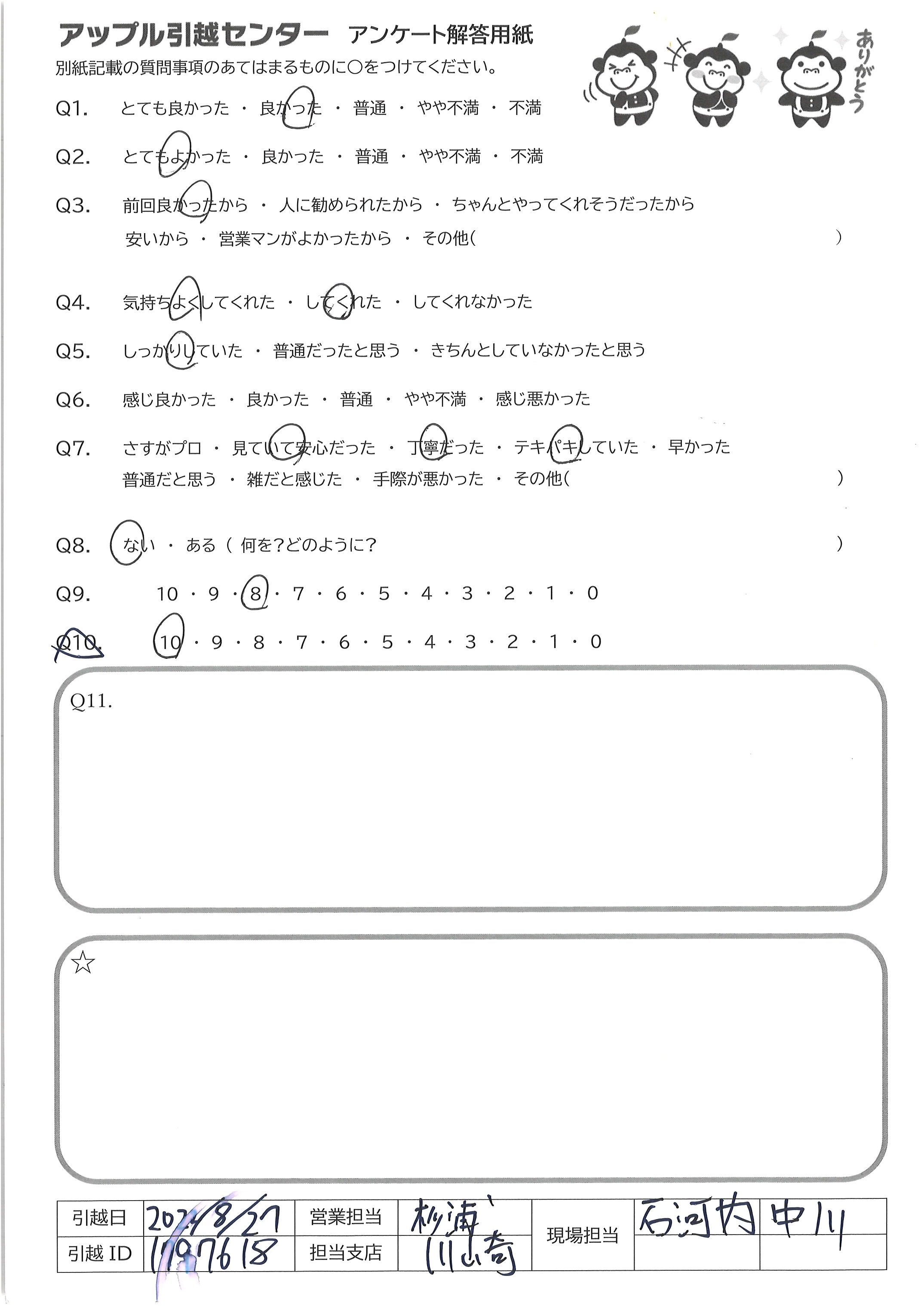 A.今回は大変お世話になりました。18年ぶりの引っ越しで、しかも単身で手順もよく分からないまま進めていました。何度もメールでやりとりしても丁寧に対応してくださり、引っ越し当日に来ていただいたスタッフの方もとてもいい方で安心して引っ越し作業に臨めました。とても印象に残ったのは主人の遺影をしまった段ボールを大切に扱う姿勢がとても素敵でした。小さな事ですが、当事者にとってはとても感動した出来事でした。ありがとうございました。 今後についてもしよろしければ、工程と段取りを大まかに目標でいいので、何時に荷物運び引っ越し先に何時到着、何時に終わる予定など、作業前に説明していただけたらそれに向けて作業しやすいと思いました。 また次回も引っ越しが決まりましたらよろしくお願いします。