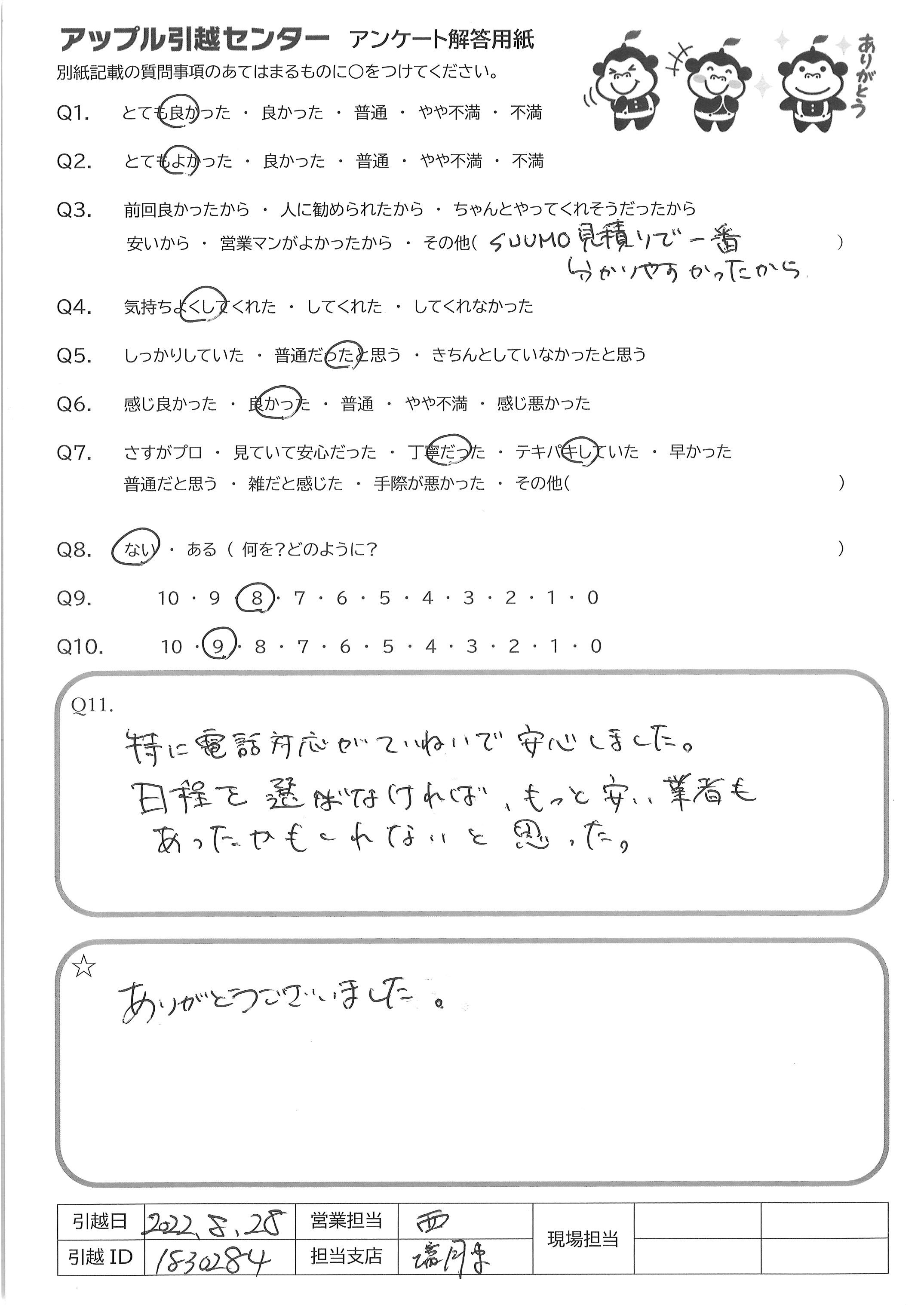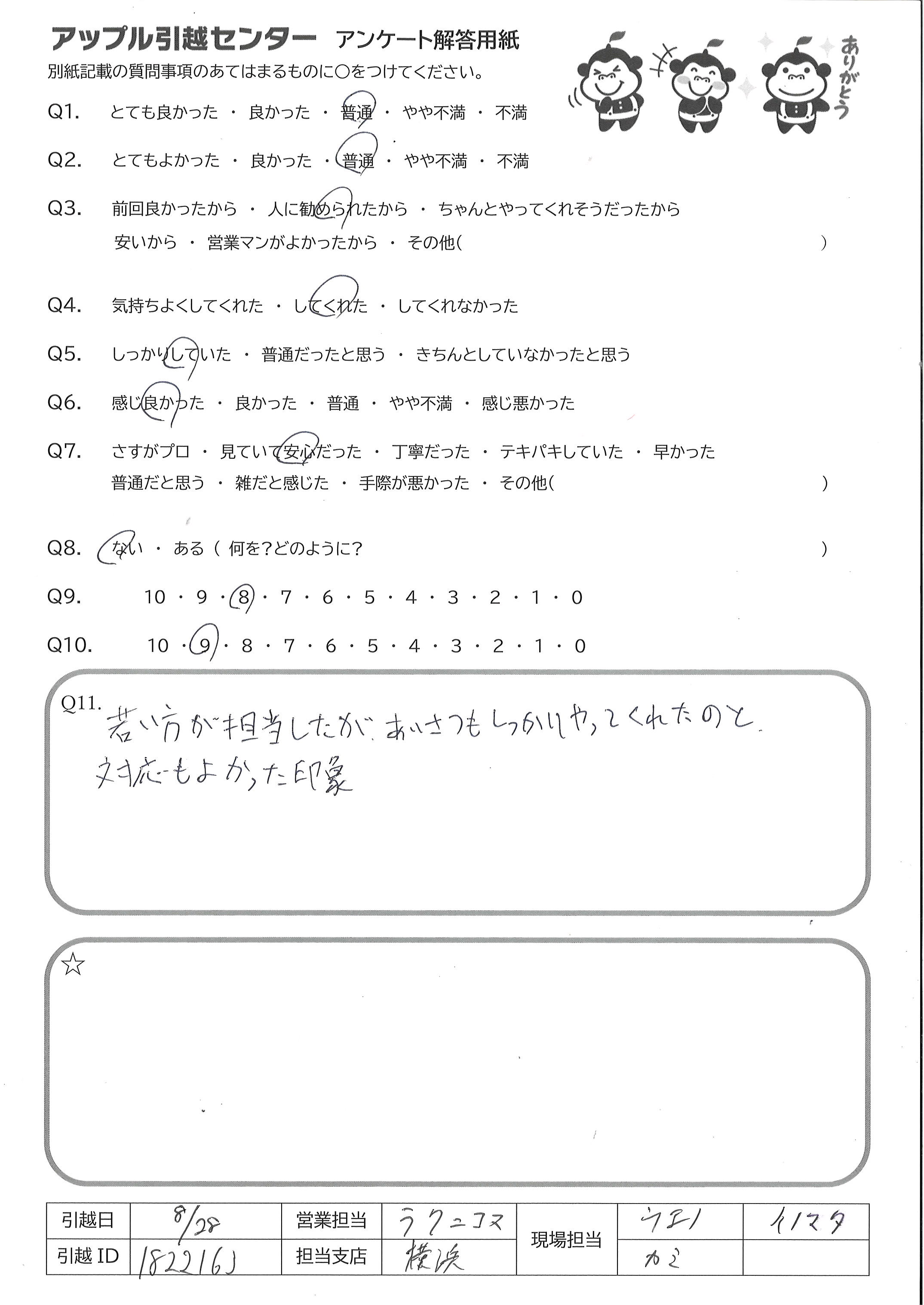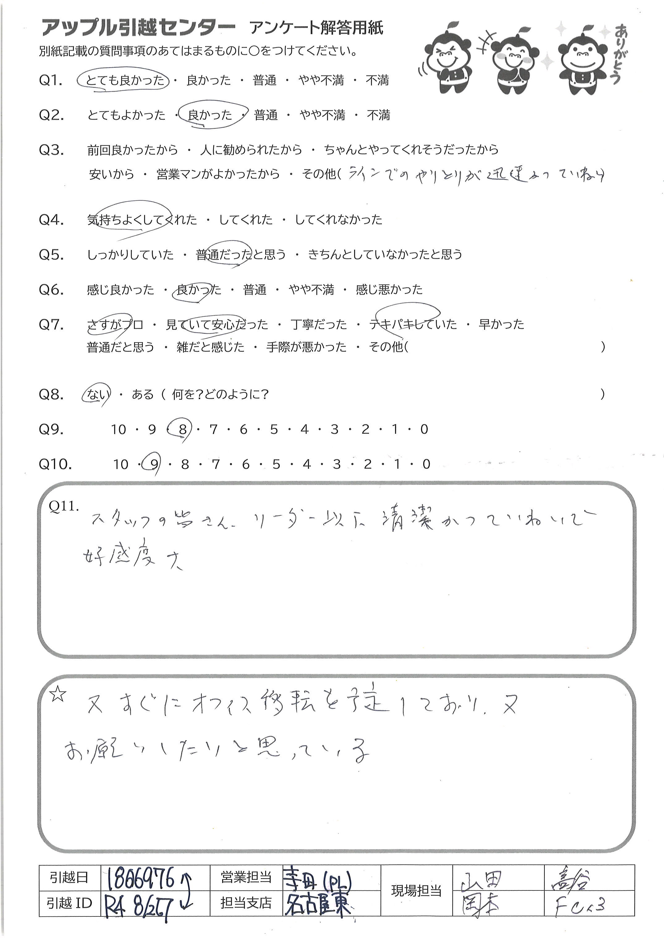 A.御見積り時にご対応頂いた営業担当の方がとても良かったです。訪問見積りも含めて複数社に御見積りを依頼しましたが、他社は金額提示の方法や接客態度に誠意を感じられず信用できませんでした。貴社はオンラインでも非常に丁寧なご説明を頂けましたので、ご提示料金は想定より高かったですが、気持ちよくお任せできると感じてお願いしました。 当日の作業スタッフの方も一生懸命やって頂いていたと思います。自分も含めてまた次の機会がありましたらまた検討させて頂きます。