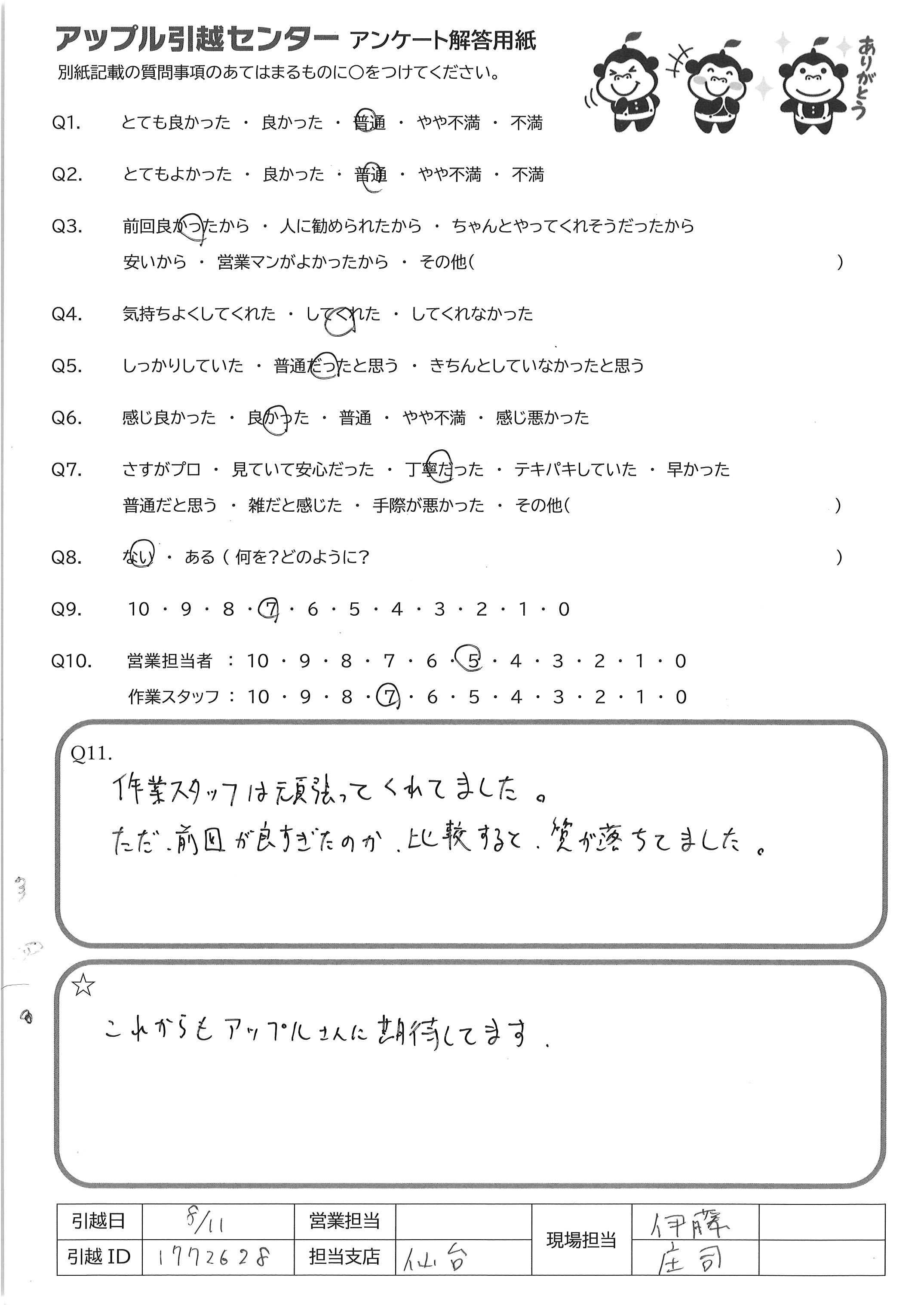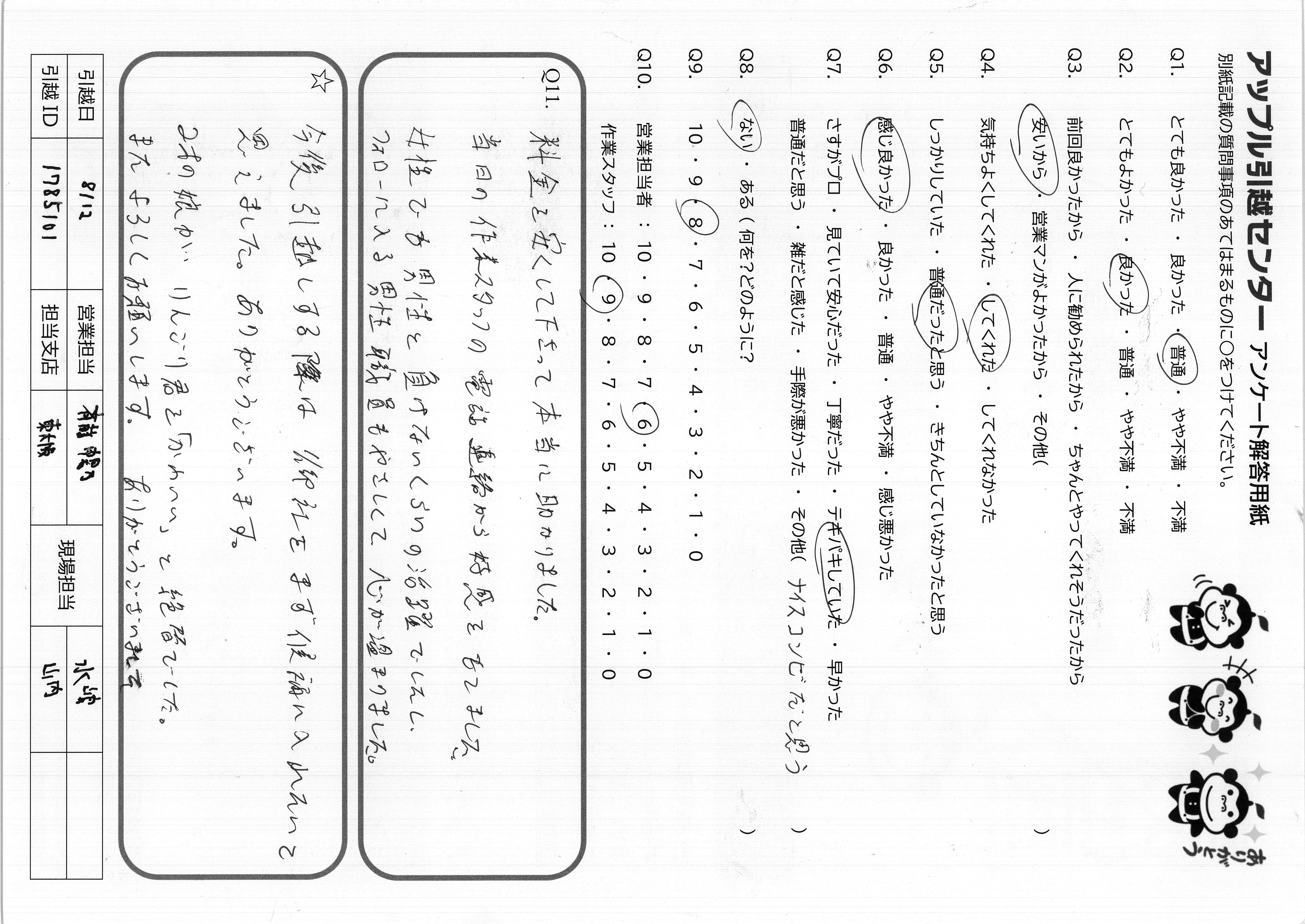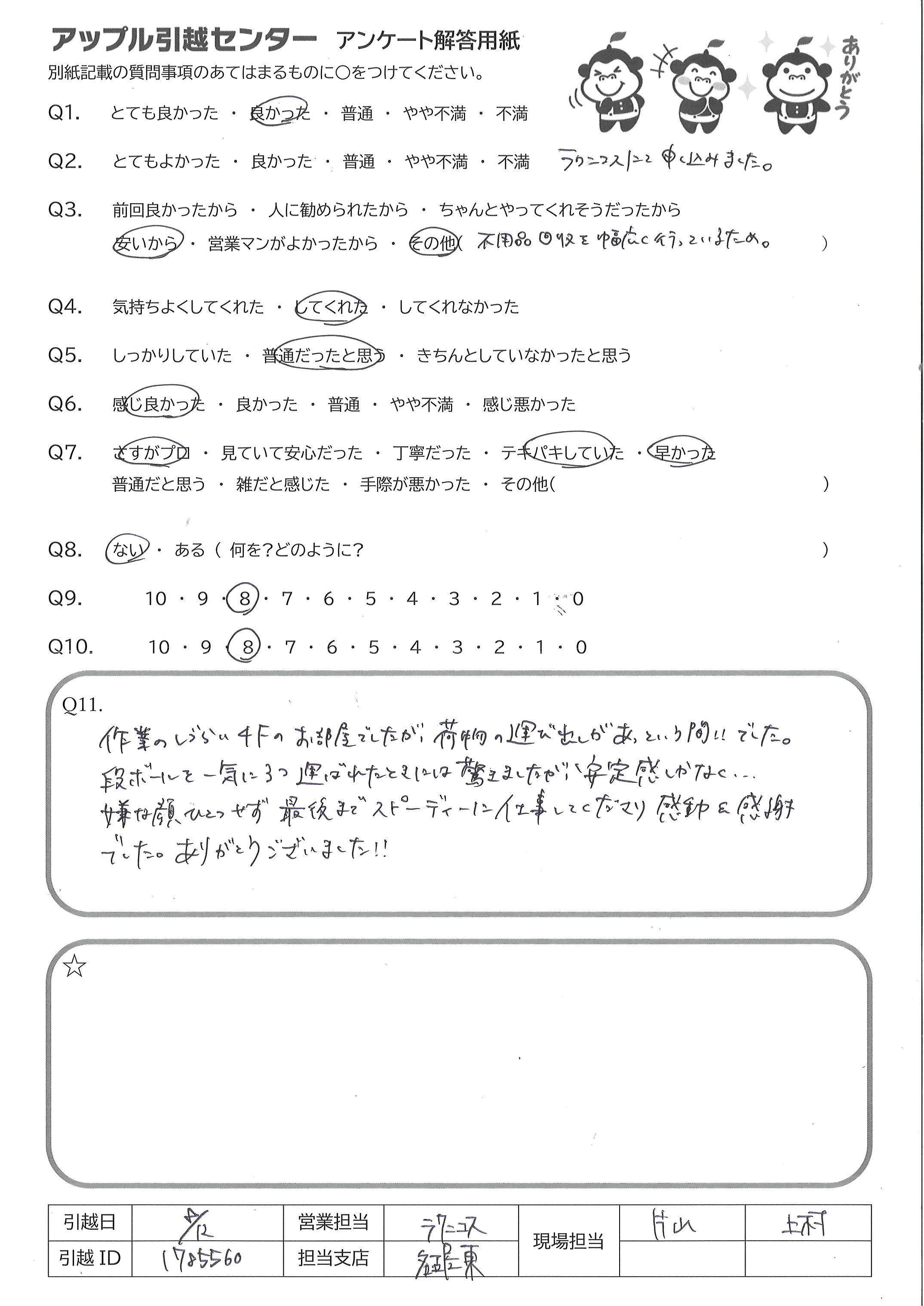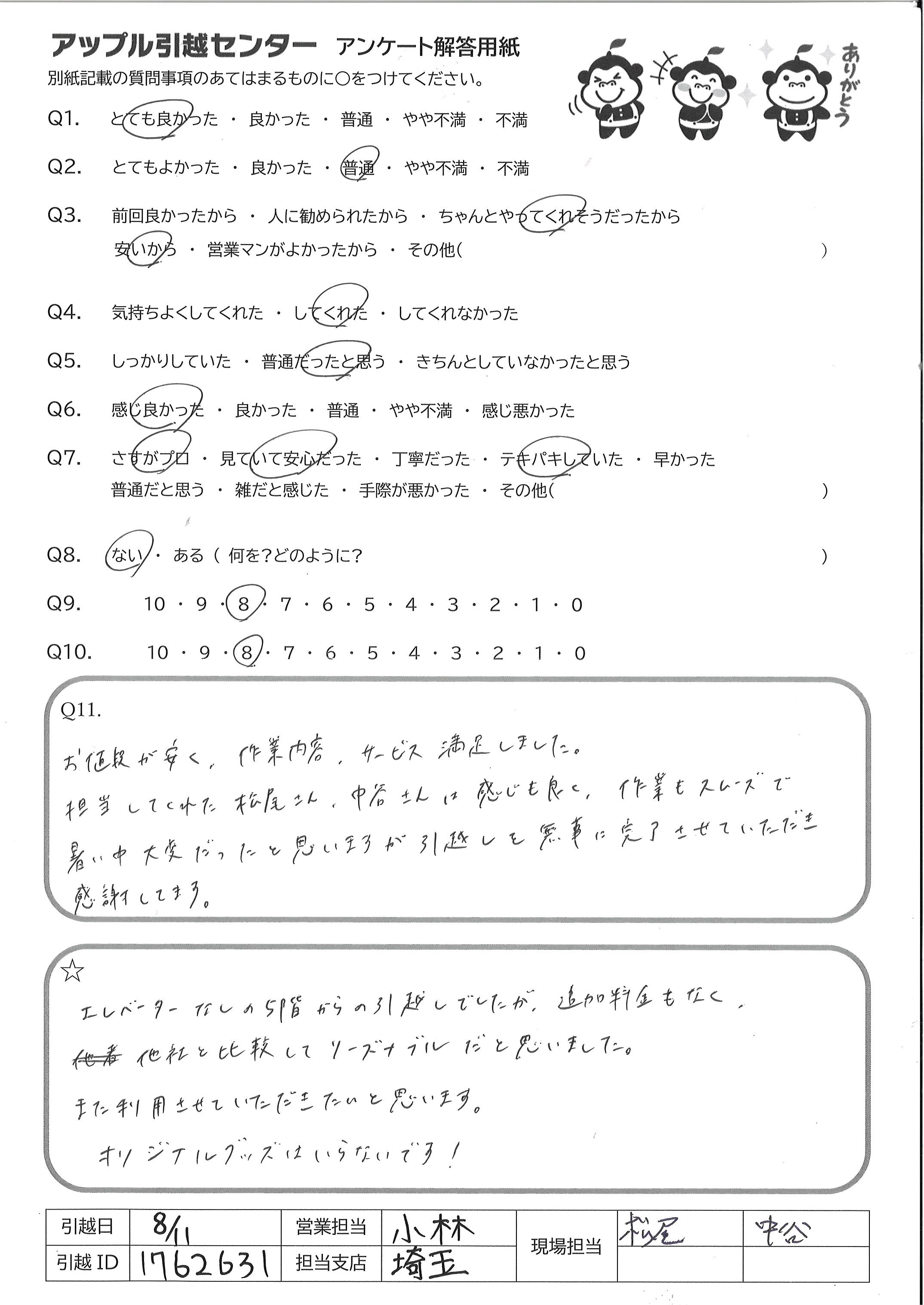 A.お値段が安く、作業内容、サービス満足しました 担当してくれた松尾さん、中谷さんは感じも良く、作業もスムーズで 暑い中、大変だったと思いますが、引越しを無事に完了させていただき 感謝してます。