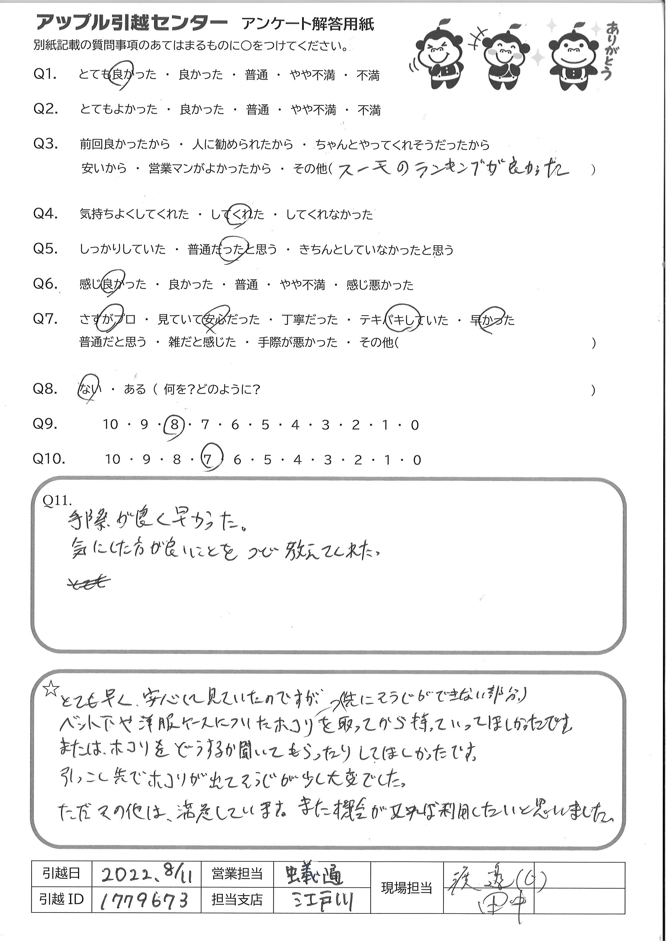 A.とても早く、安心してみていたのですが、 ベッド下や洋服ケースについたホコリを持っていってほしかったです またはホコリをどうするか聞いてもらったりしてほしかったです 引っこし先でホコリが出てそうじが少し大変でした ただその他は満足しています。また機会があれば利用したいと思いました