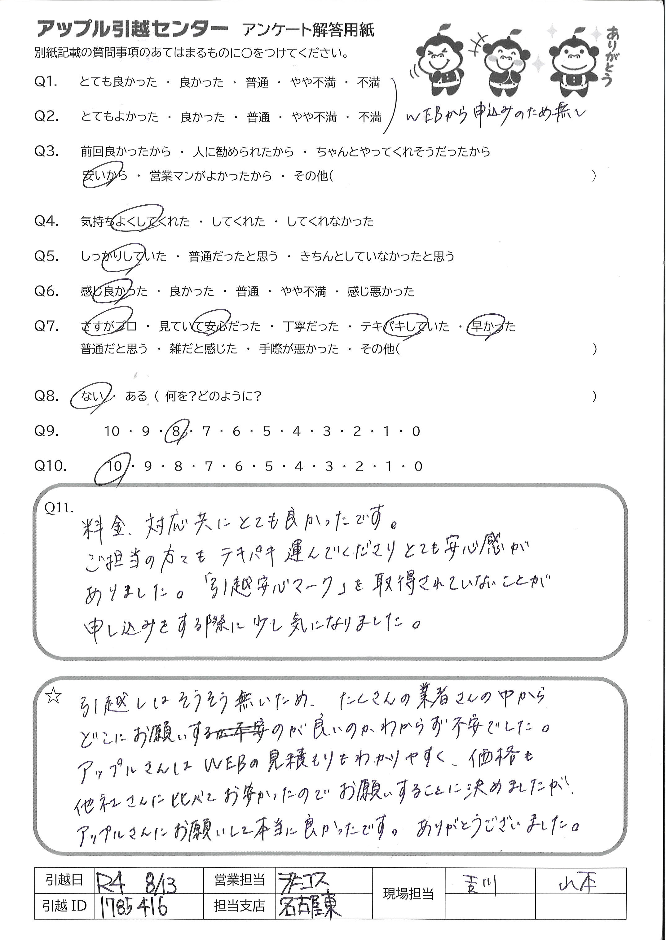 A.引越しはそうそう無いため、たくさんの業者さんの中からどこにお願いするのが良いのかわからず不安でした。 アップルさんはWEBでの見積もりもわかりやすく、価格も他社さんに比べてお安かったので、お願いすることに決めましたが、アップルさんにお願いして本当に良かったです。ありがとうございました。