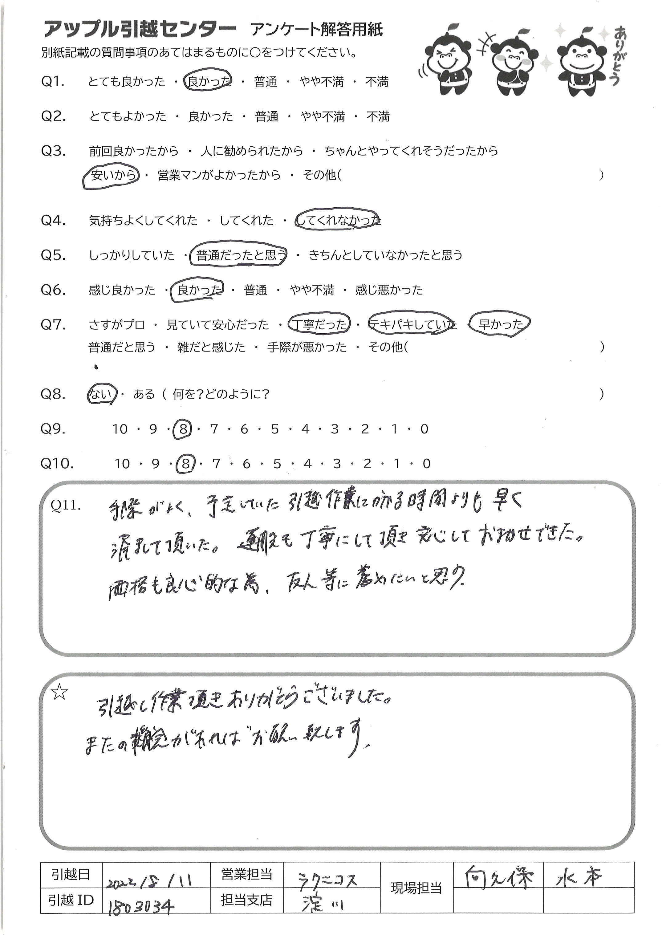 A.引越し作業頂き、ありがとうございました なたの機会があればお願い致します