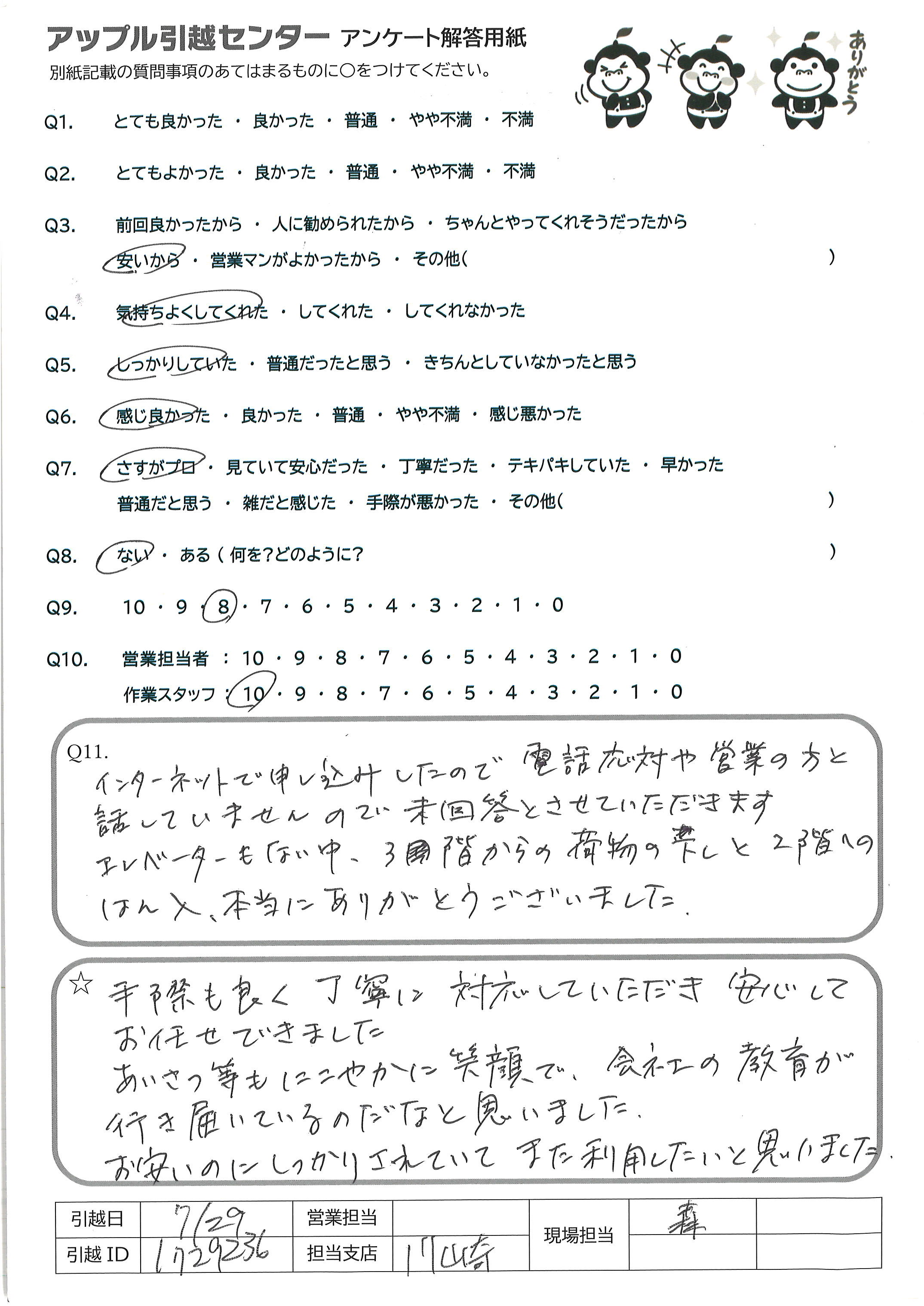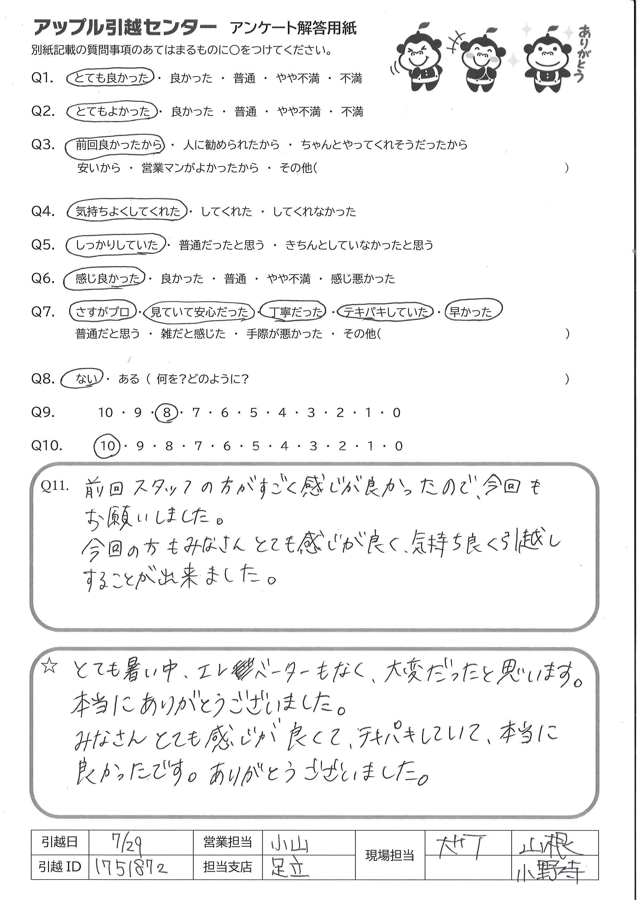 A.とても暑い中、エレベーターもなく、大変だったと思います 本当にありがとうございました みなさんとても感じが良くてテキパキしていて、本当に 良かったです。ありがうございました。