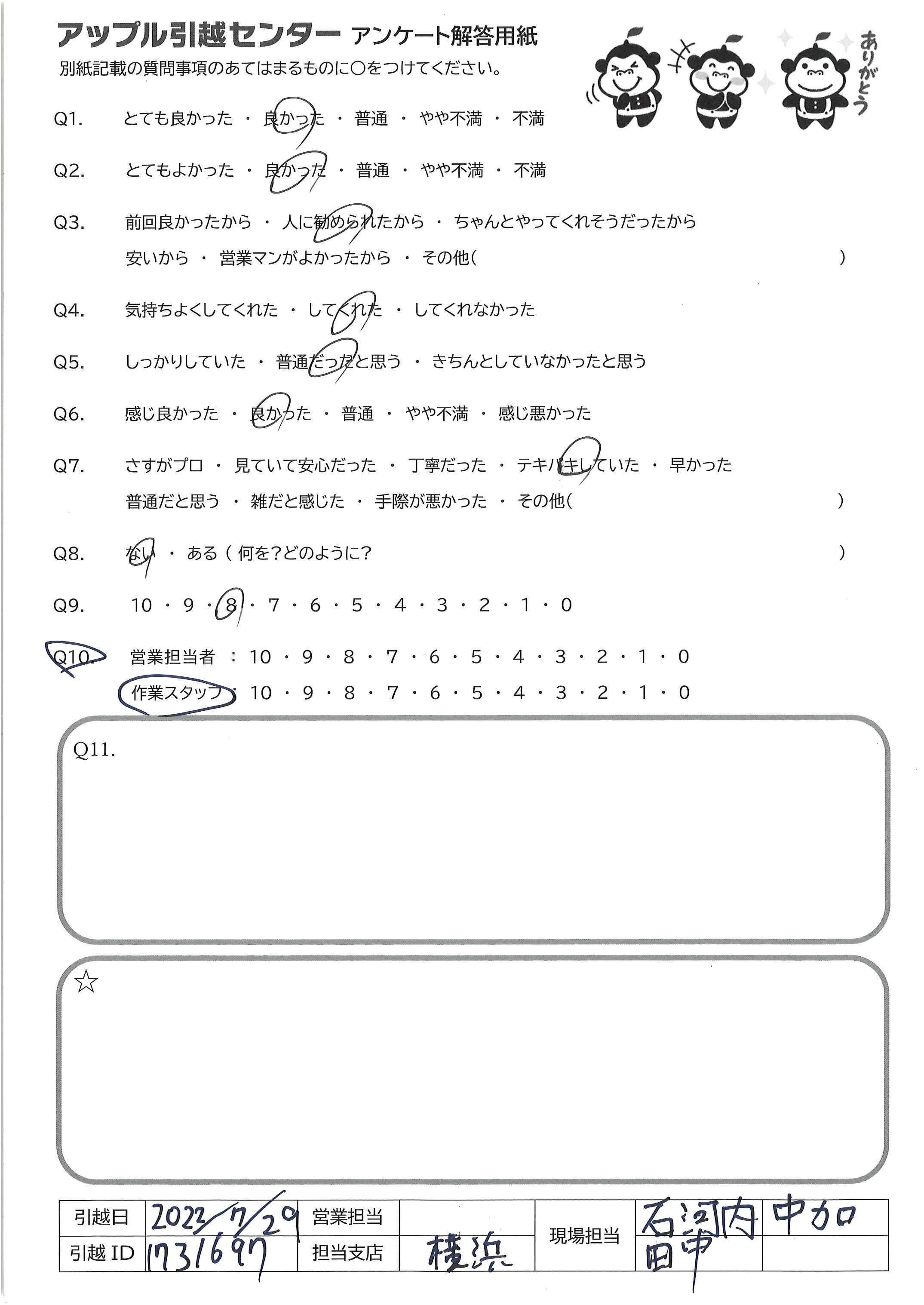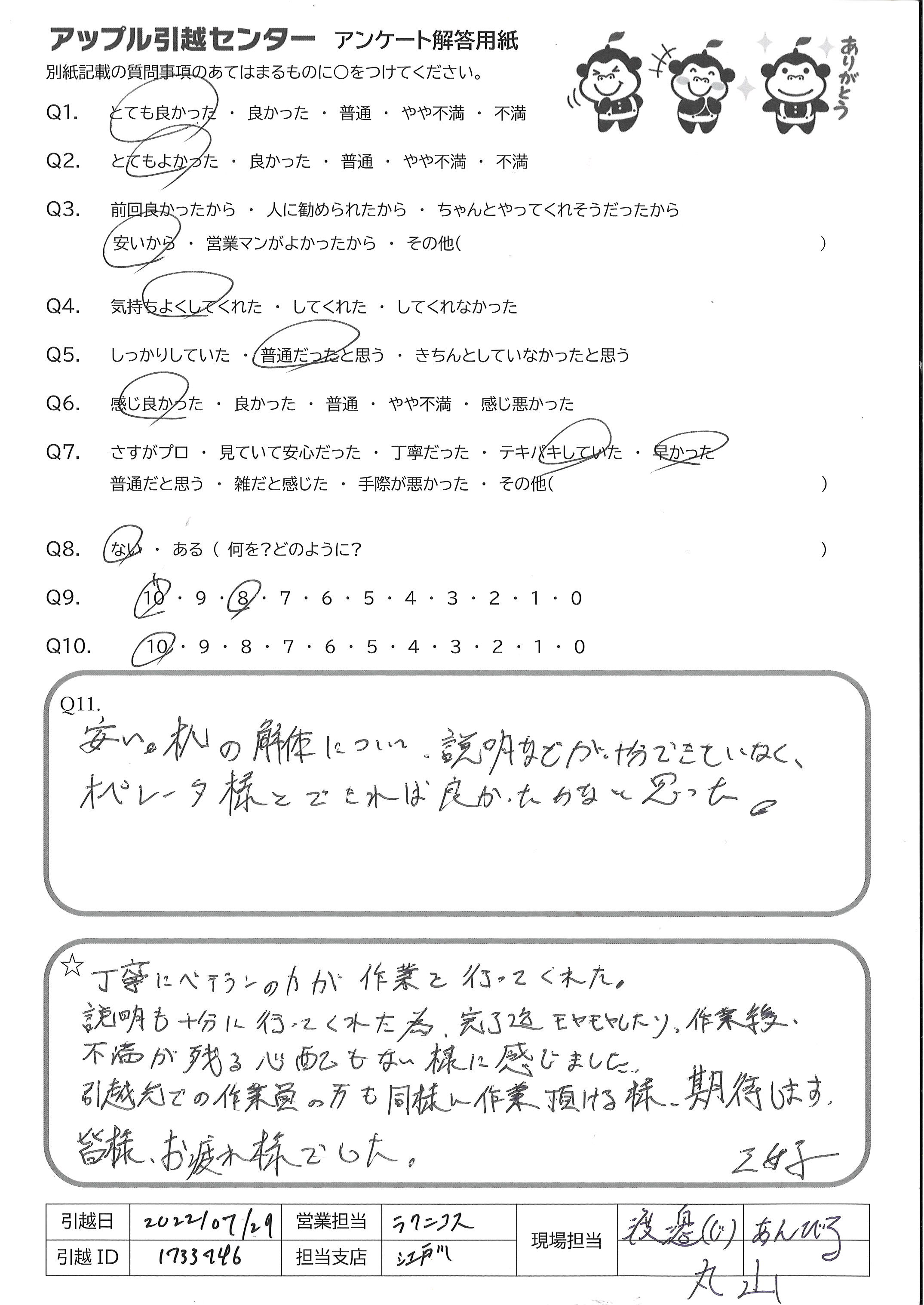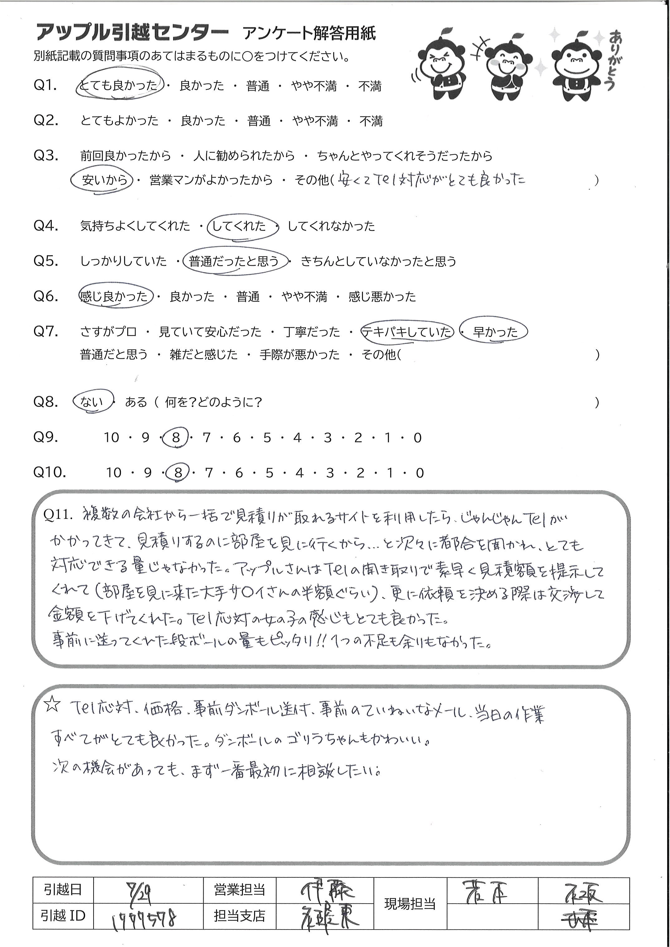 A.TEL対応、価格、事前ダンボール送付、事前の丁寧なメール、当日の作業 すべてがとても良かった。ダンボールのゴリラちゃんもかわいい 次の機会があっても、まず一番最初に相談したい