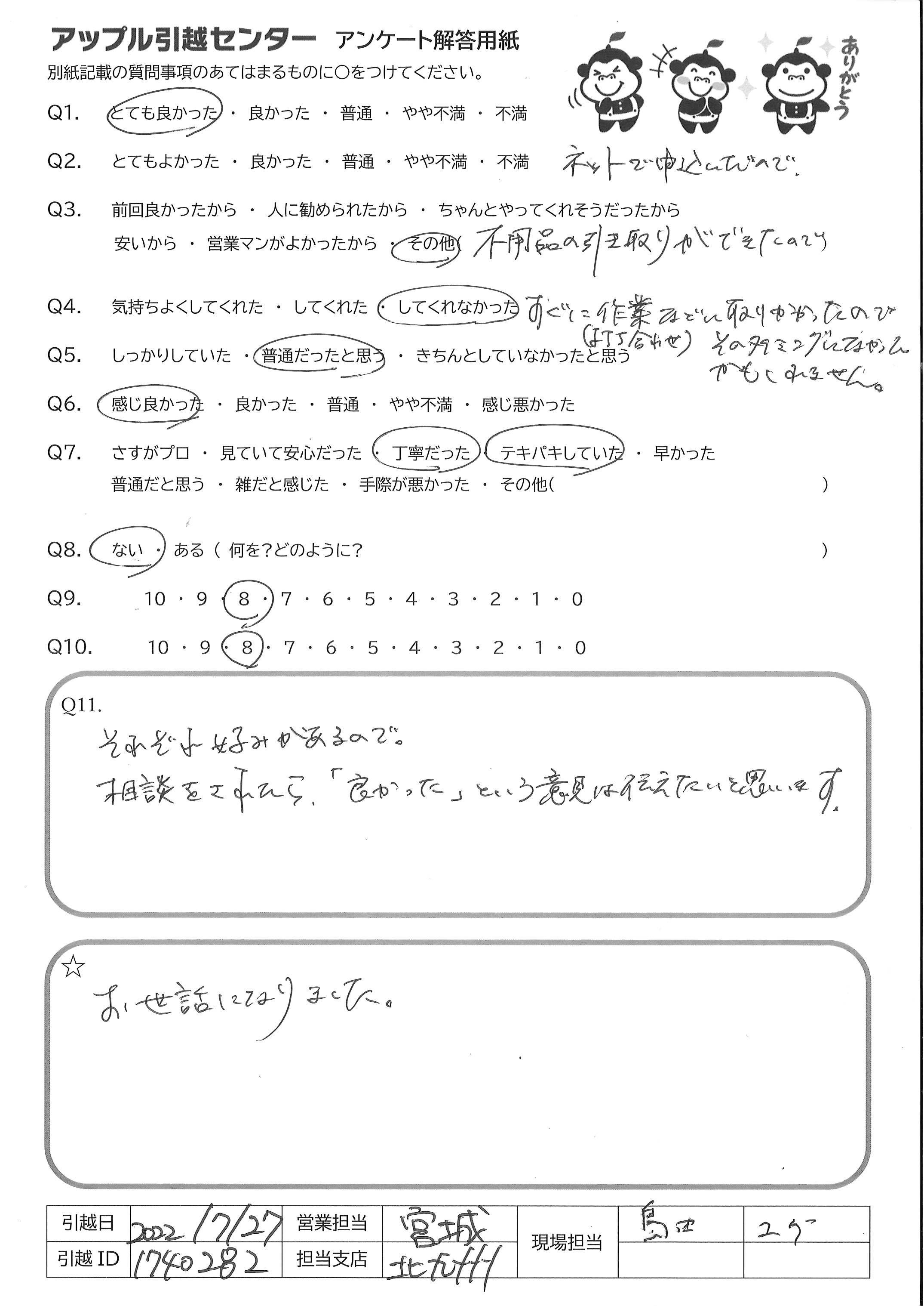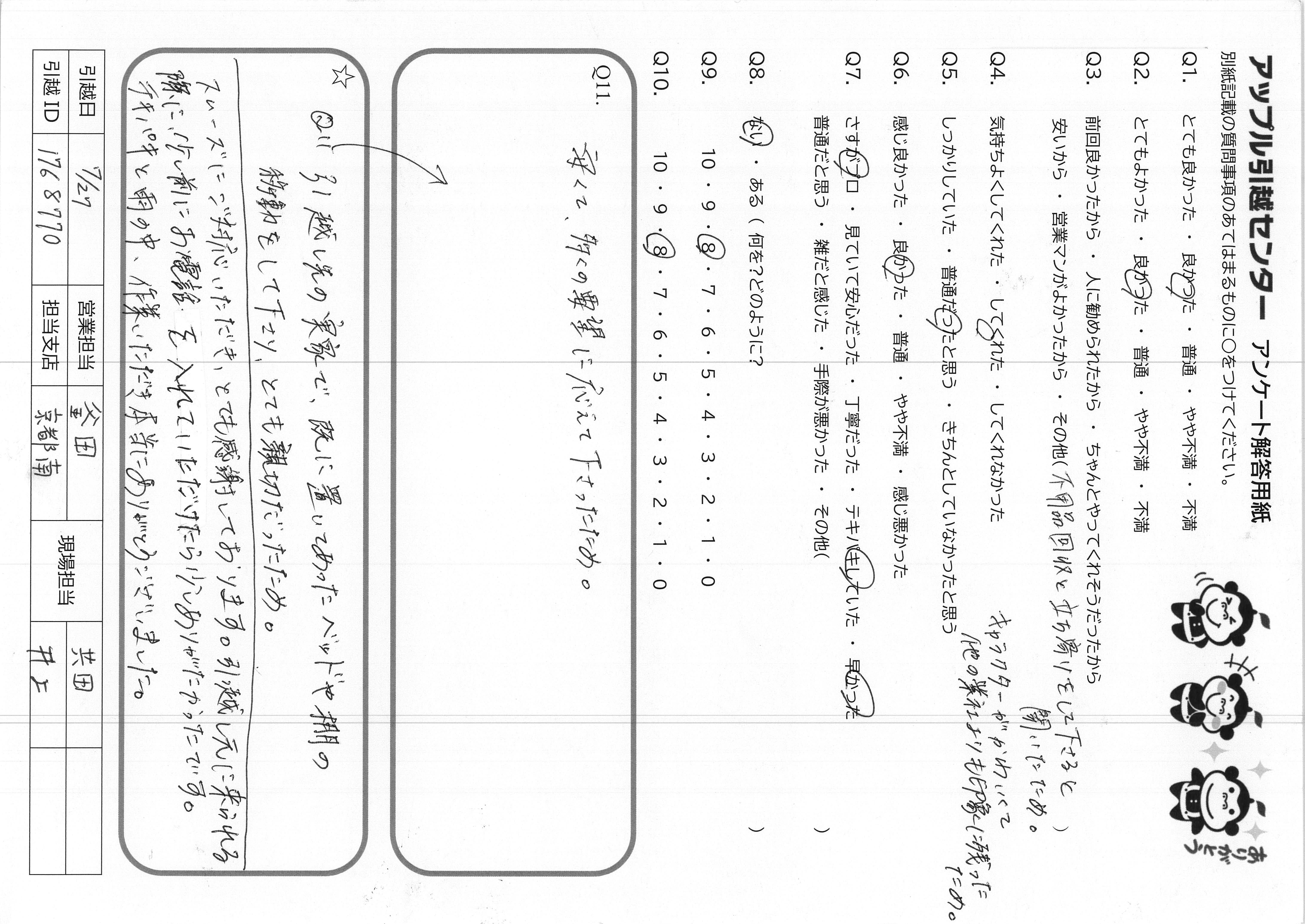 A.申込までの対応は返信がないや遅い、詳細の確認が必要であったが、他社よりは良い。 又見積もり金額が他社より正確であった。 引越作業内容は 親切、丁寧であり、今年度中に同住所を転居先とした引越をしますので、その際はお願いするかと思います。