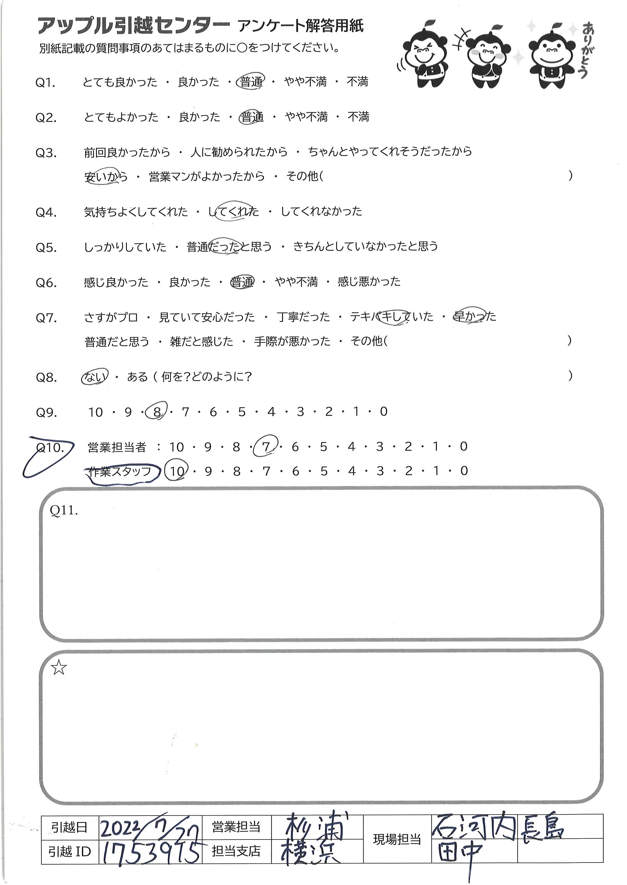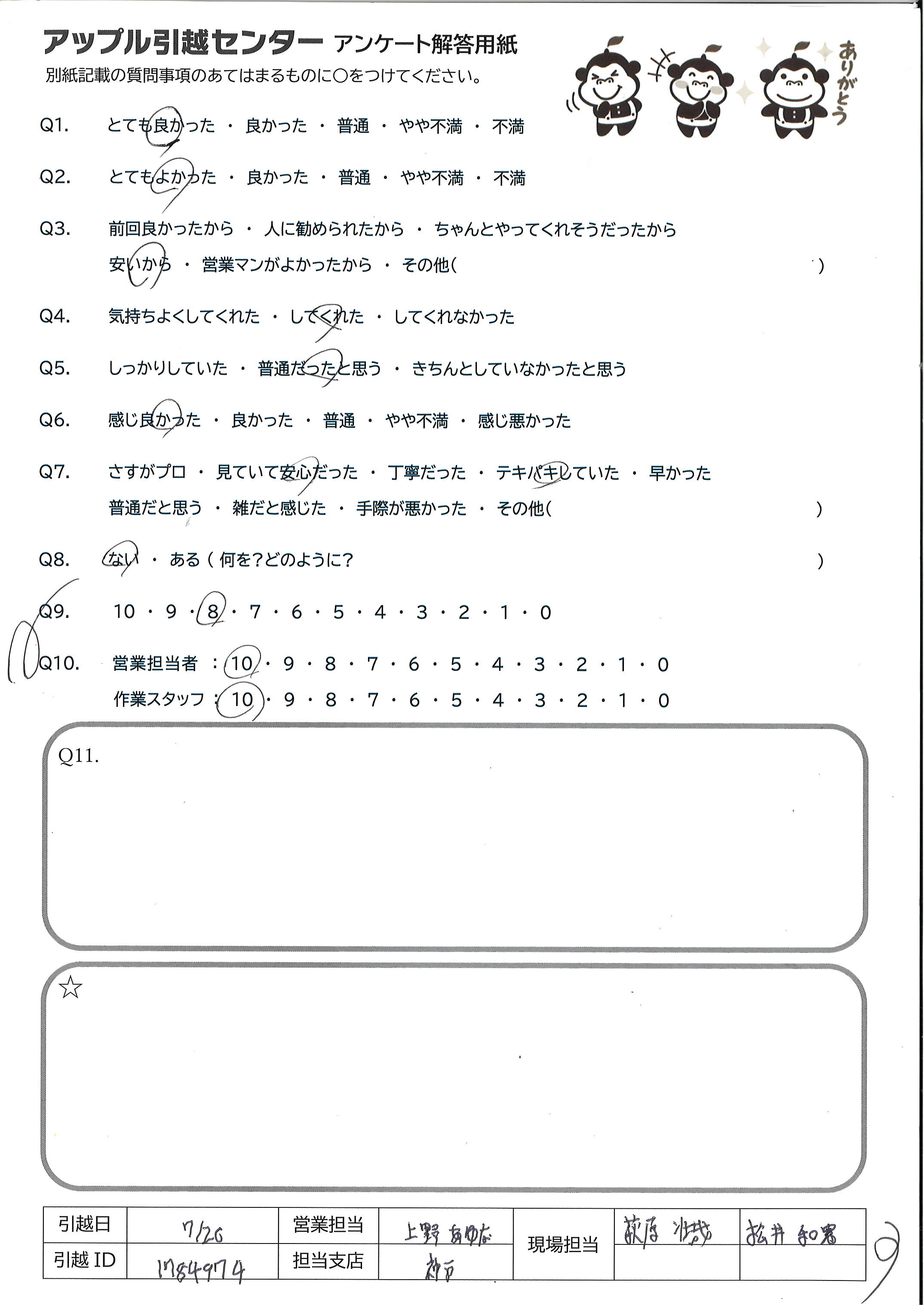 A.Q11 引っ越し先の実家で、既に置いてあったベットや棚の移動をして下さり、とても親切だったため。 スムーズにご対応いただき、とても感謝しております。引っ越し元に来られる際に、少し前にお電話をいれていただけたら少しありがたかったです。テキパキ雨の中、作業いただき本当にありがとうございました。