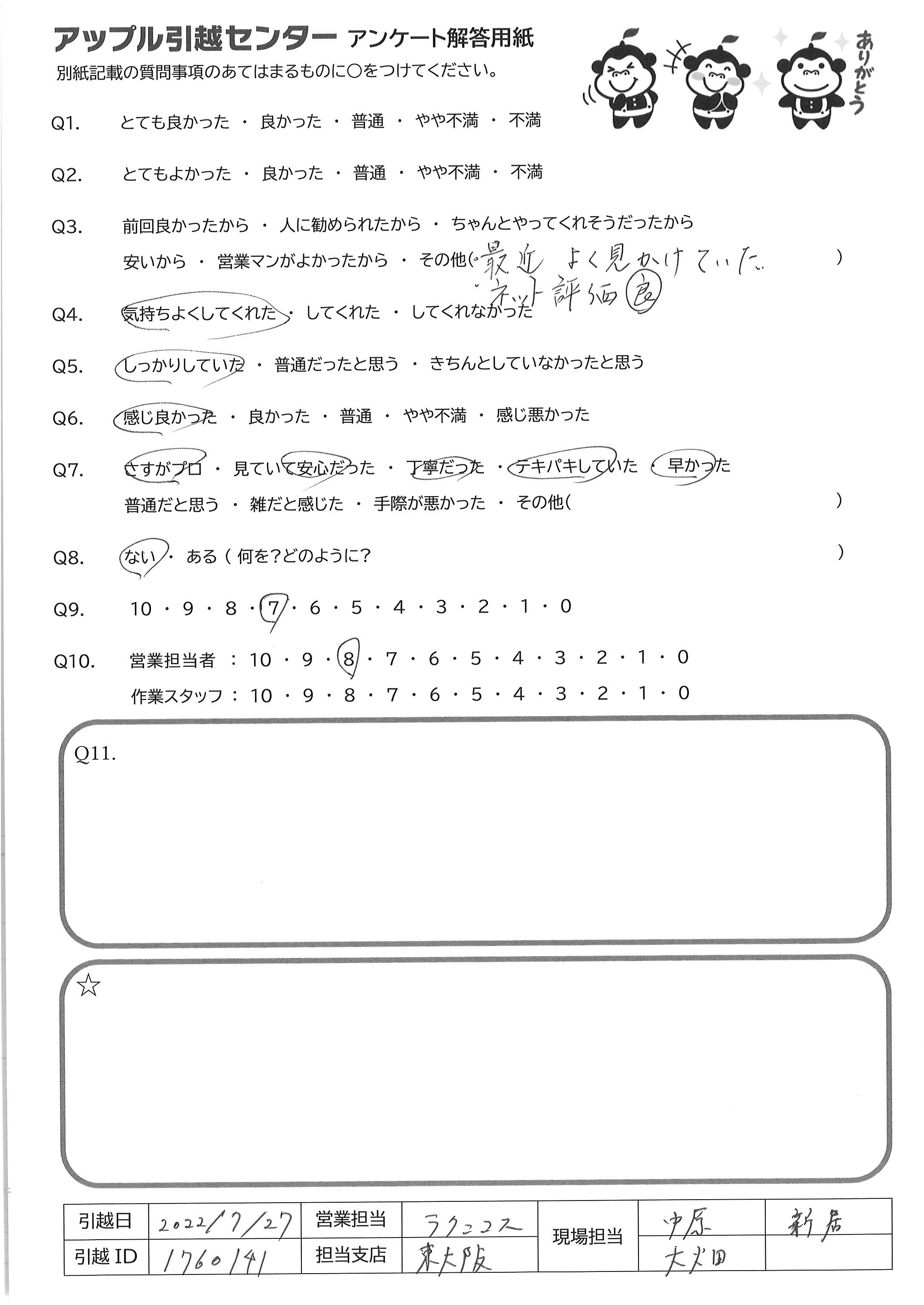 引越し日:2022年07月26日 エリア:大阪府大阪市東成区