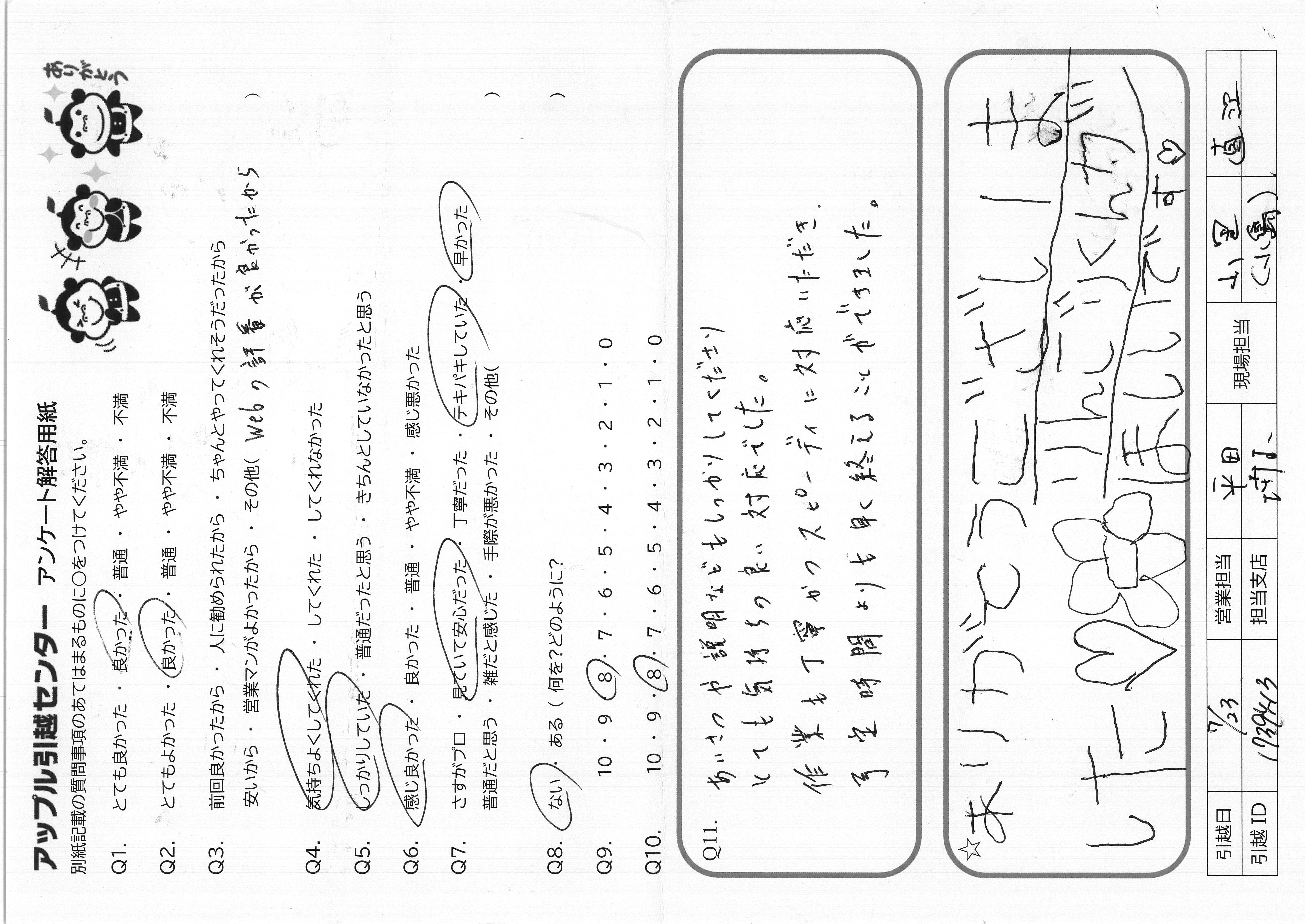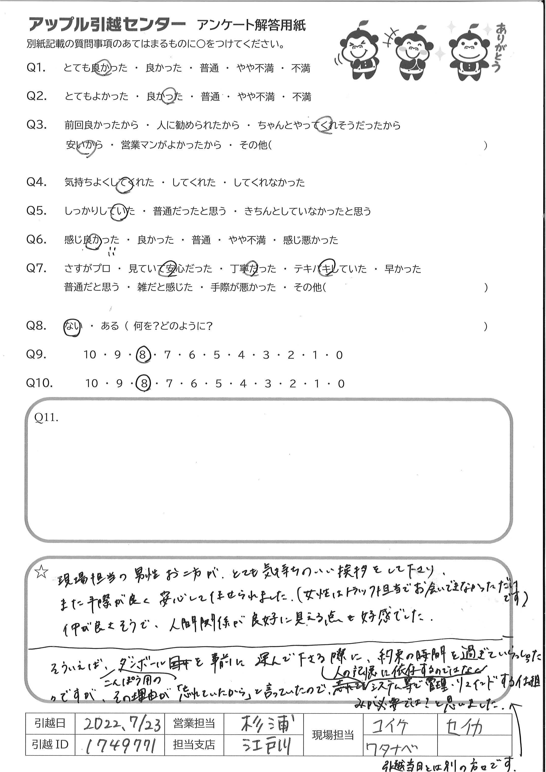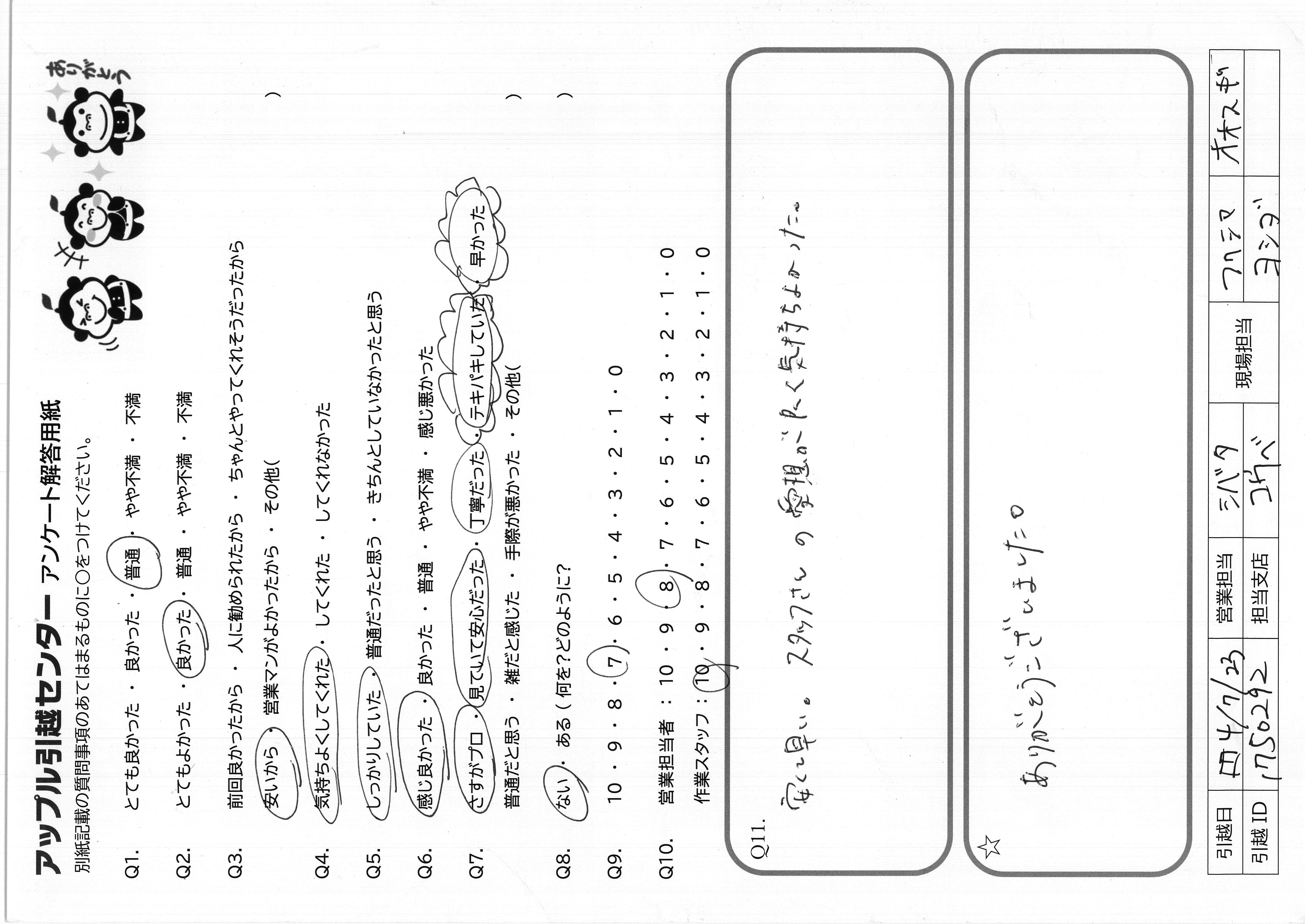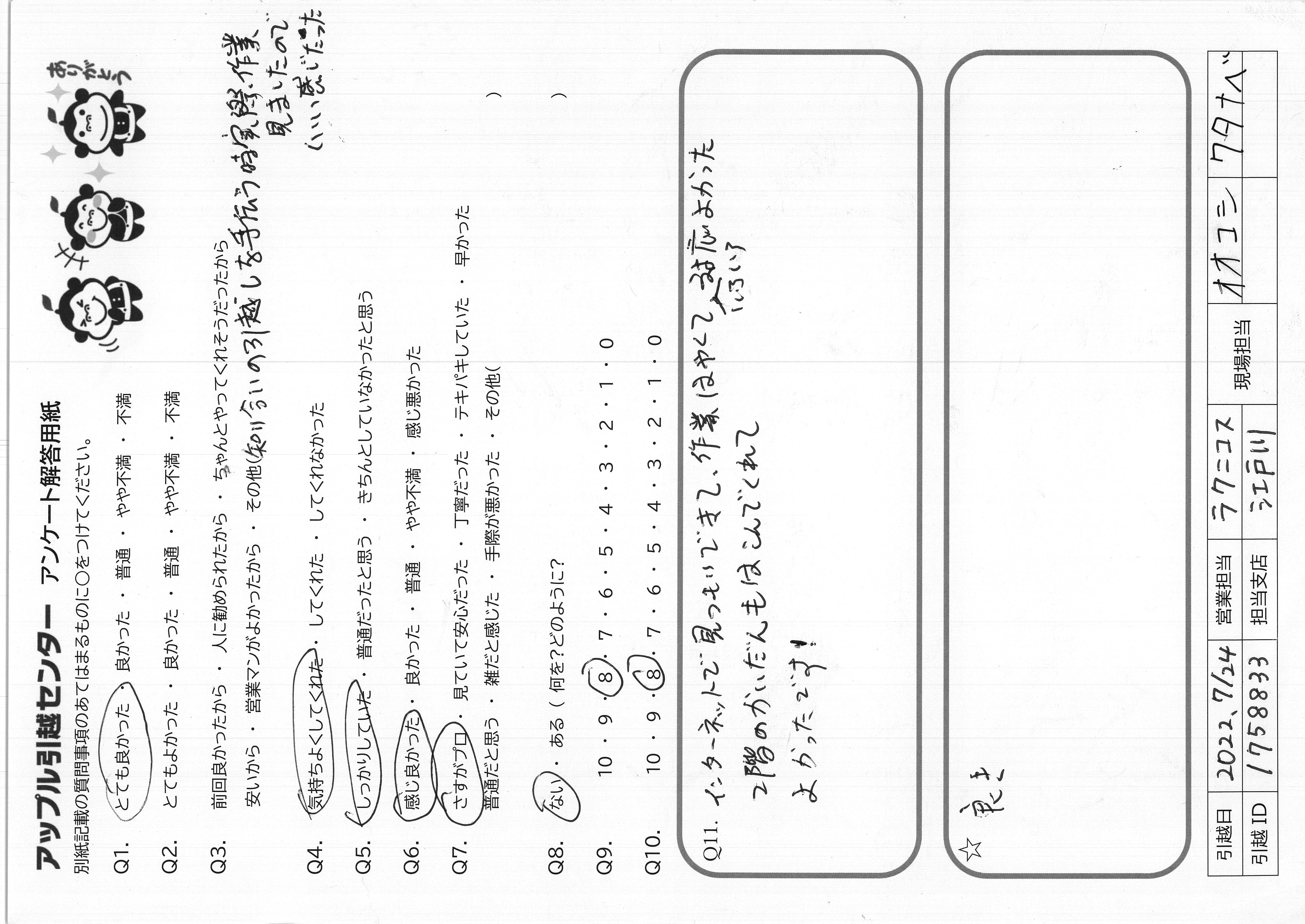 A.現場担当の男性お二方が、とても気持ちのいい挨拶をして下さり なた手際が良く安心して任せられました。(女性はトラック担当でお会いできなかったです) 仲が良さそうで、人間関係が良好に見える点も好感でした そういえば、こんぽう用のダンボールを事前に運んで下さる際に、約束の時間を過ぎて いらっしゃったのですが、その理由が「忘れていたから」と言っていたので、人の記憶に依頼するのではなシステム等で、管理、リマインドする仕組みが必要では?と思いました