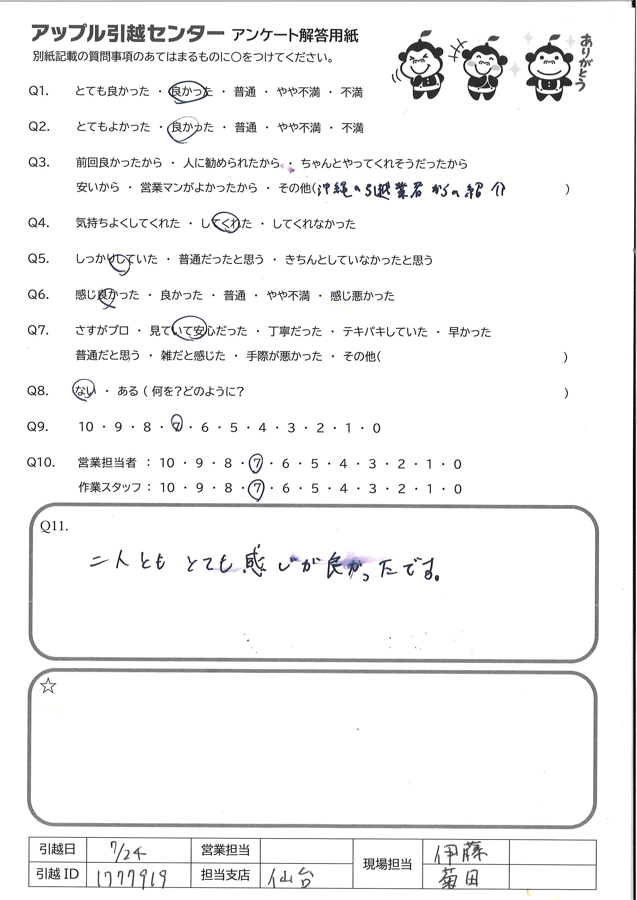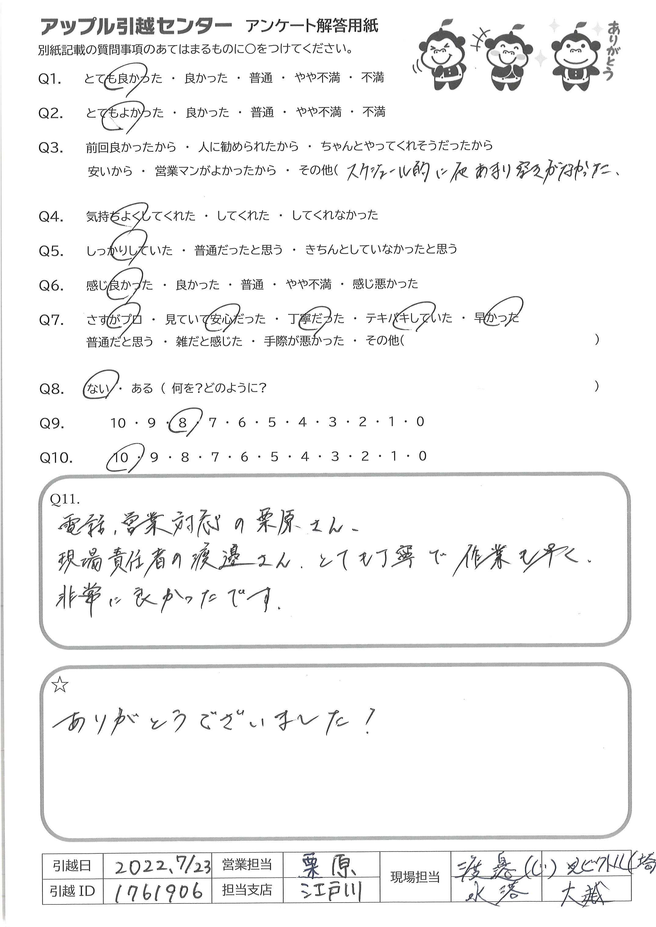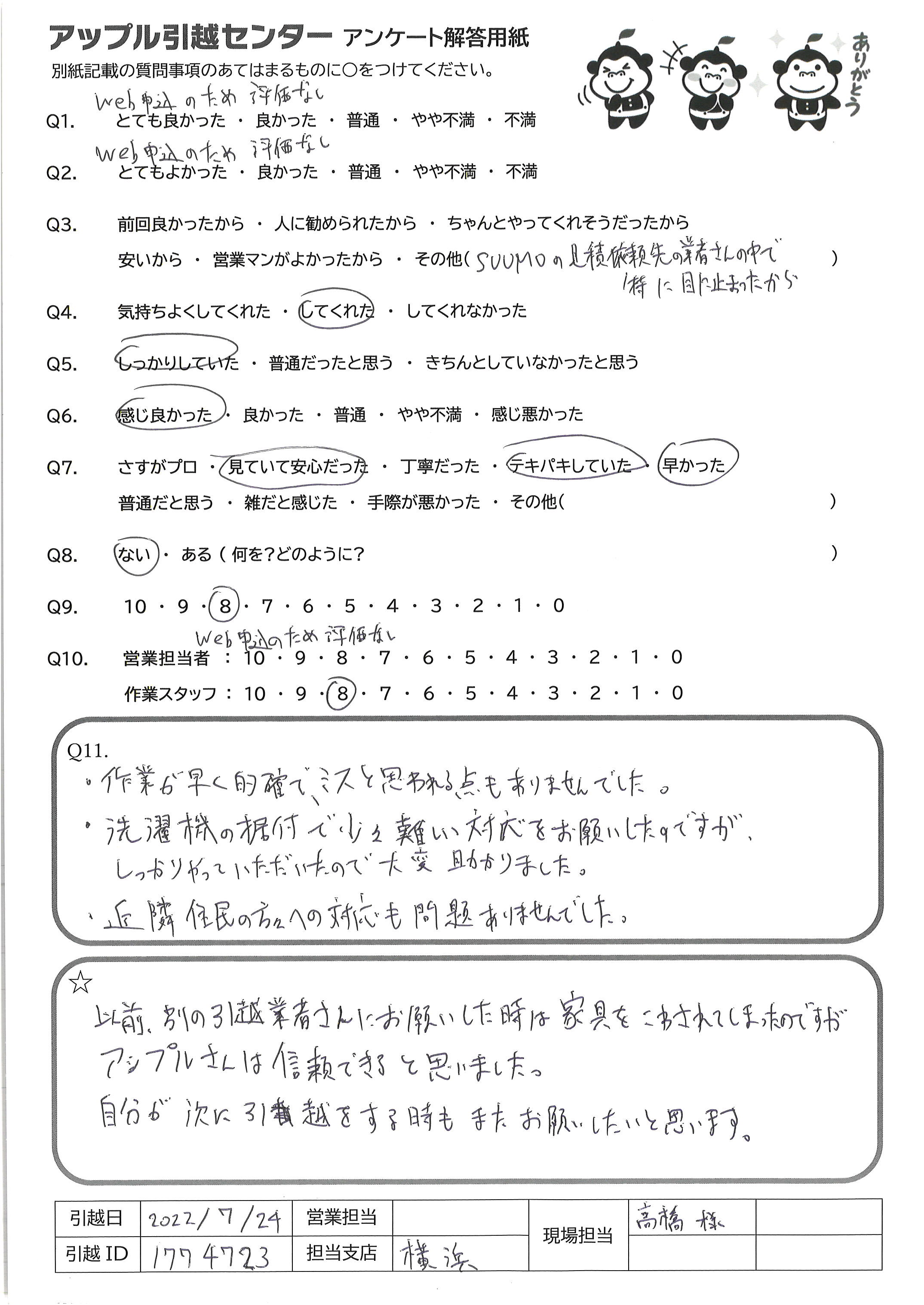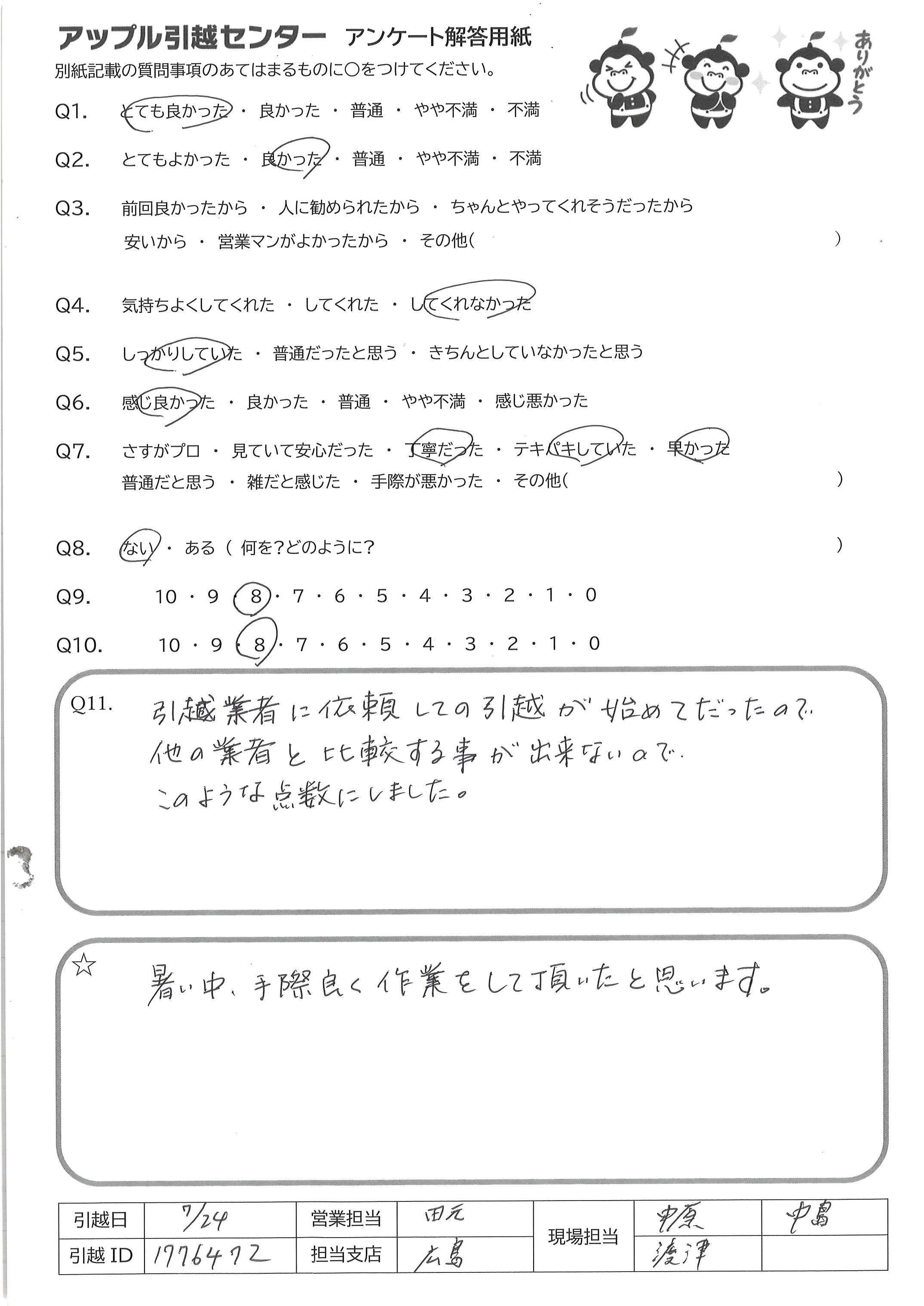A.現場担当の男性お二方が、とても気持ちのいい挨拶をして下さり なた手際が良く安心して任せられました。(女性はトラック担当でお会いできなかったです) 仲が良さそうで、人間関係が良好に見える点も好感でした そういえば、こんぽう用のダンボールを事前に運んで下さる際に、約束の時間を過ぎて いらっしゃったのですが、その理由が「忘れていたから」と言っていたので、人の記憶に依頼するのではなシステム等で、管理、リマインドする仕組みが必要では?と思いました