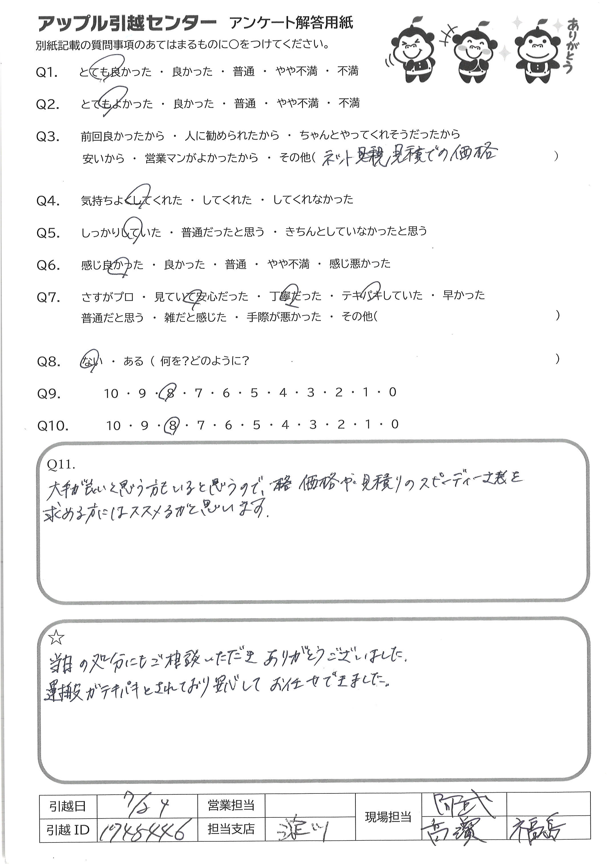 A.以前別の引越業者さんにお願いした時は家具をこわされてしまったのですが アップルさんは信頼できると思いました 自分が次に引越をする時もまたお願いしたいと思います