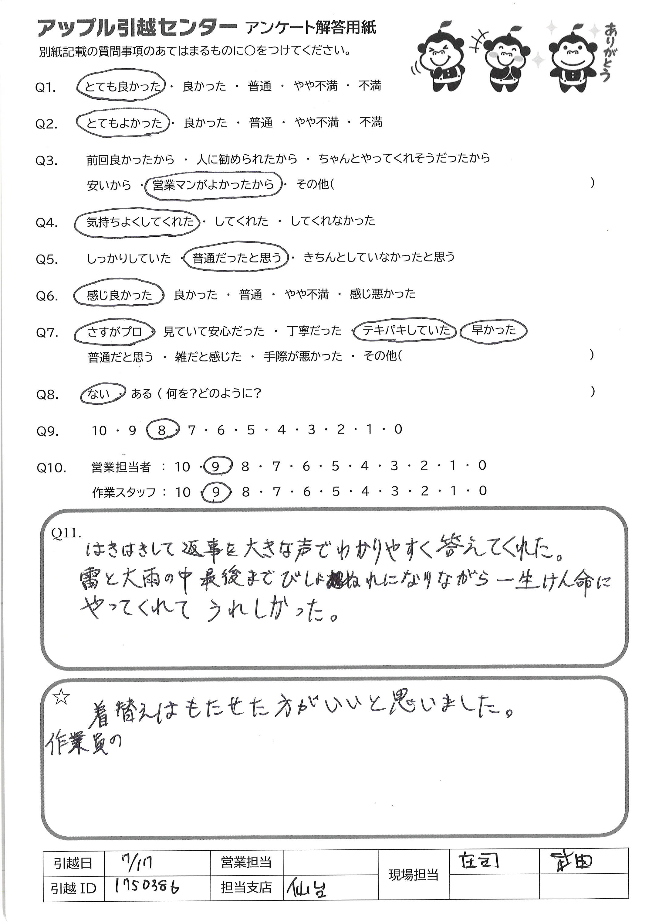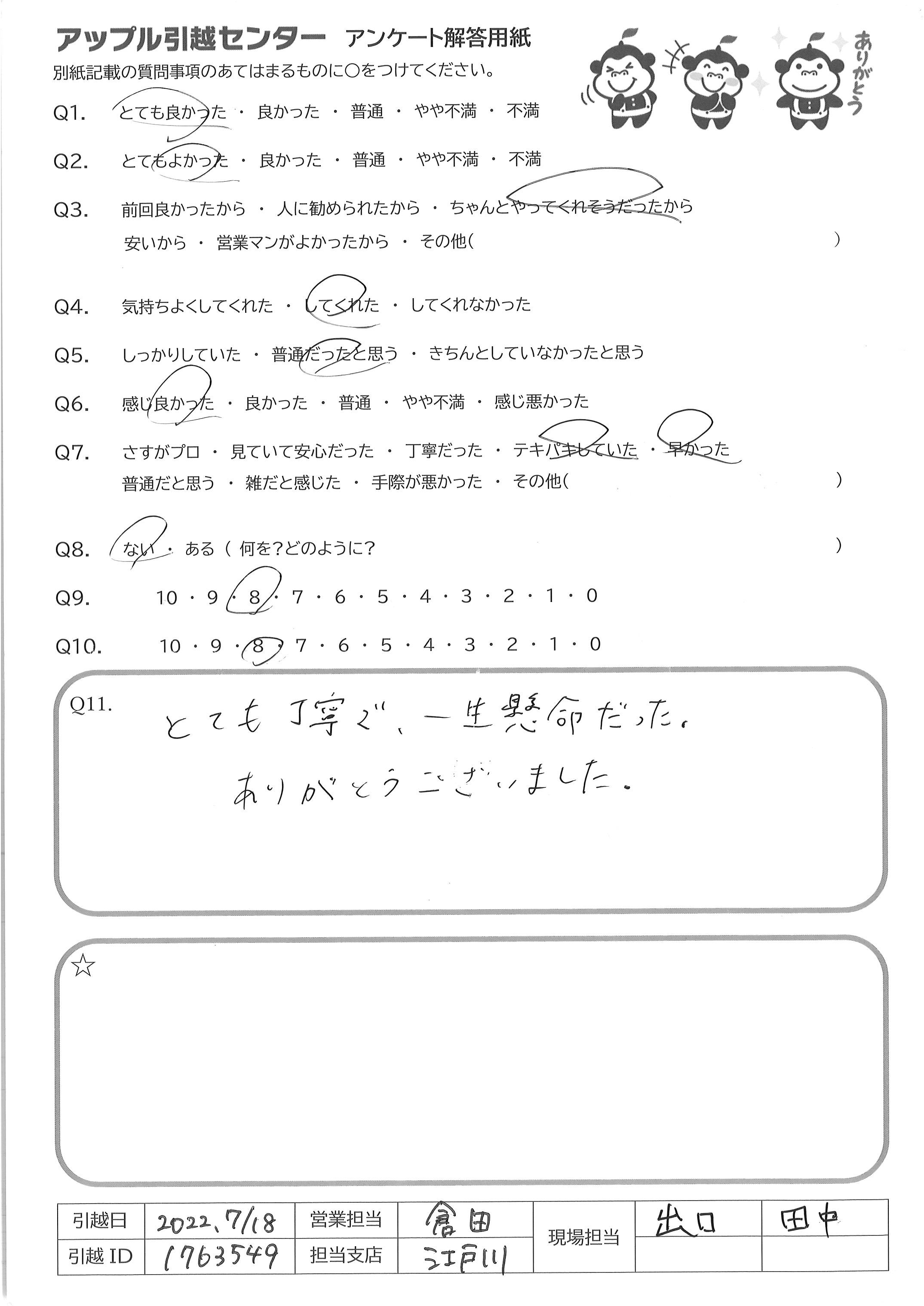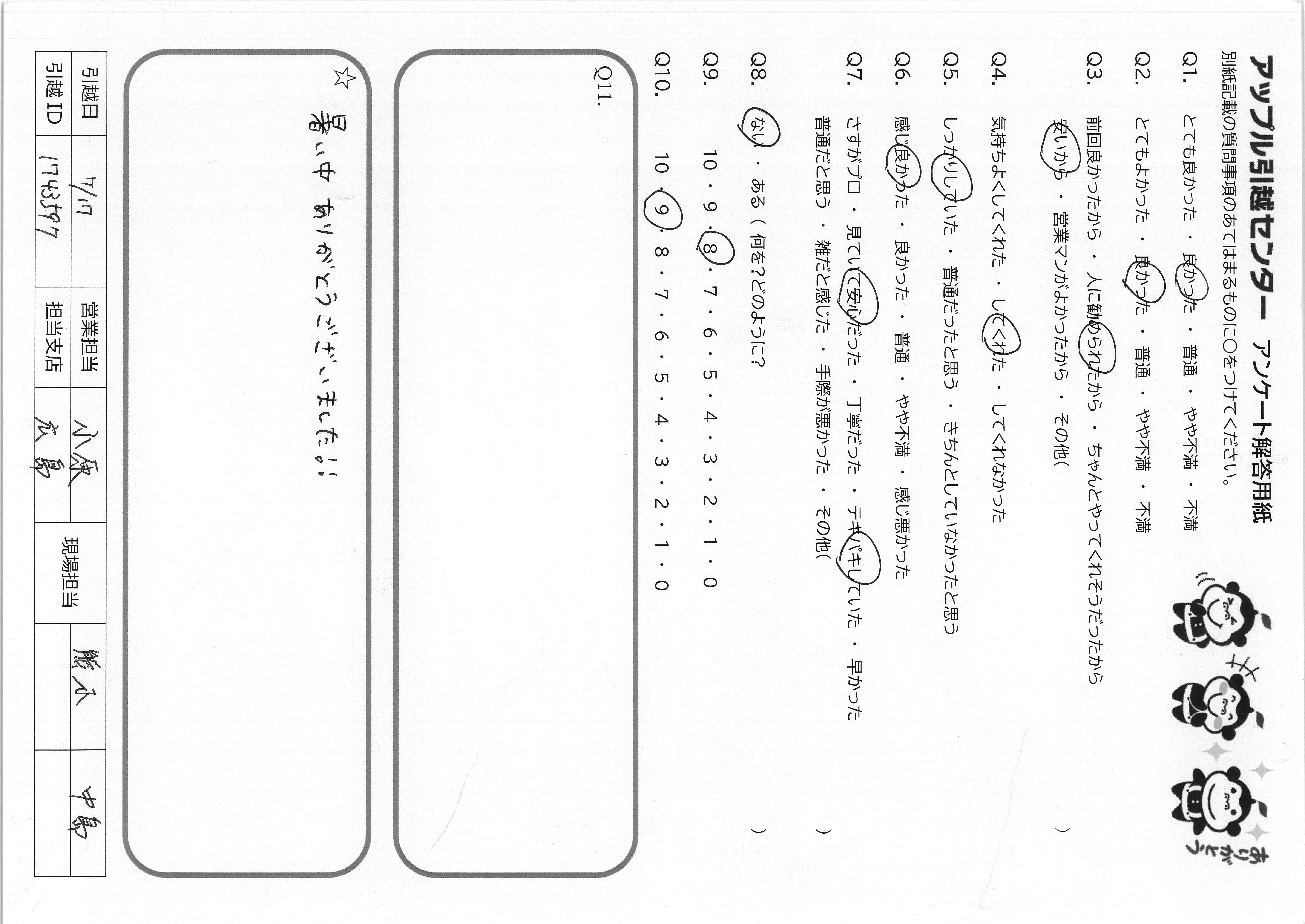A.テキパキと作業していただき感謝しています。 作業中に家電や家具に対するご質問(雑談)をしましたが、感じよく回答いただき気持ちよく引っ越しを完了することができました。 住居で搬出搬入が終わった後、玄関のオートロックの解放をしたままになっていたので、そこを忘れずに戻していただけると良かったかなと思います。