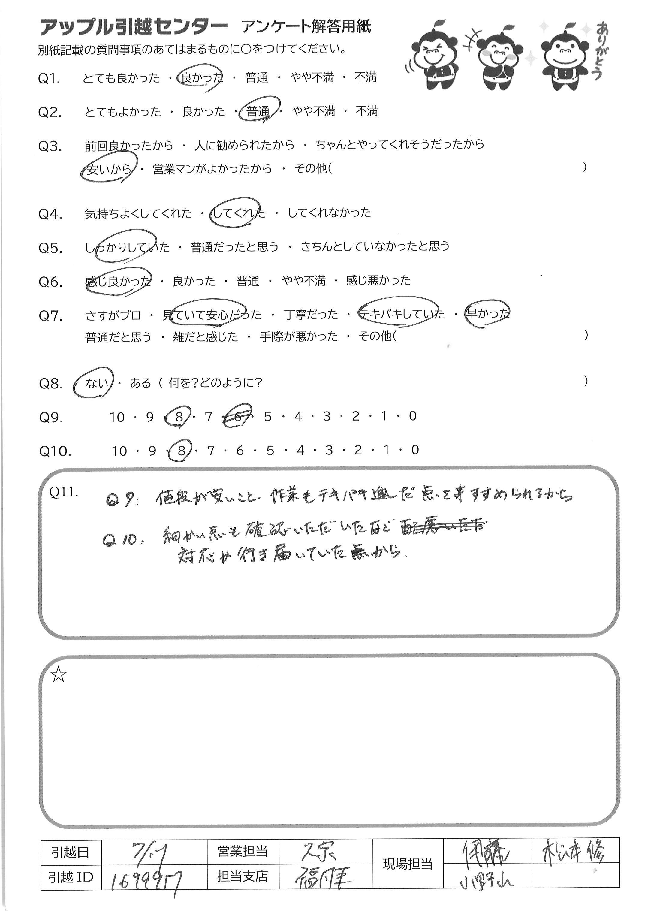 A.Q9.値段が安いこと、作業もテキパキし点をすすめられるから Q10.細かい点も確認いただいたなど 対応が行き届いた点から