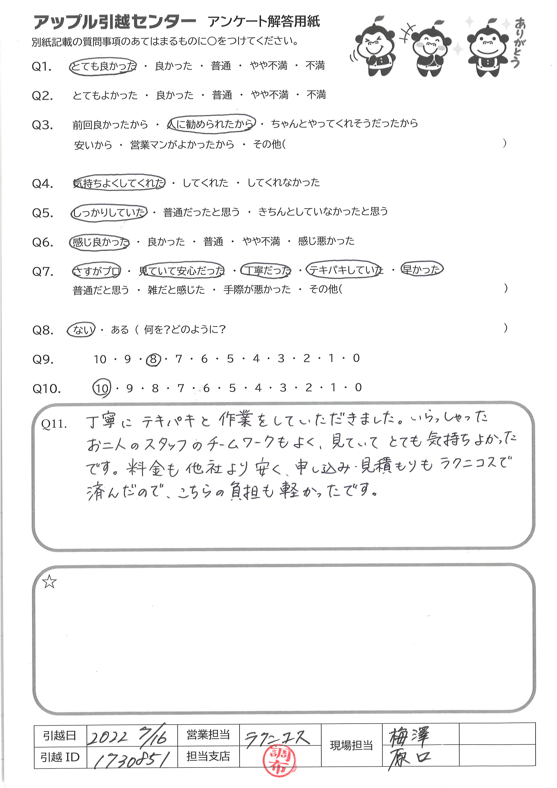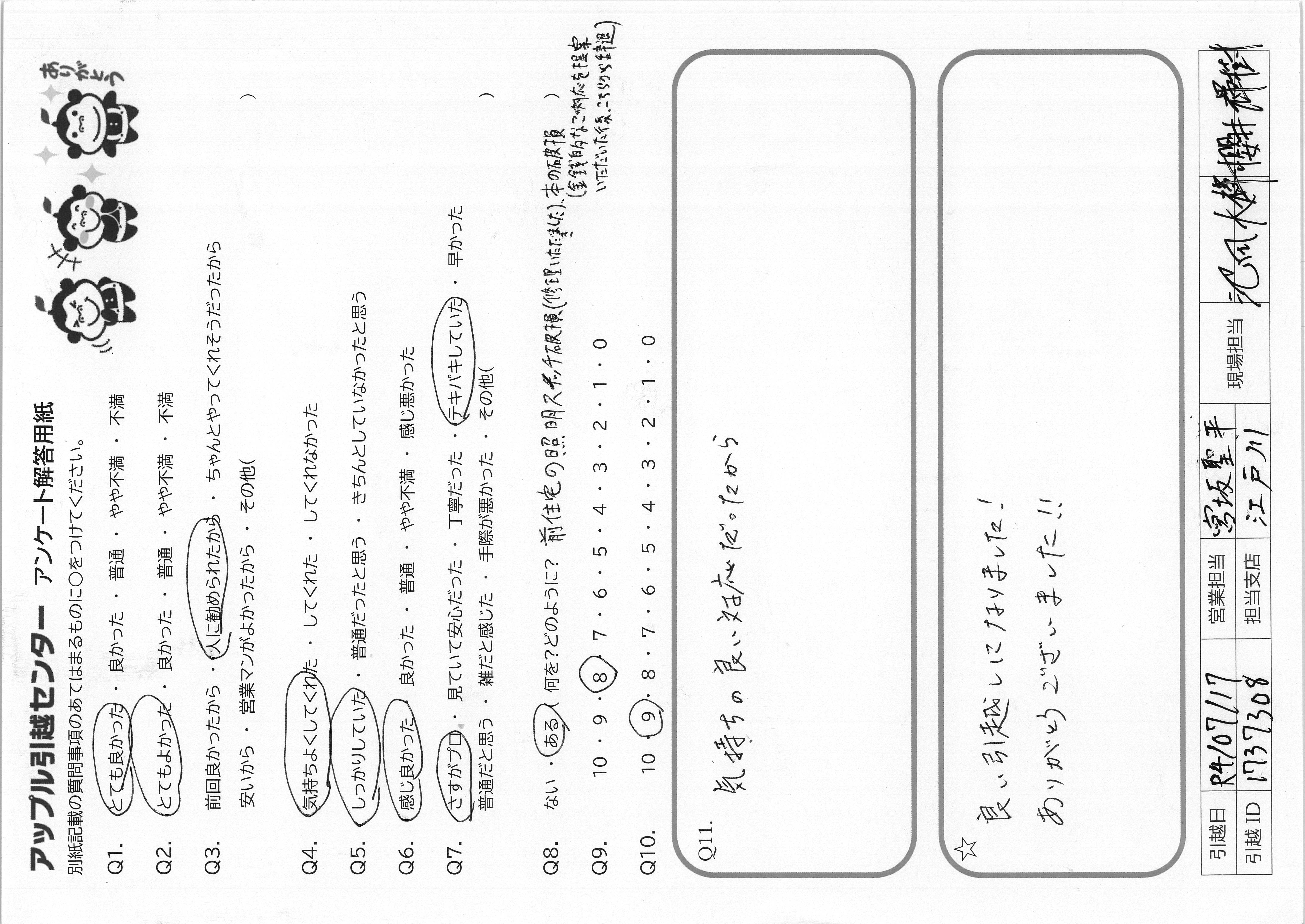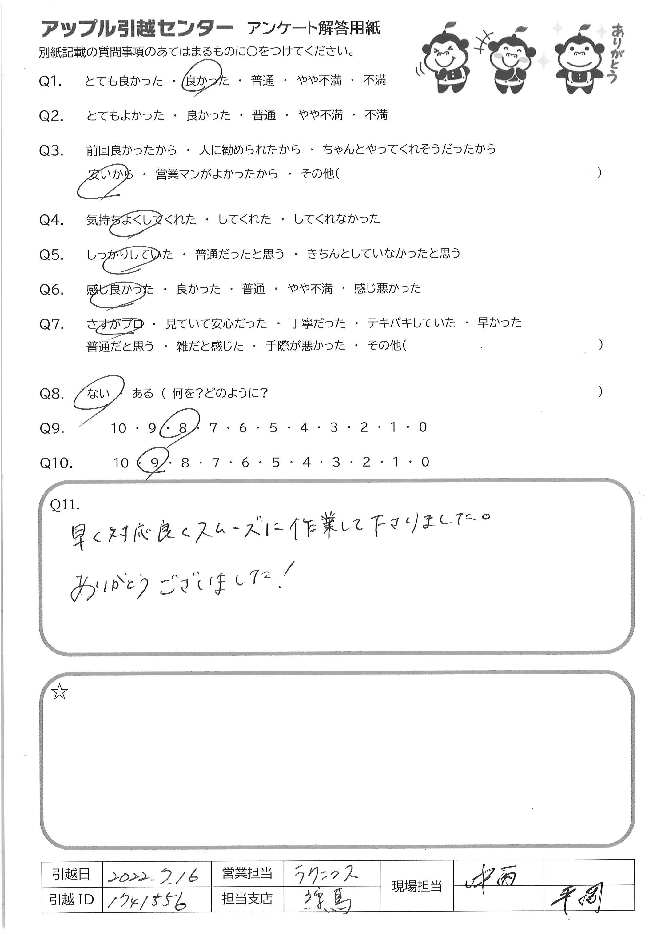 A.今回で、2回目の利用ですがやはりアップル引越しセンターさんにご依頼して良かったと思いました。大型家電の引き取りをしていただいたりしても思っていた金額より安く済んだので、もし3回目の引越しがあったら再度アップル引越しセンターさんに頼みたいと思います。ありがとうございました!今後ともよろしくお願い致します。
