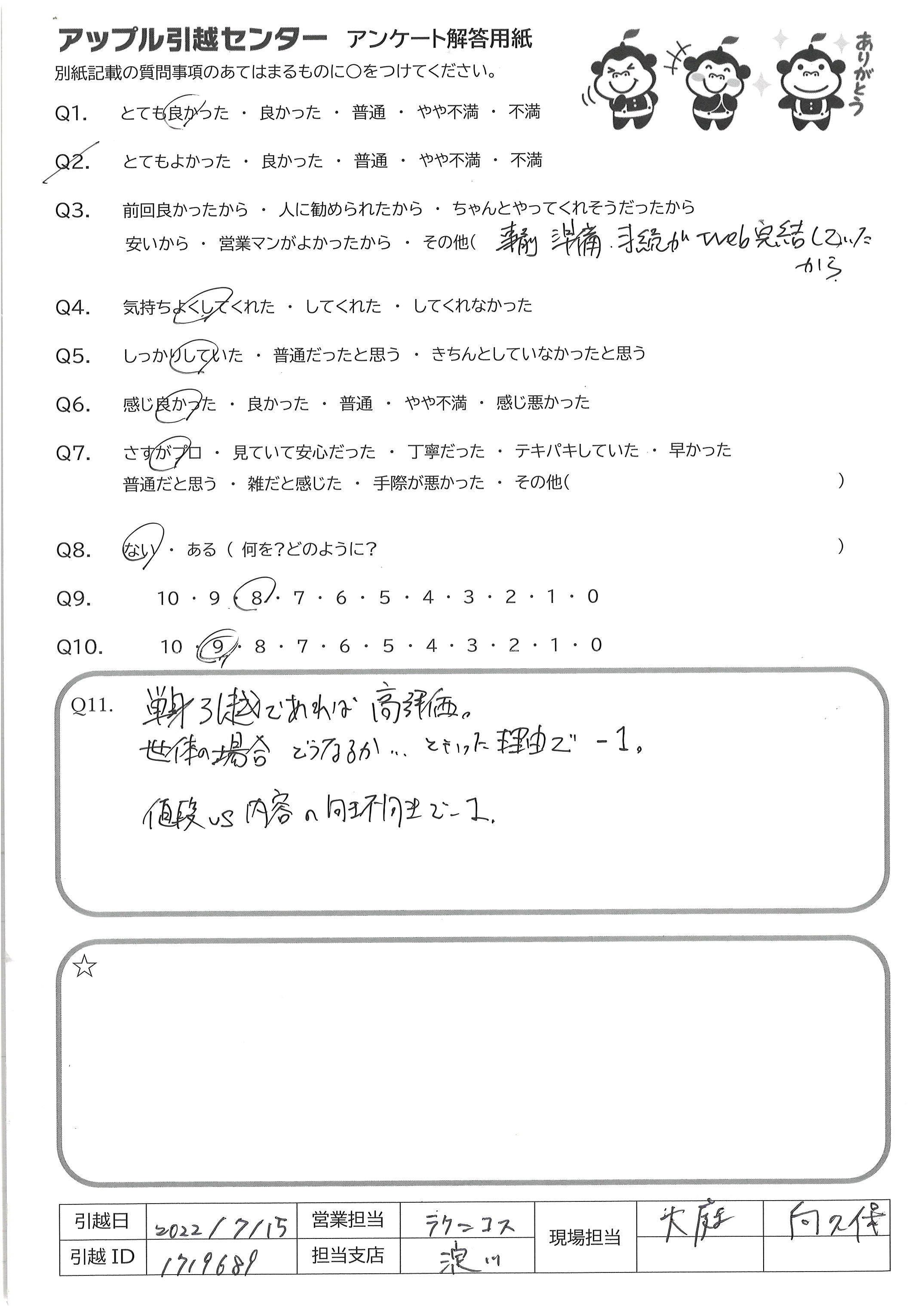 引越し日:2022年07月14日 エリア:大阪府大阪市鶴見区