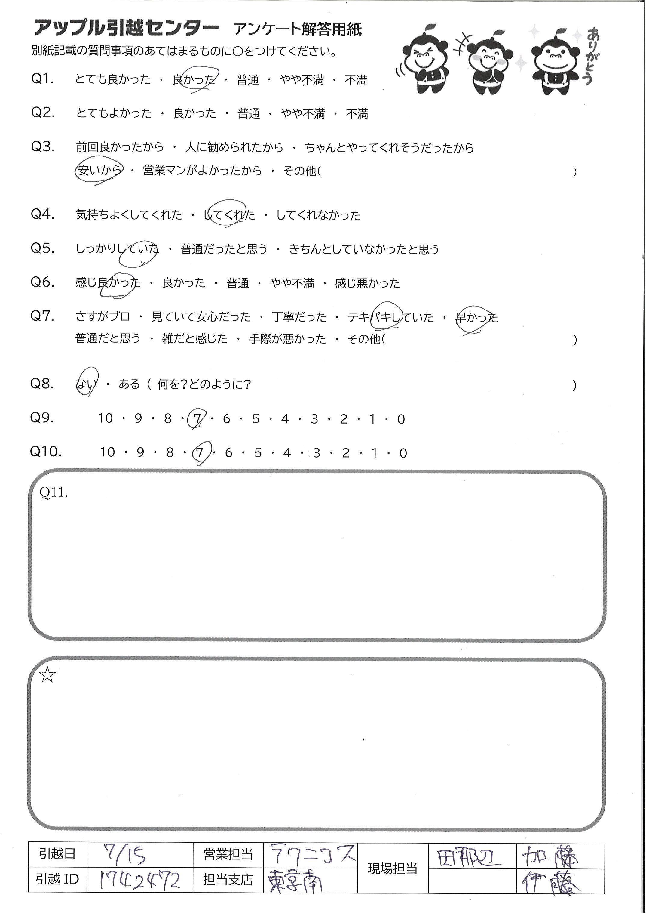 A.電話オペレーター、見積もりの営業マン、引越し作業員の皆様には大変お世話になりました。 破棄が多く、運搬もあった中、料金もお安くして頂いて感謝致します。 ありがとうございました。