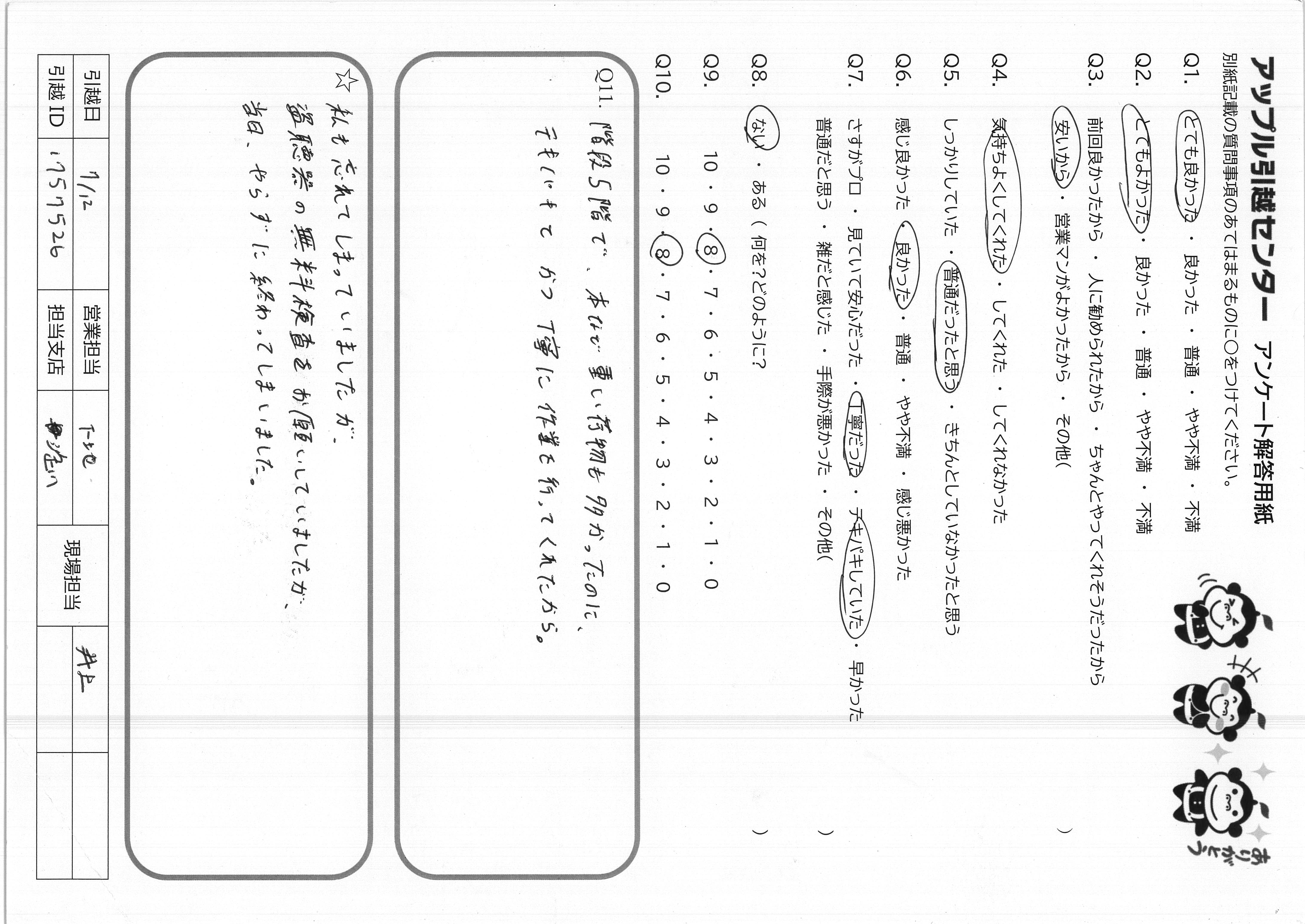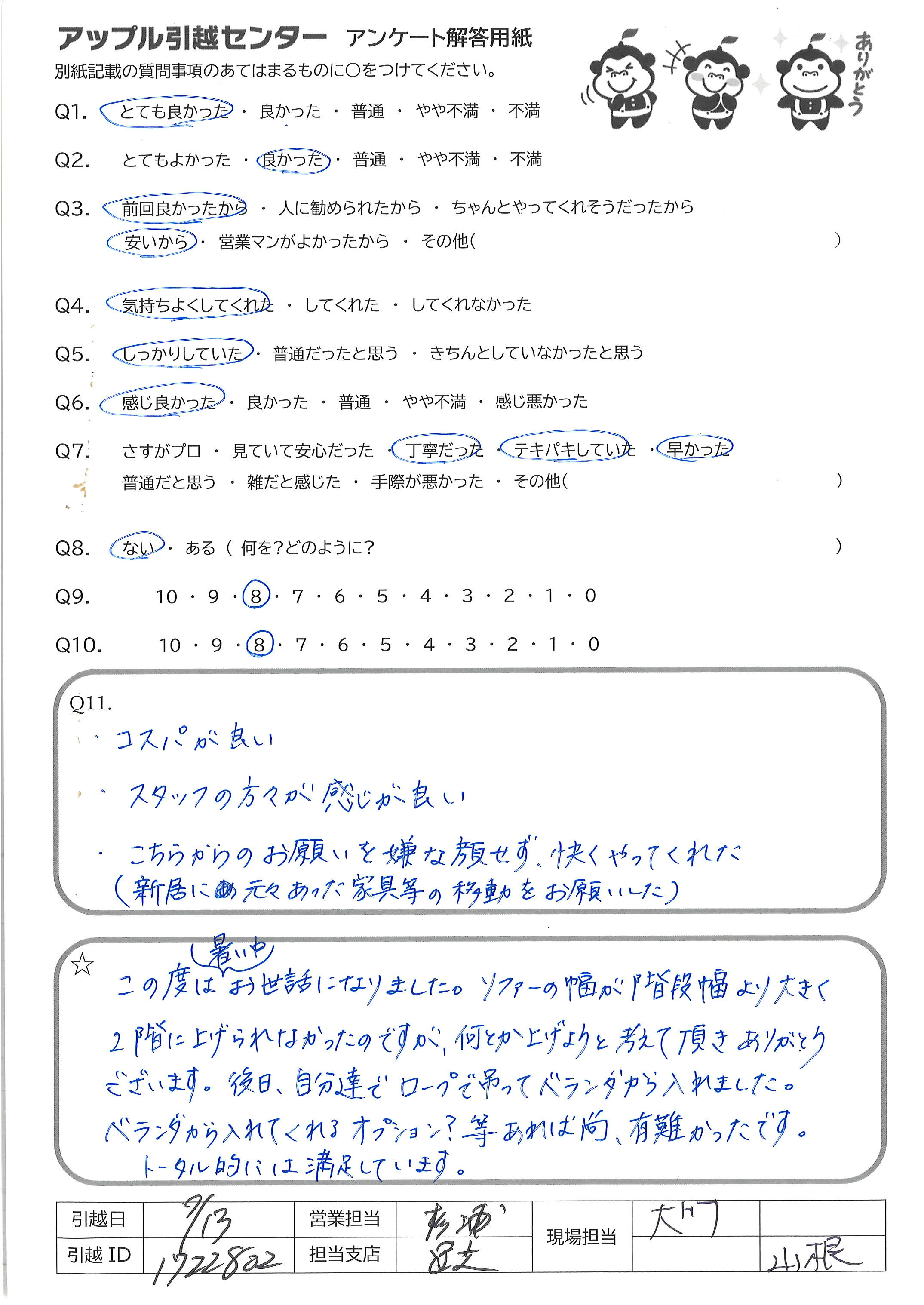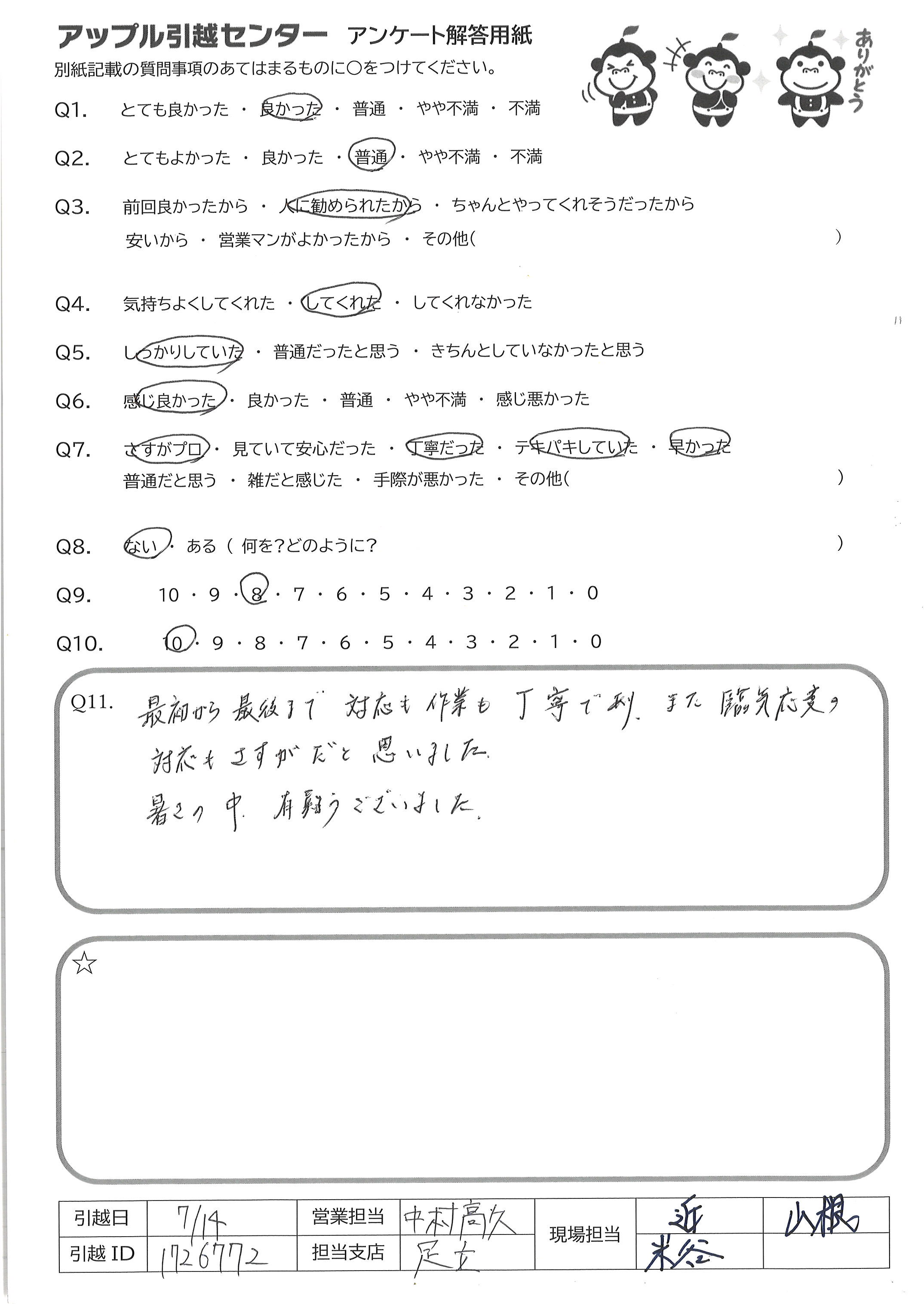 A.とても手際が良く、見ていて気持ちのいい対応でした 説明も丁寧、安心できましたし、暑い中きちんとマスクして対応して 頂いてとても感謝しています 私も妻も満足いく引越でした