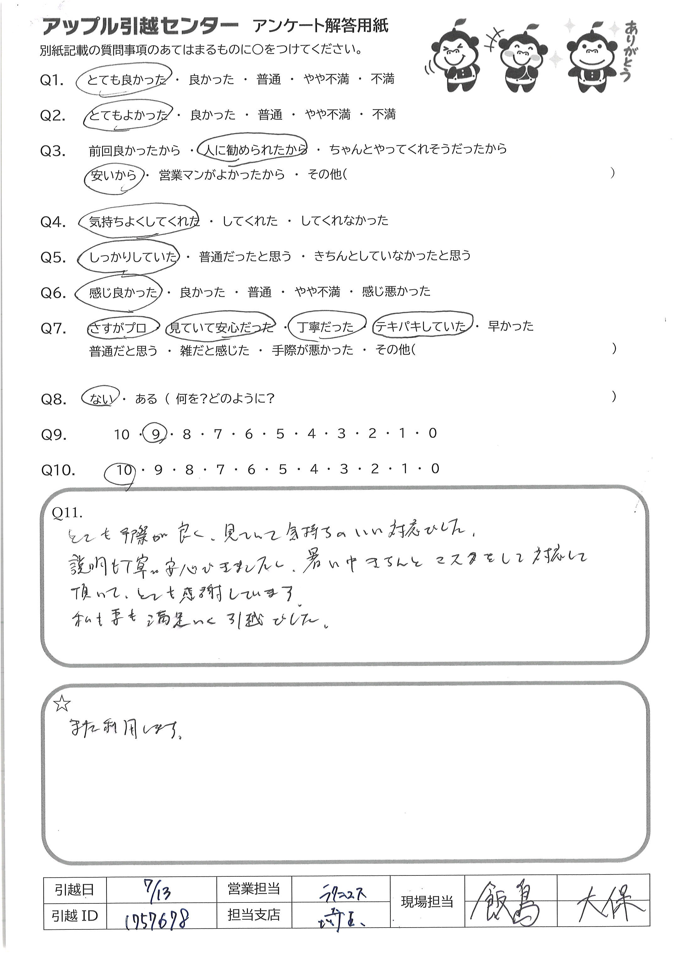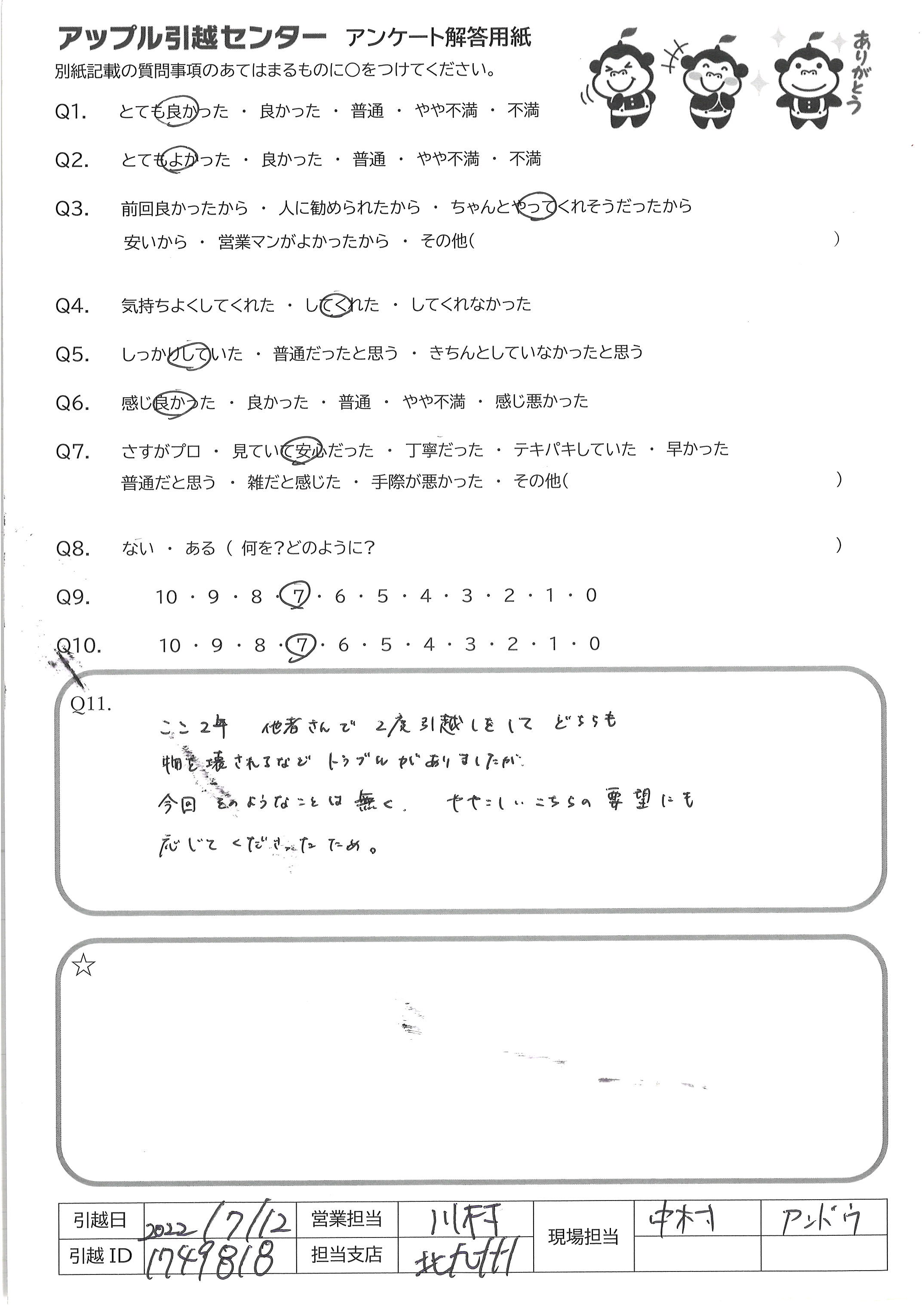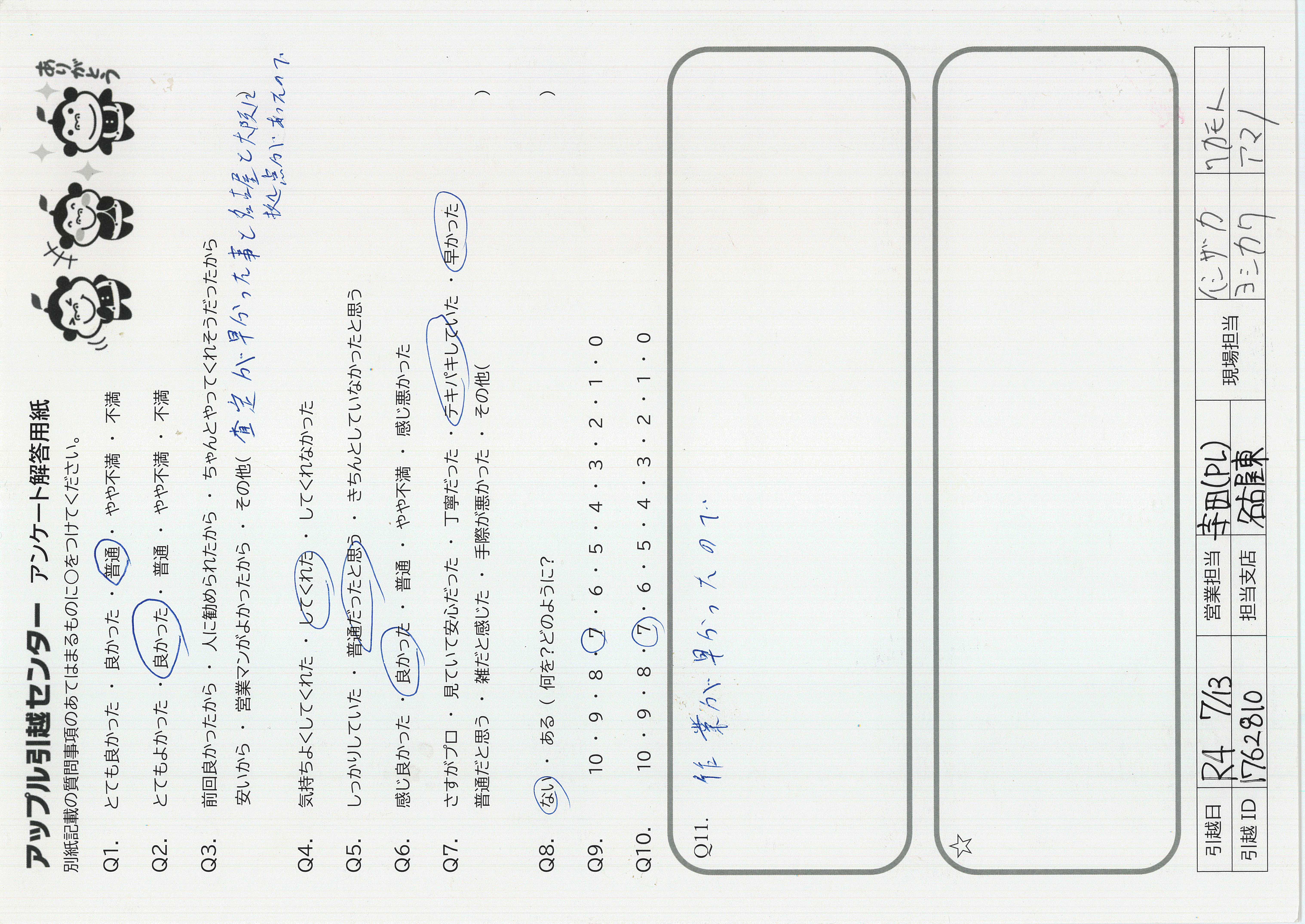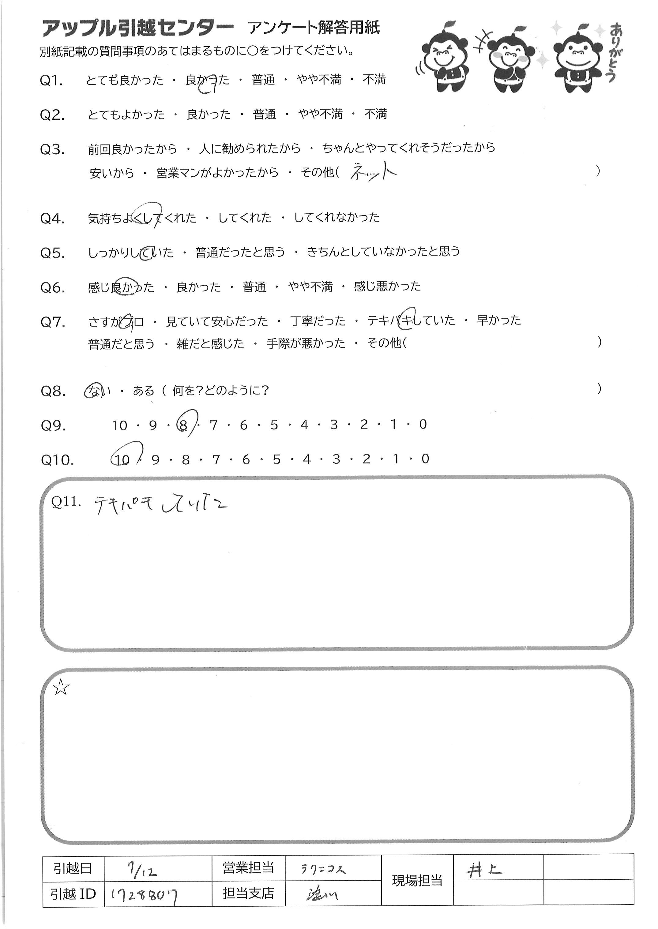 A.とても手際が良く、見ていて気持ちのいい対応でした 説明も丁寧、安心できましたし、暑い中きちんとマスクして対応して 頂いてとても感謝しています 私も妻も満足いく引越でした