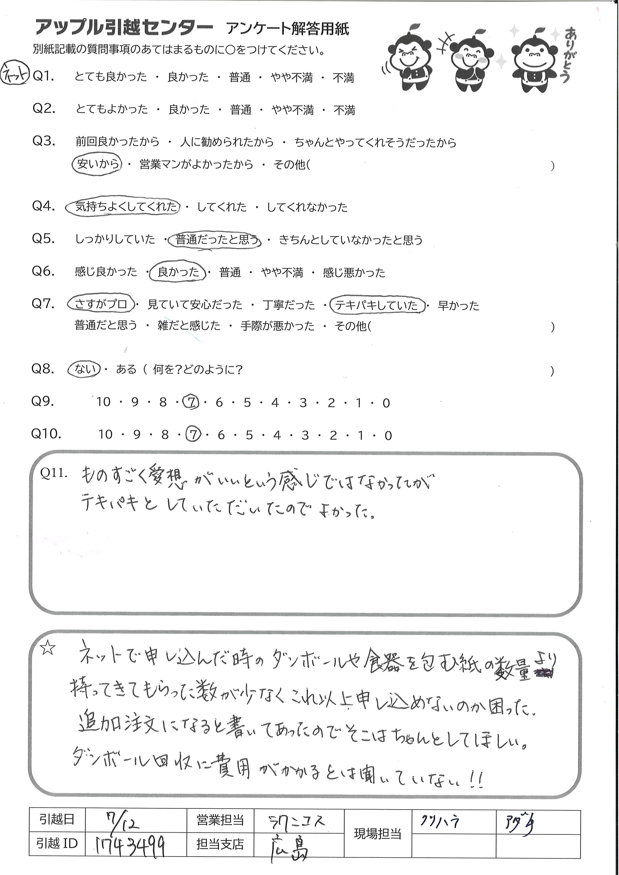 A.ネットで申し込んだ時のダンボールや食器を包む紙の数量より 持ってきてもらた数が少なくこれ以上申し込めないのか困った 追加注文になると書いてあったのでそこはちゃんとしてほしい。 ダンボール回収に費用がかかるとは聞いていない!!
