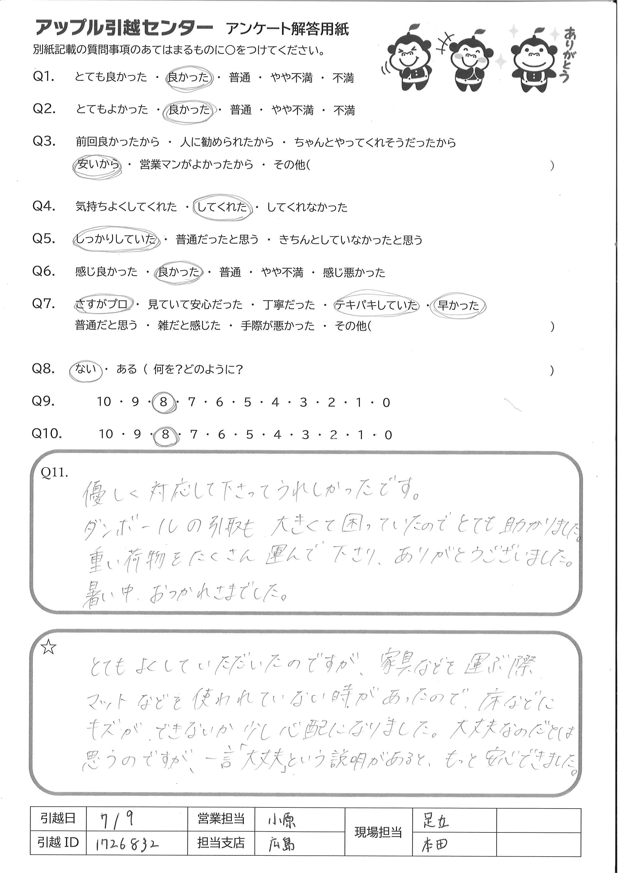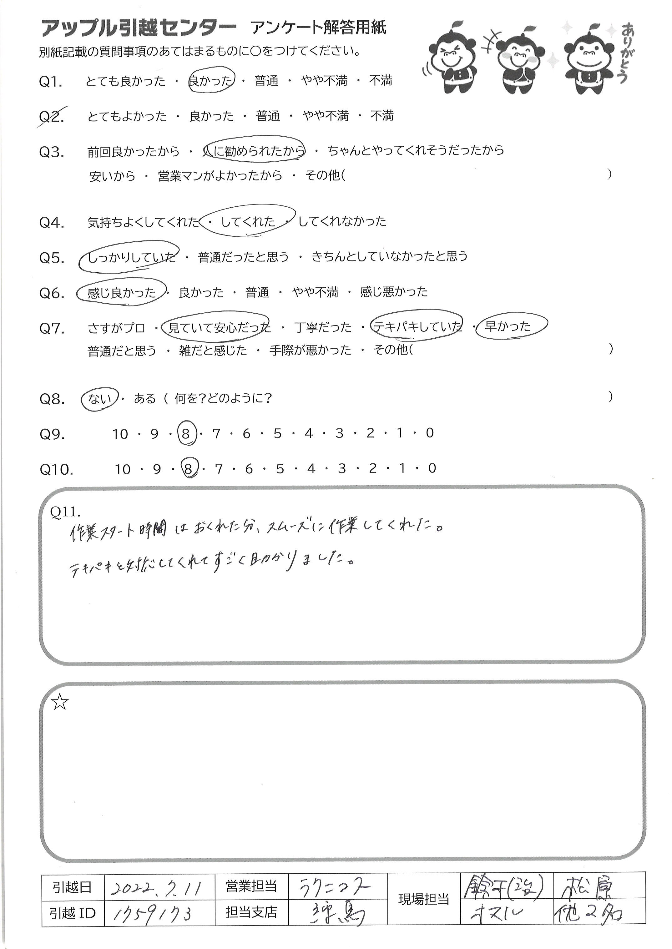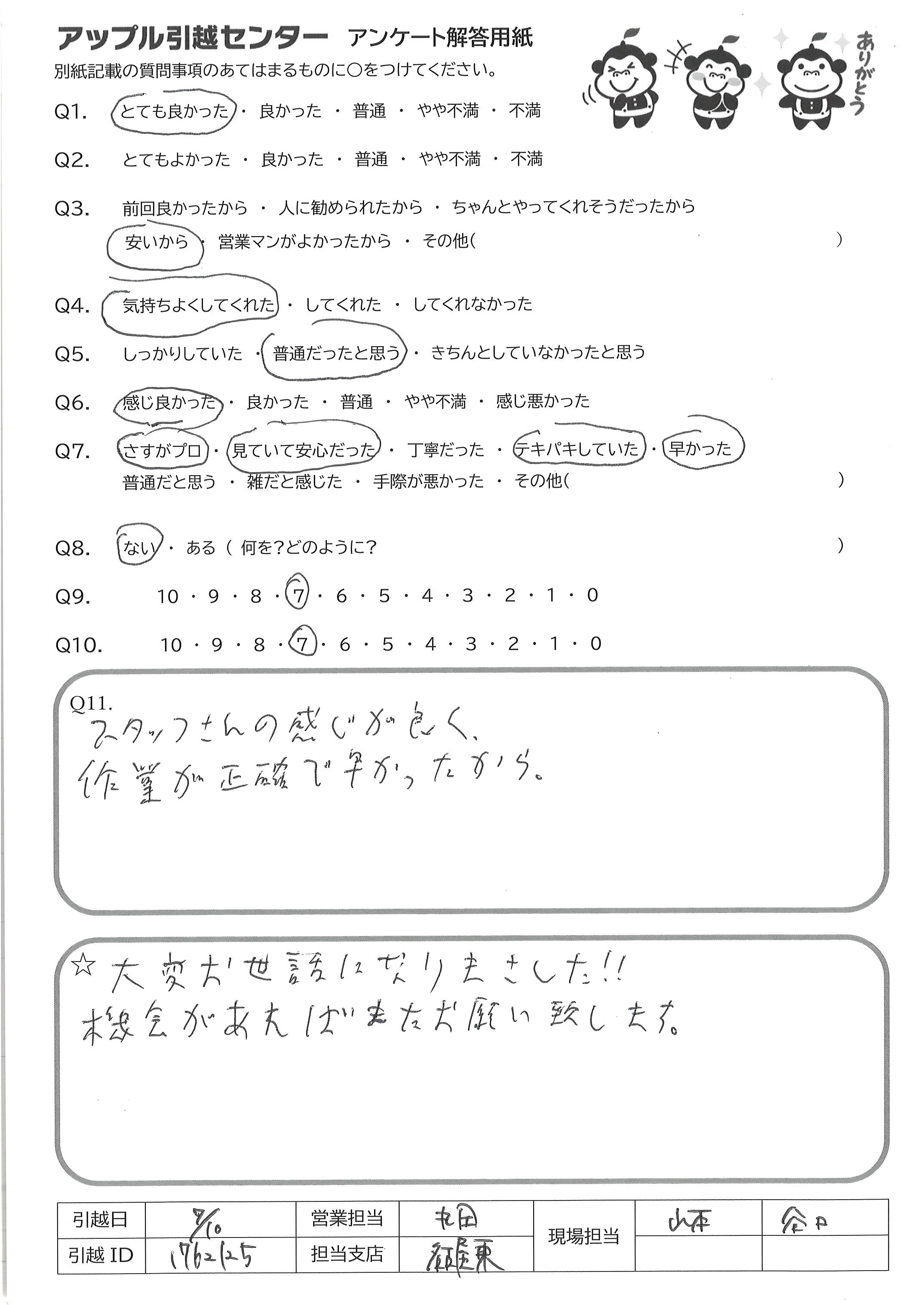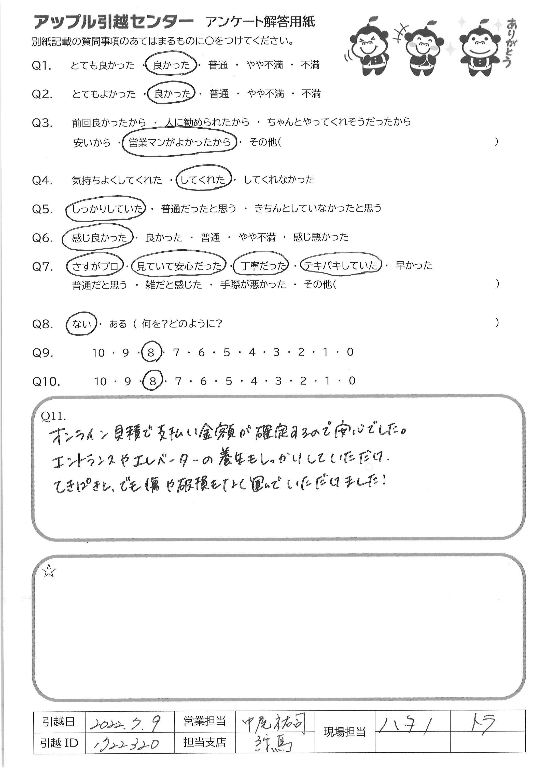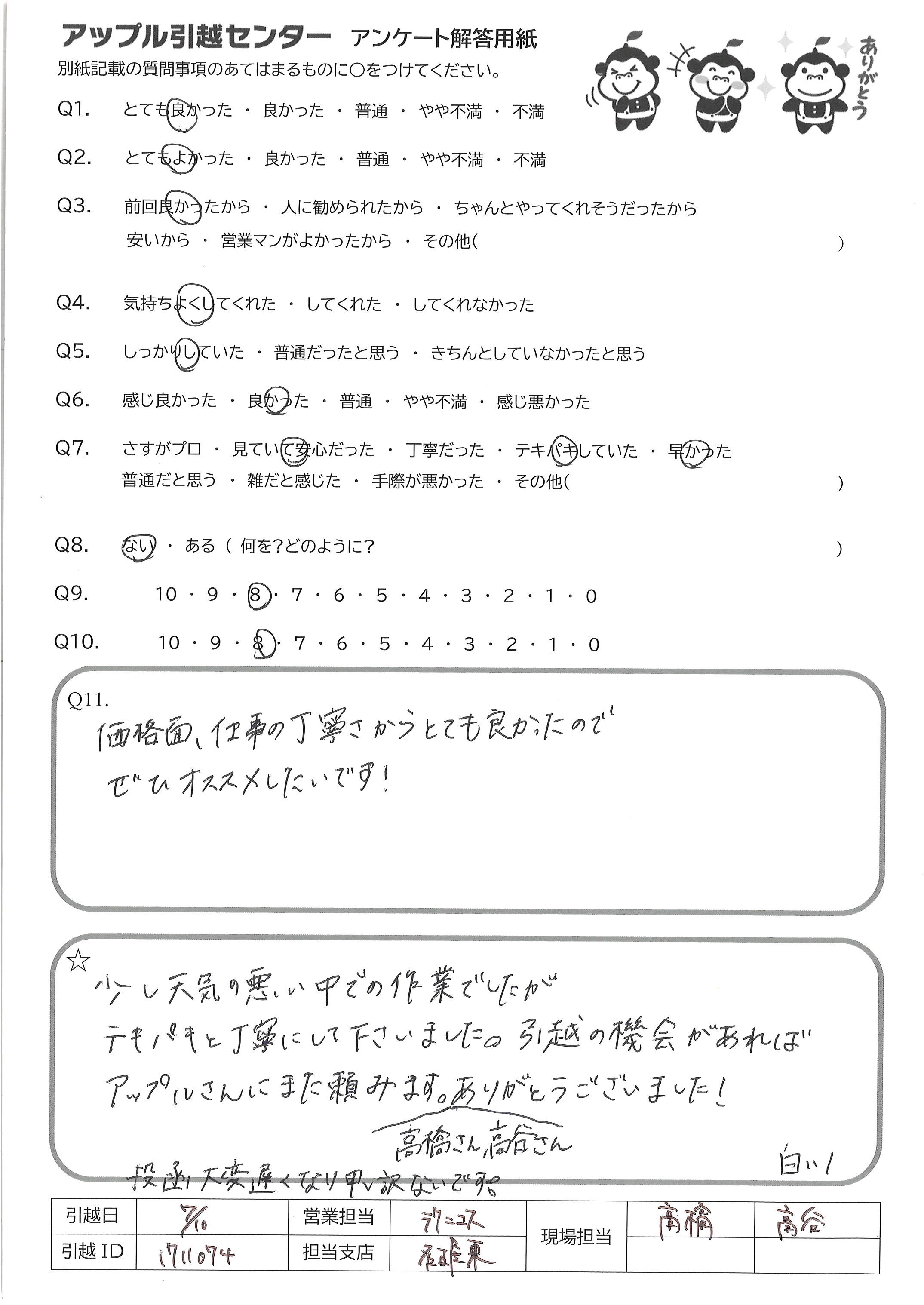 A.少し天気の悪い中での作業でしたが テキパキと丁寧にして下さいました。引越の機会があれば アップルさんにまた頼みます。高橋さん、高谷さんありがとうございました” 投函大変遅くなり申し訳ないです