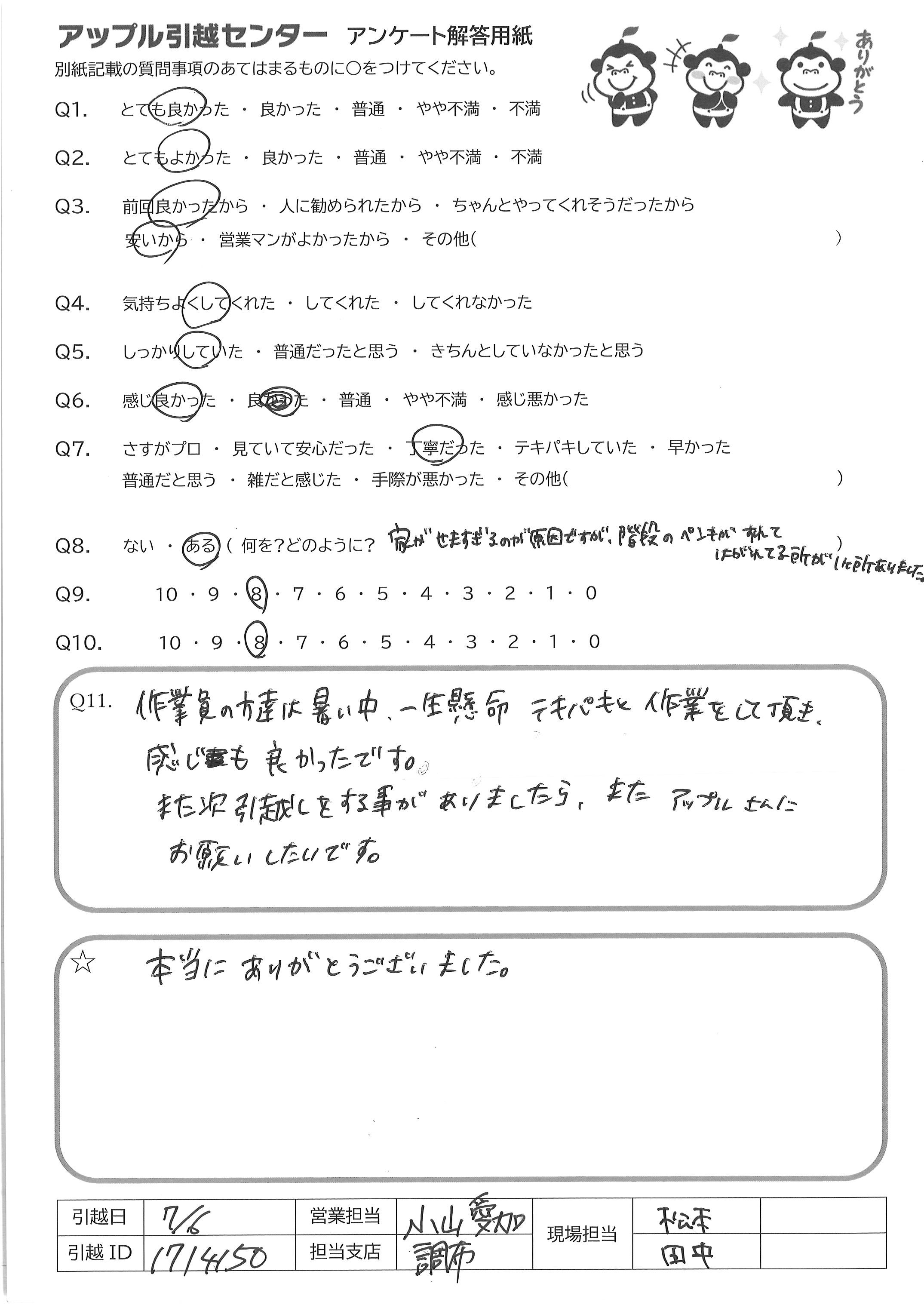 A.作業員の方達は暑い中、一生懸命テキパキ作業をして頂き 感じも良かったです また次引越しをする事がありましたら、またアップルさんに お願いしたいです