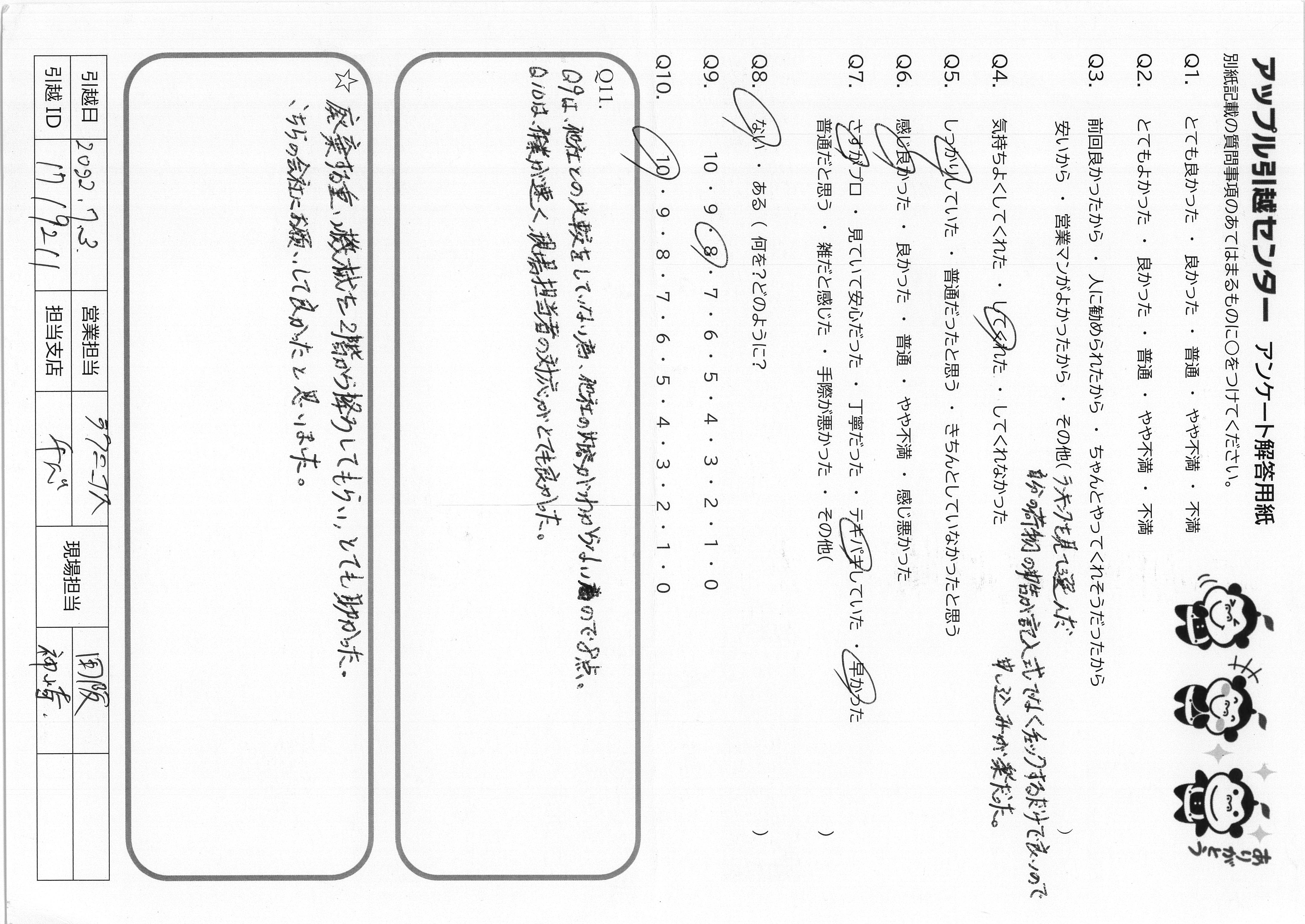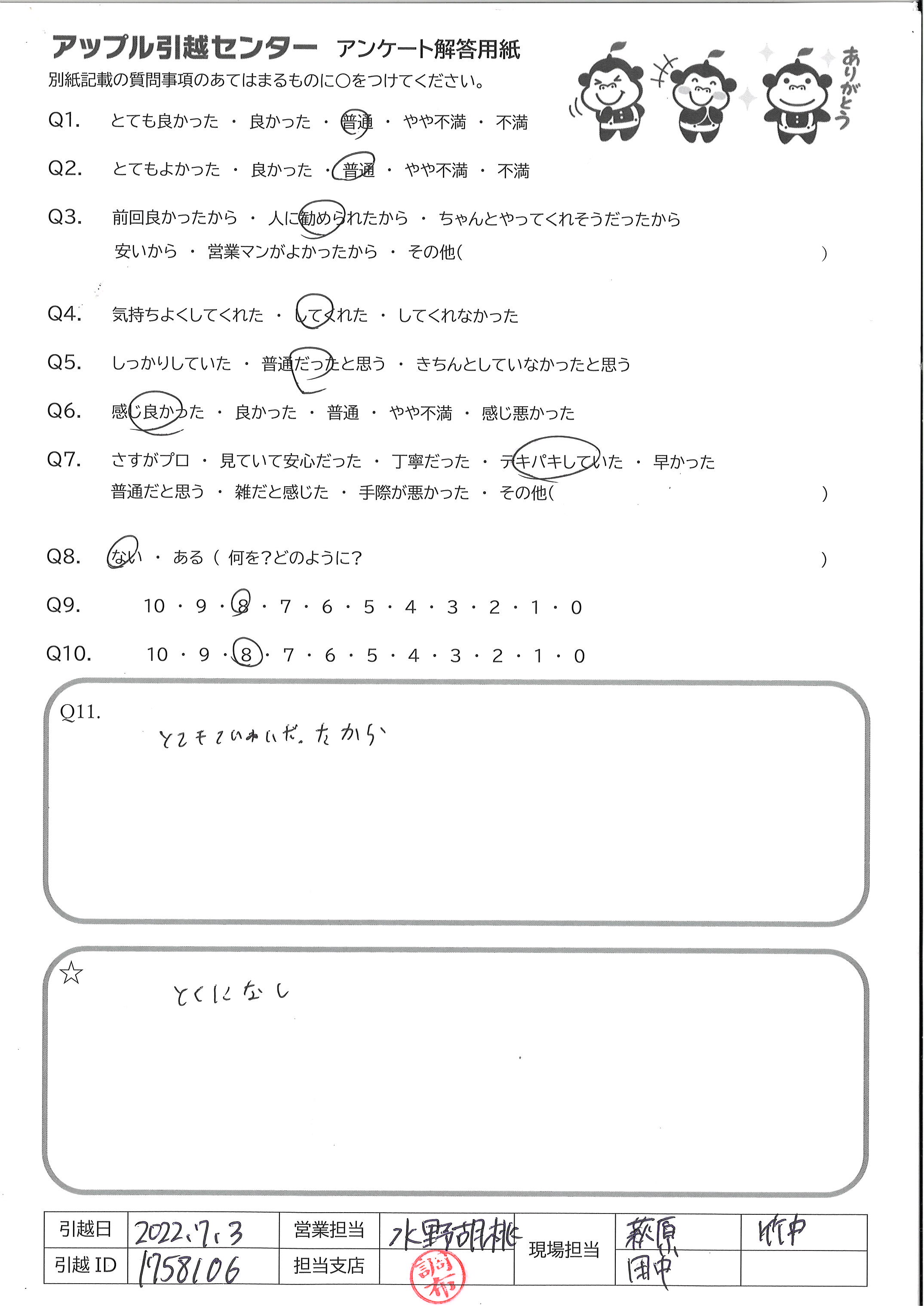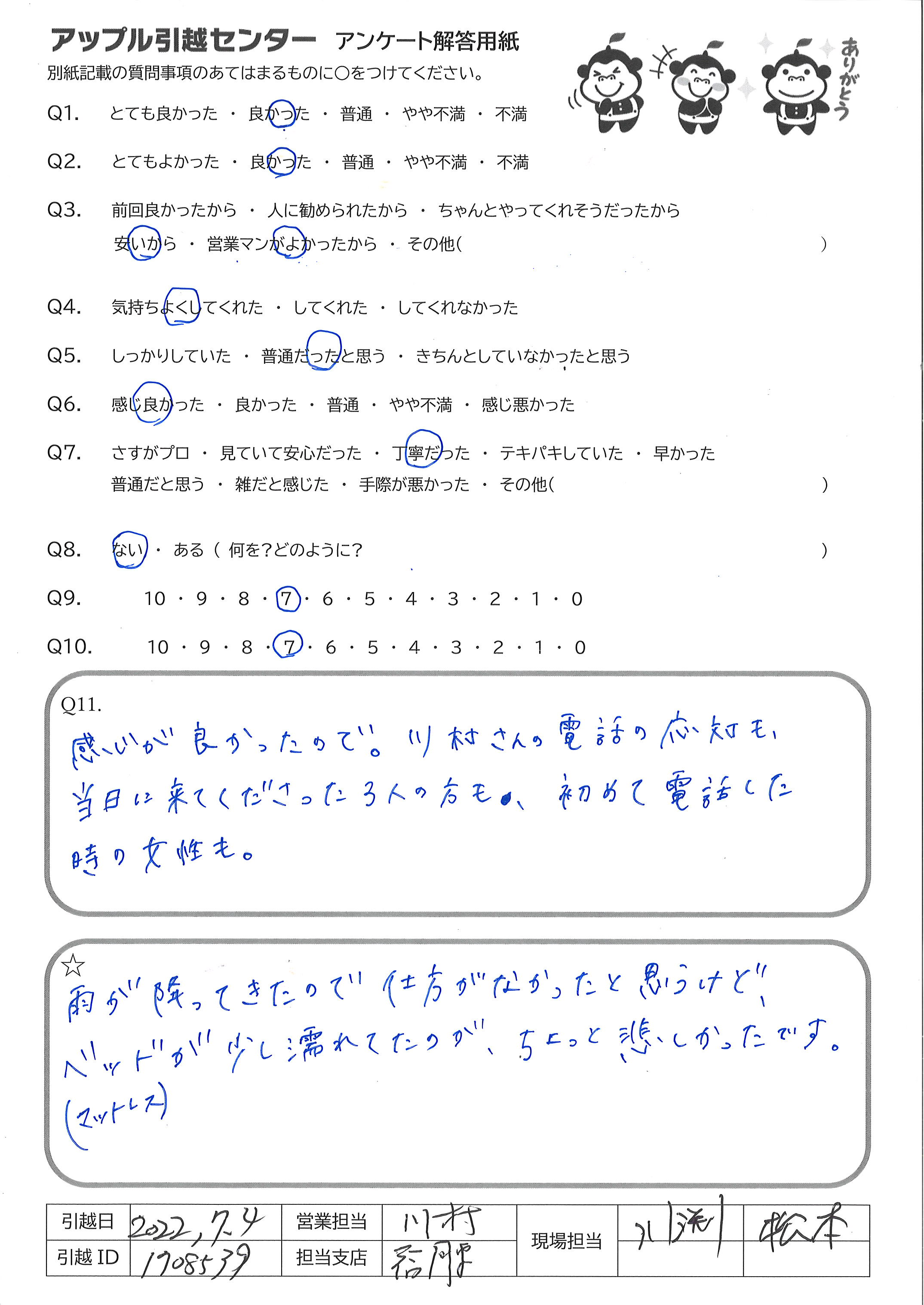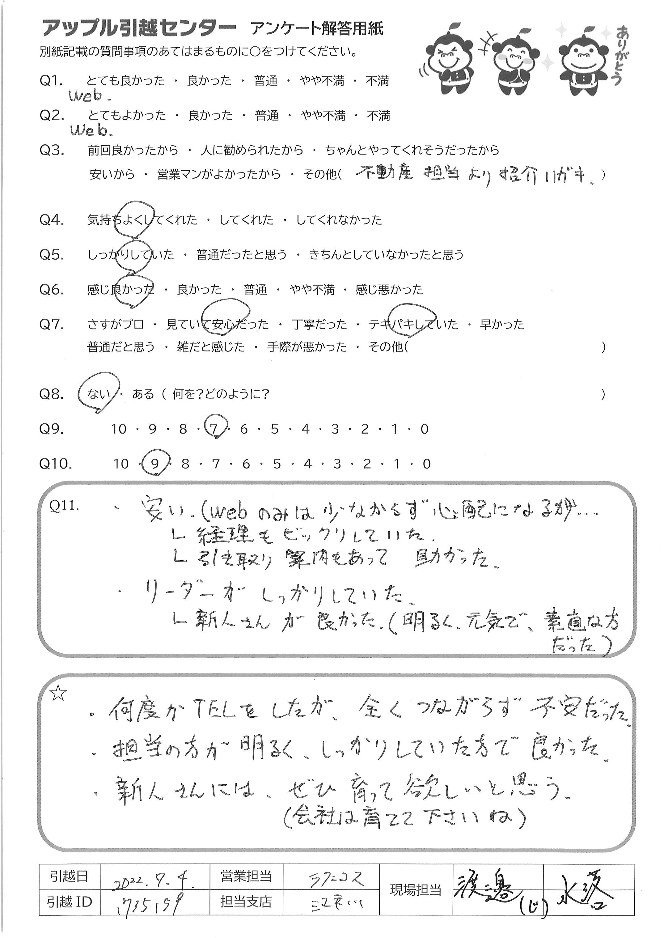 A.・何度かTELしたが全くつながらず不安だった。 ・担当の方が明るく、しっかりしていた方で良かった。 ・新人さんにはぜひ育って欲しいと思う。(会社は育てて下さいね)