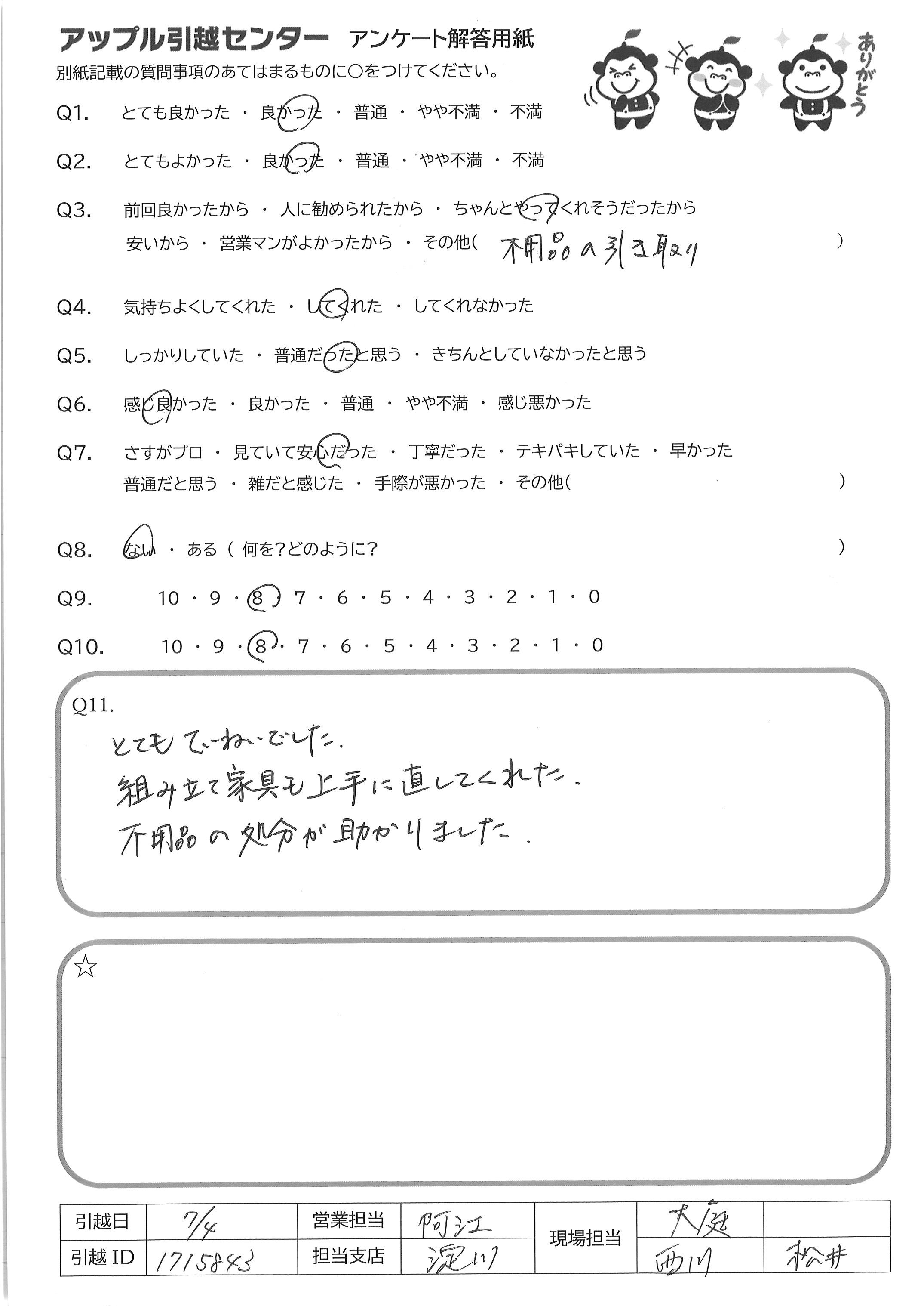 A.とてもていねいでした 組み立て家具も上手に直してくれた 不用品の処分が助かりました