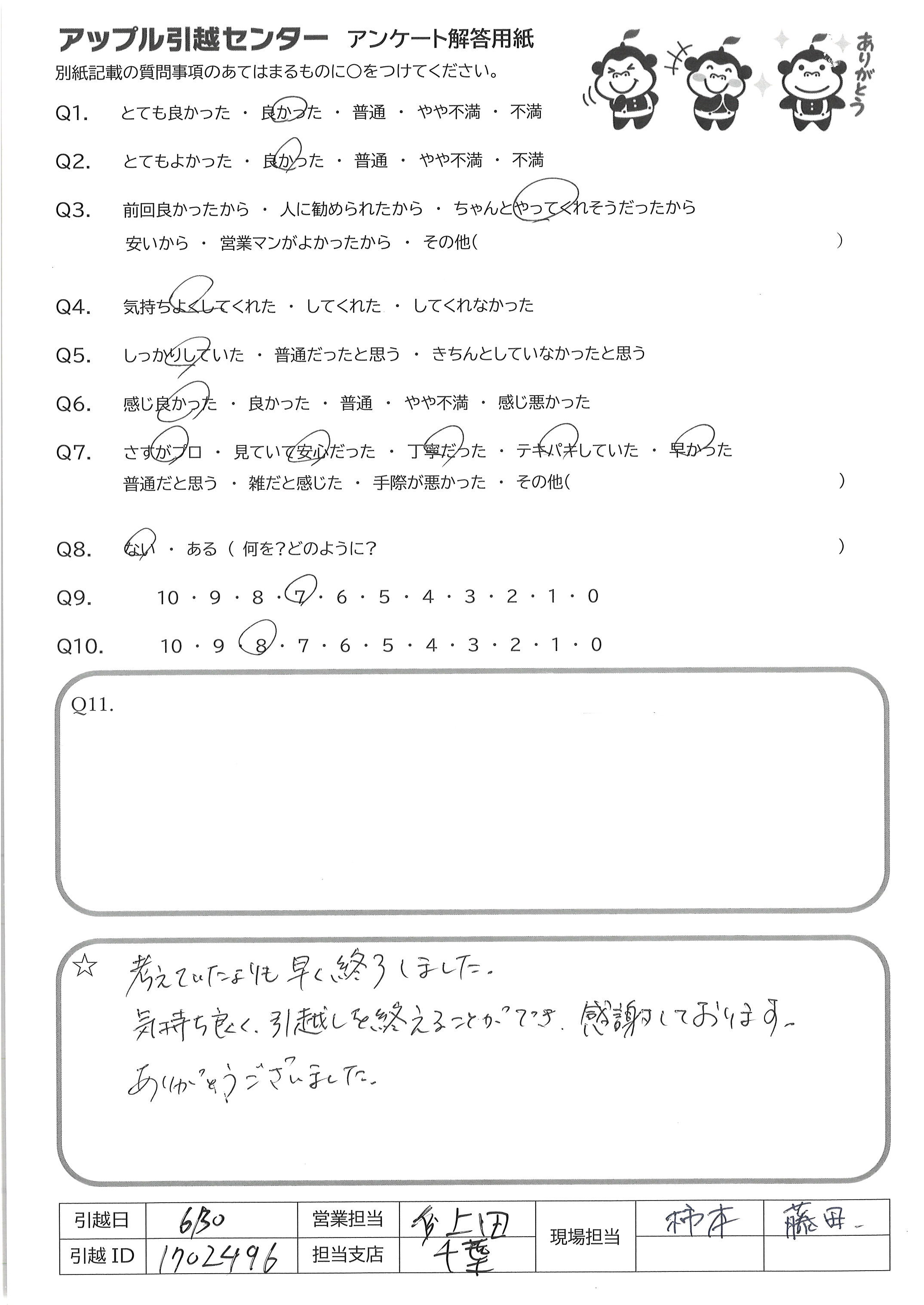 A.考えてていたよりも早く終了しました 気持ち良く引っ越し終えることができ、感謝しております ありがとうございました