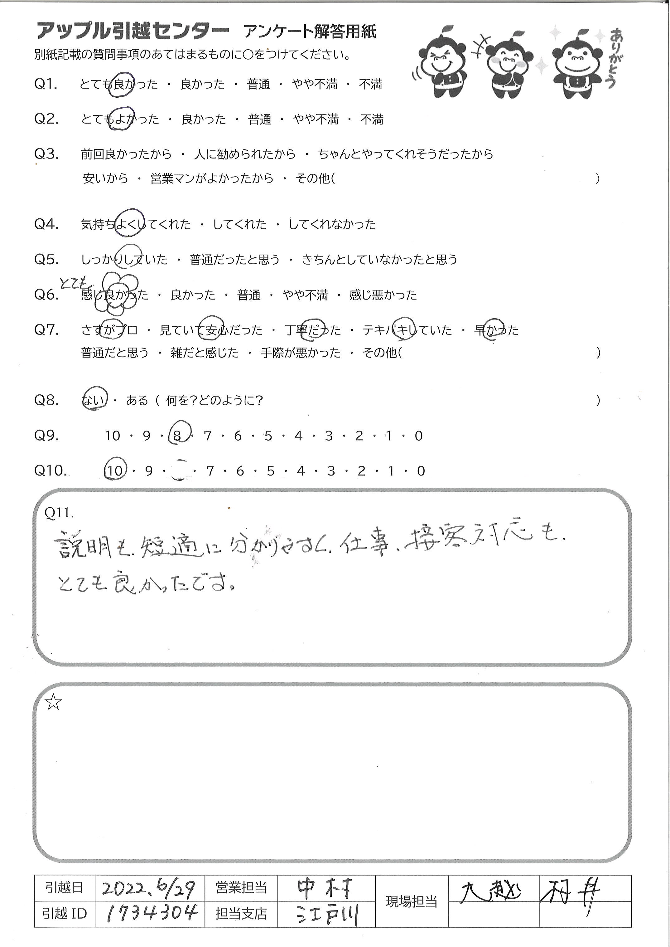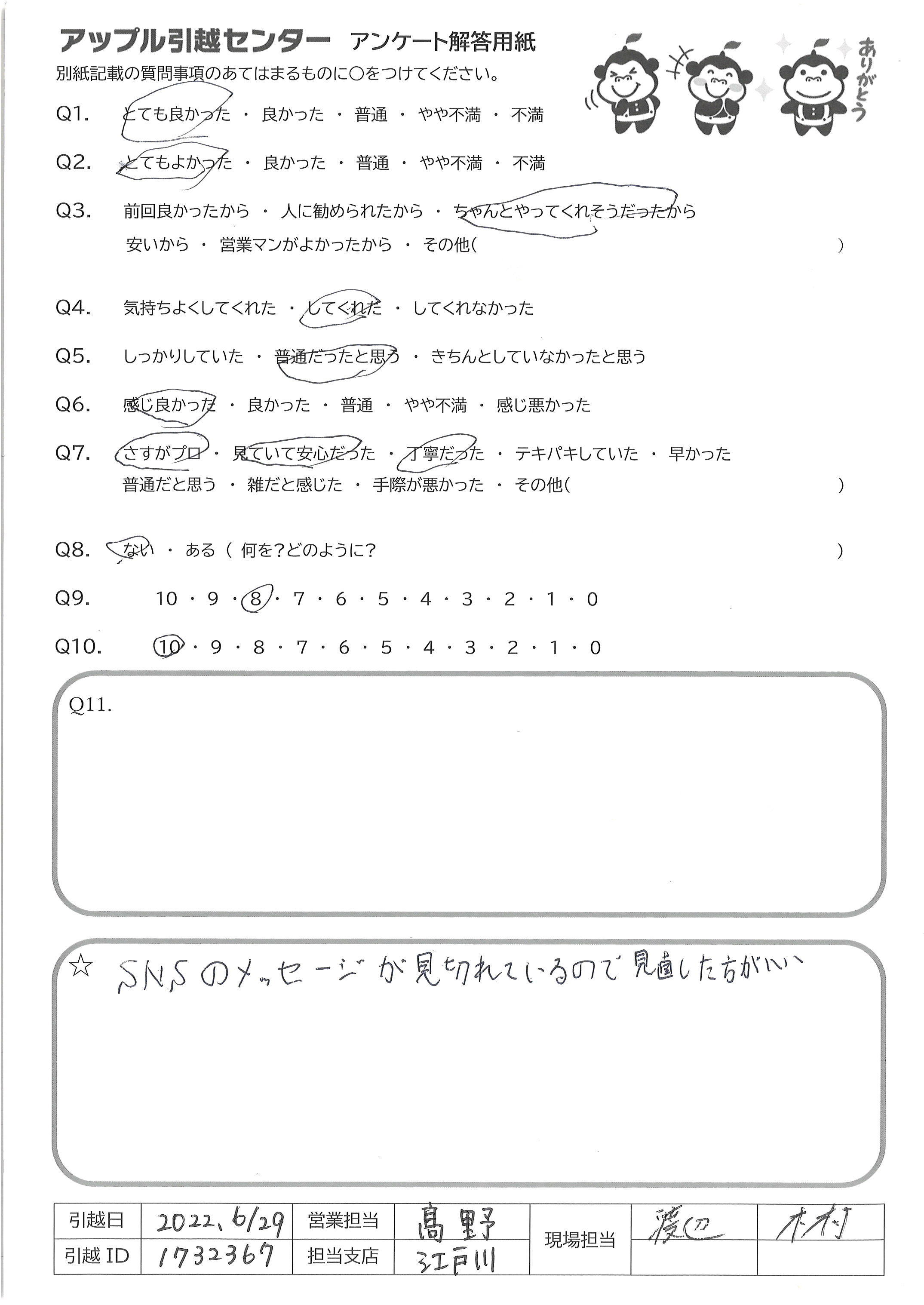 A.連日暑い中での引越し作業ありがとうございました。無事引越しできて良かったです。また機会があればよろしくお願いします。