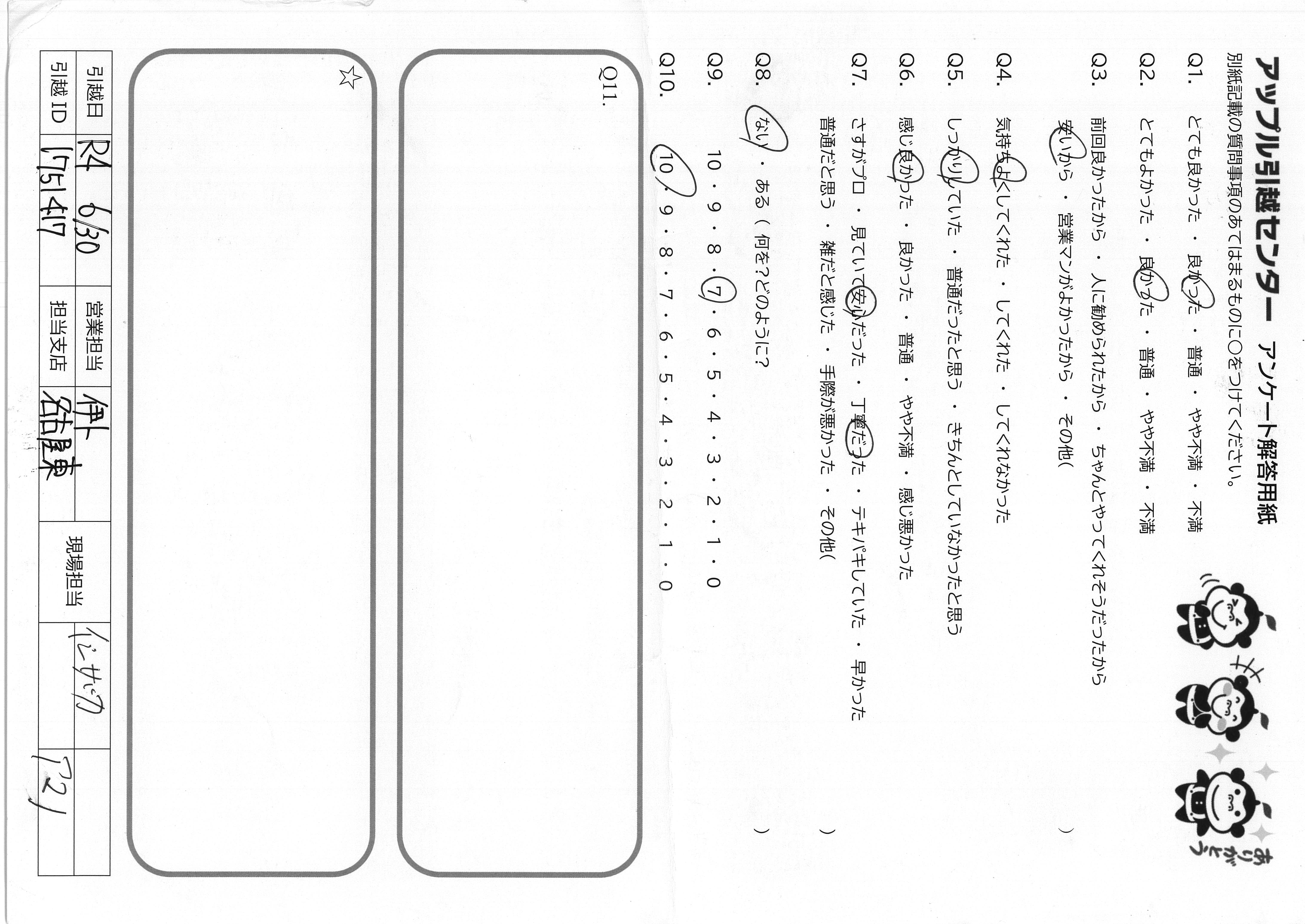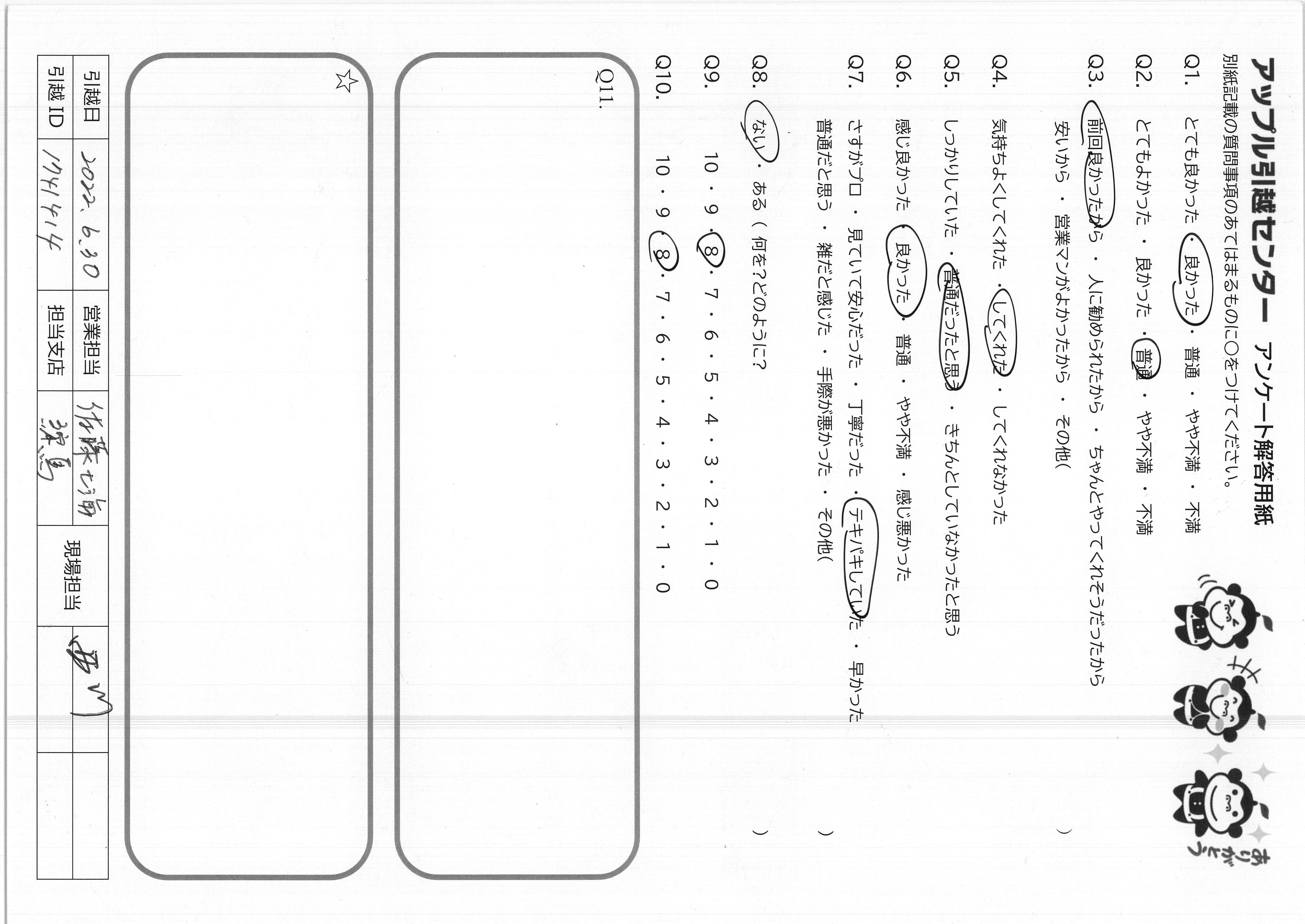 A.1回目に電話対応してくれた人はよかったが、荷物が増える時に対応してくれた人が少し雑に感じた。最後はよかった。 搬出・搬入はテキパキしてくださった。少し丁寧さに欠けていた。