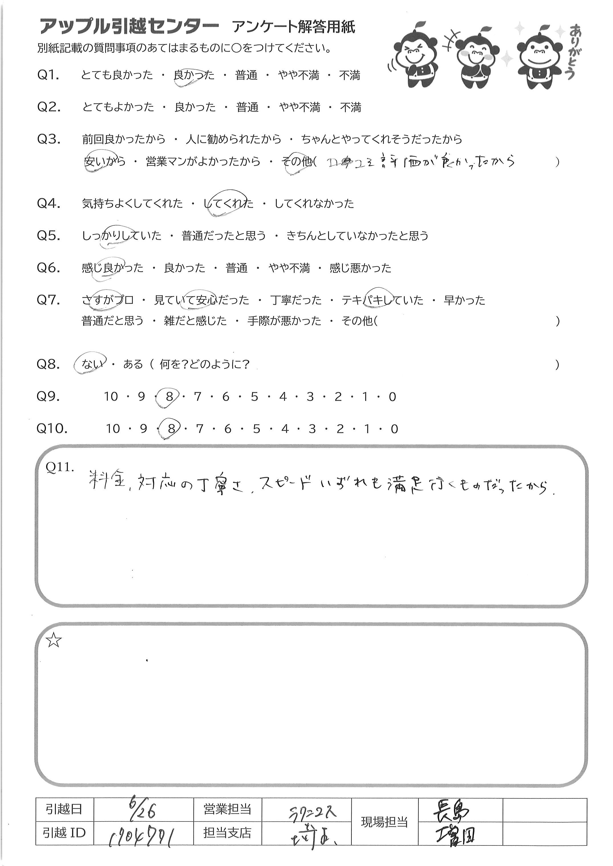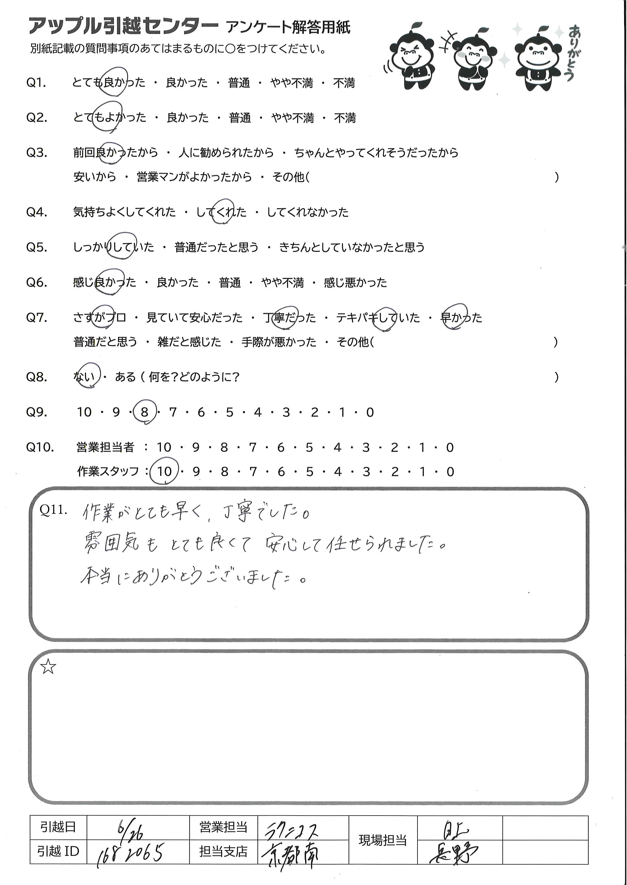 A.説明も丁寧だったし、質問がある際も、どういう理由でこうしたい等、分かりやかったし、全体的にとても親切に対応してもらい安心できた。そう多くない引越しへの不安も減ったので。