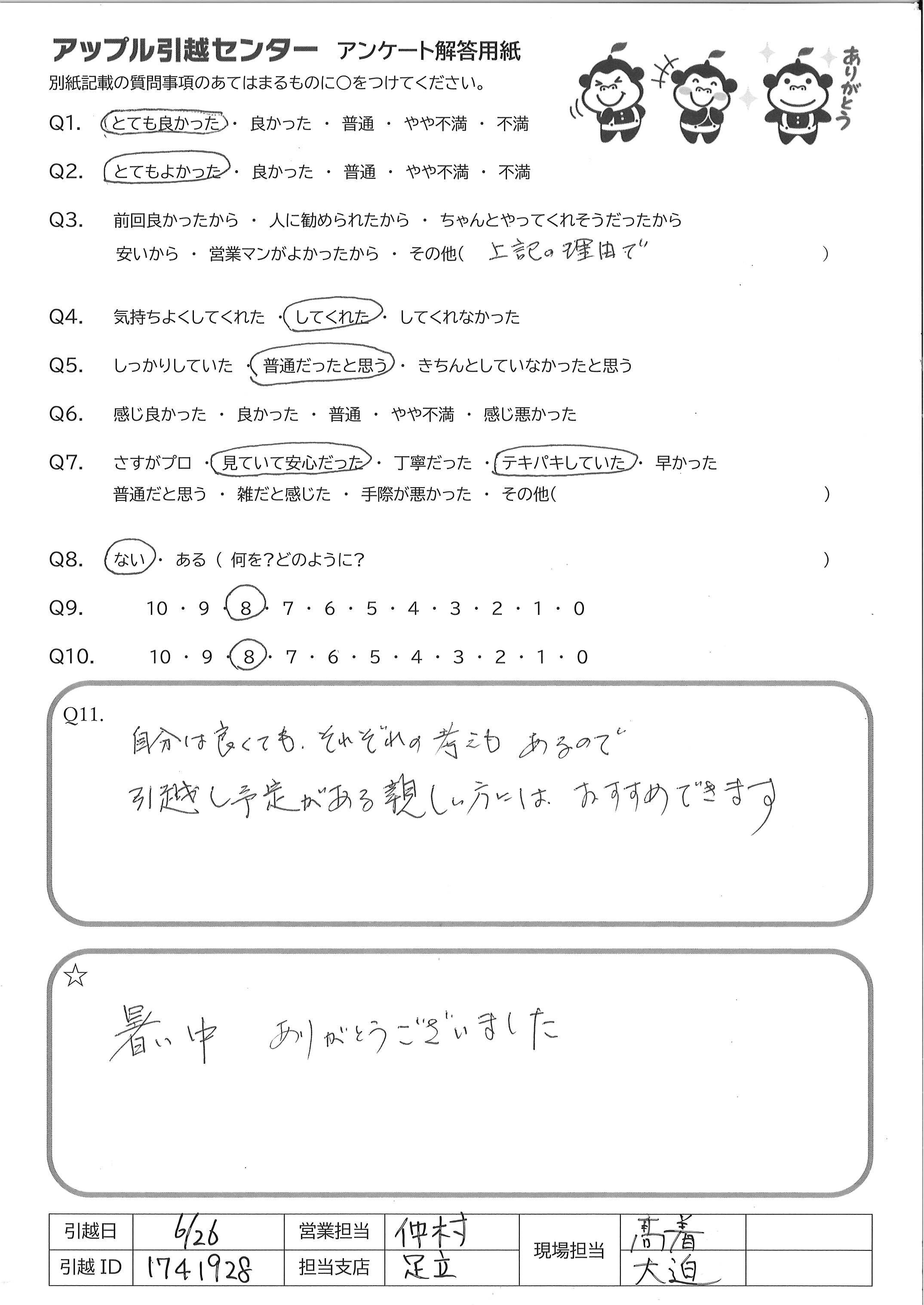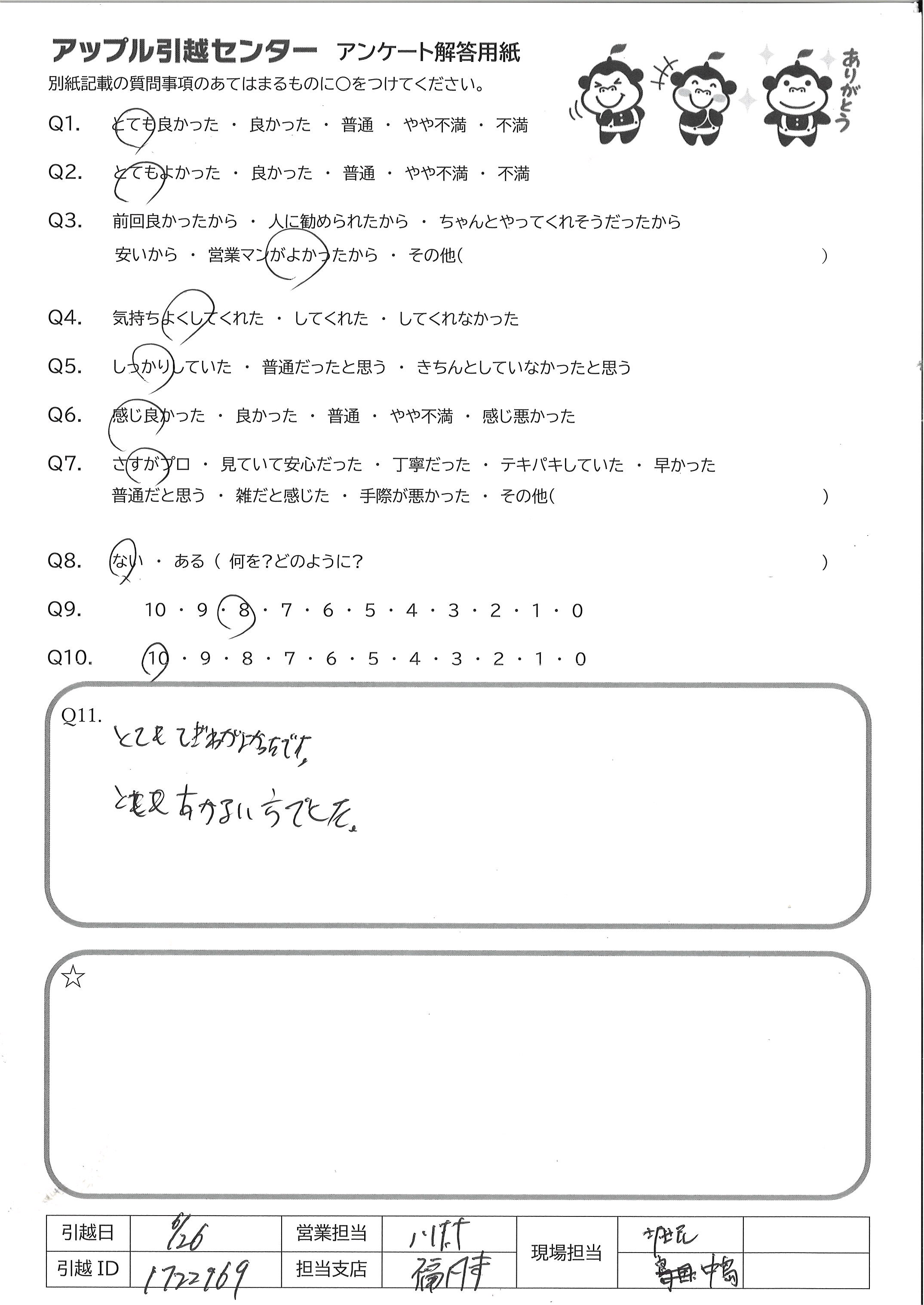 A.暑い中、ご対応有難うございました。 無事に引越しできて感謝しております。 また転居する際はおねがいします。