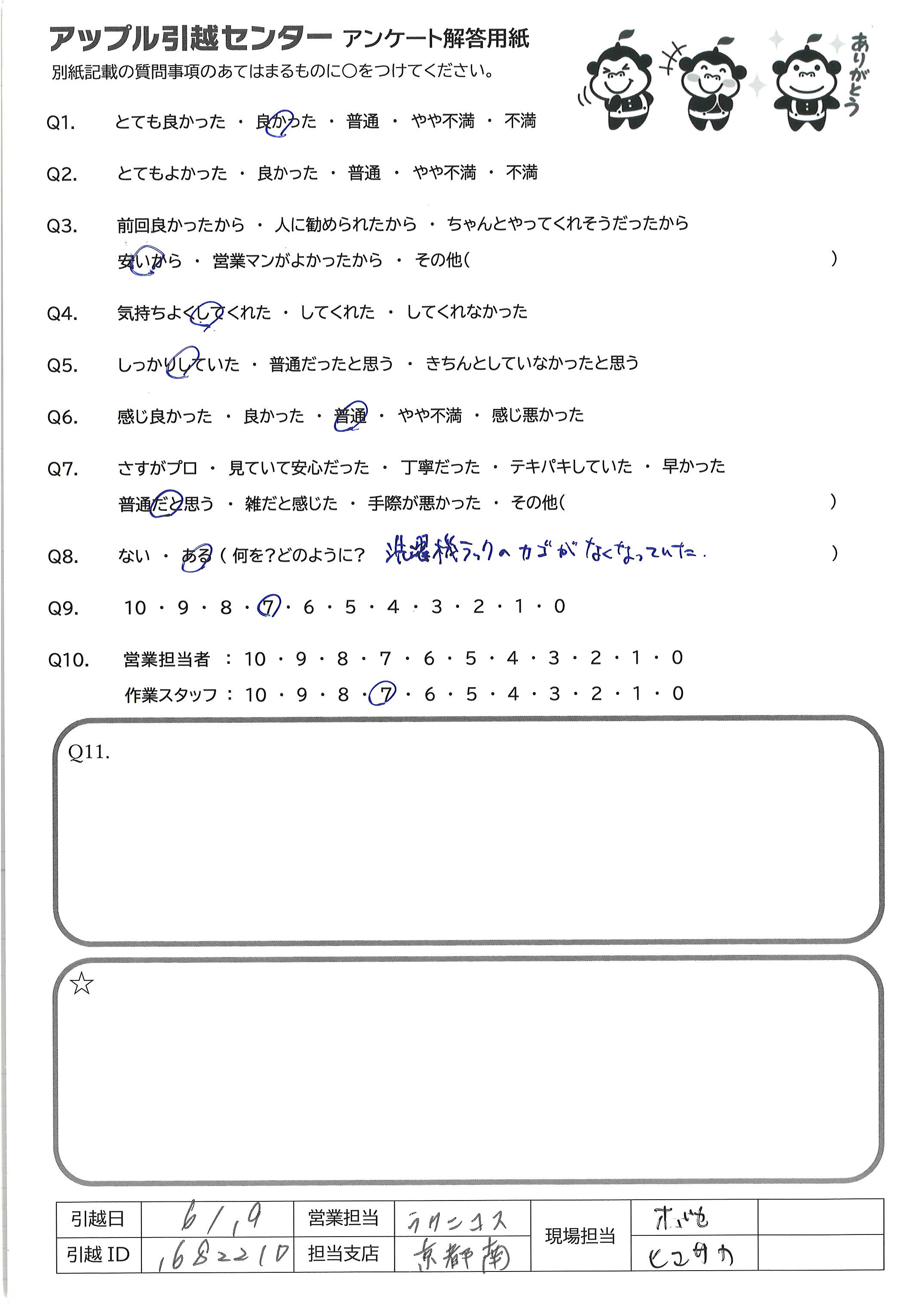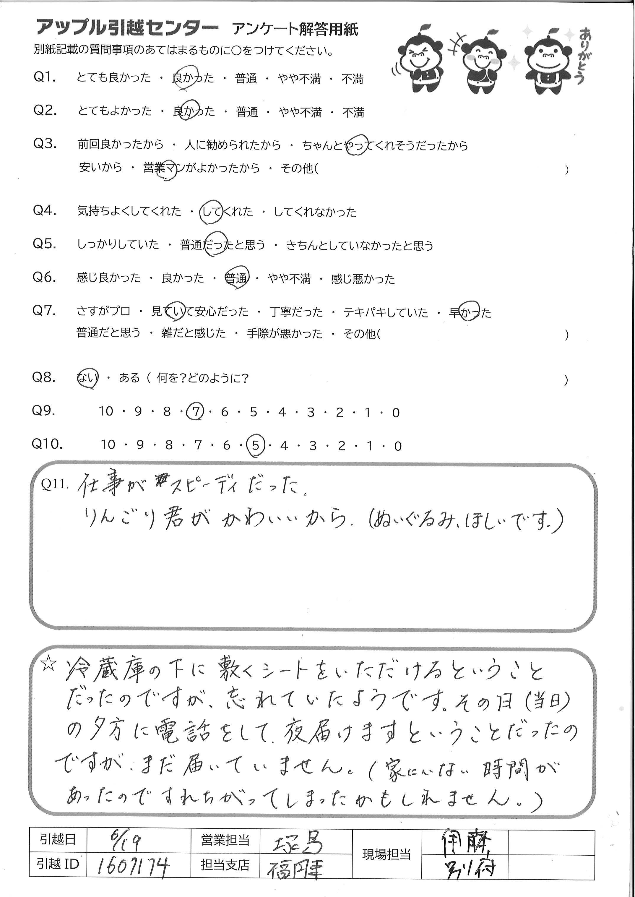 A.冷蔵庫を外におきましたよね?外(階段の踊場)でガラガラと引きずる音がしたので。その状態で新居においたのかと思うと、少し嫌な気分でした。本棚も、梱包せずに運んだのはショックでした。お客様によっては、梱包しなくていいと言う人がいる、と、言われましたが、作業前に聞いてほしかったし、私は、きちんと梱包してほしかったです。古い本棚だからとか、家が古いからという理由なら、腹が立ちますが、うっかり忘れたのでしょうね。誰でも忘れてしまうことはあります。古い市営住宅でも、借りてるものなので、キズつけられると困ります。必ず梱包の確認してください。あと、忘れ物が多かったですね。私自身、車の運転に自信がなくて、やっと市営に戻ってきて、ホッとしてたのに、また、新居に行くことになり、精神的にも疲れました。車の運転に自信がないというのは、私自身の問題ですが、新居に戻るまで、かなり待たせてしまったと思います。お互い無駄な時間ですよね。いろいろ書かせて頂きましたが、結果は、キズもなく、人柄も良かったし、ここで、言いたい事を言わせて頂けたので満足です。今後また、利用することがありましたら、その時は、そちらにお願いしようと考えてます。ありがとうございました。