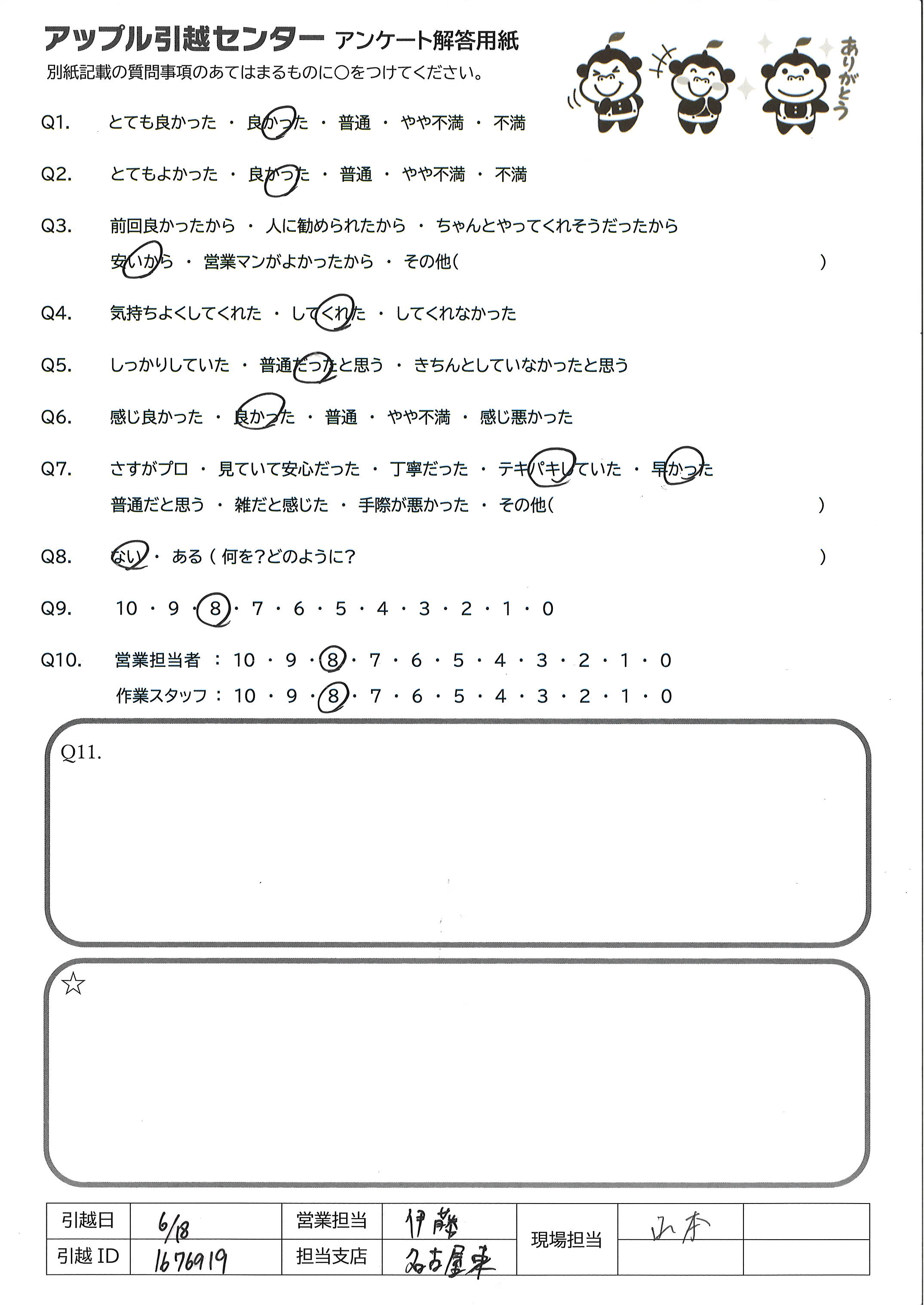 A.上記の通り、現在の我々家族にとって貴社はベストな引っ越し会社です。今回は自宅リフォームのための仮住まいのため、あと1か月後にはもう一度引っ越しをお願いいたします。 貴社の良いところは、全てに完結で無駄が無くて、それでいてスタッフの対応も良いうえにコストが安いこと。その尖った特徴を伸ばせるだけ伸ばしてから、ゆっくり丁寧、過剰に親切の高齢者や富裕層向け横展開をオプションか別ブランドで初めても良いかもしれません。
