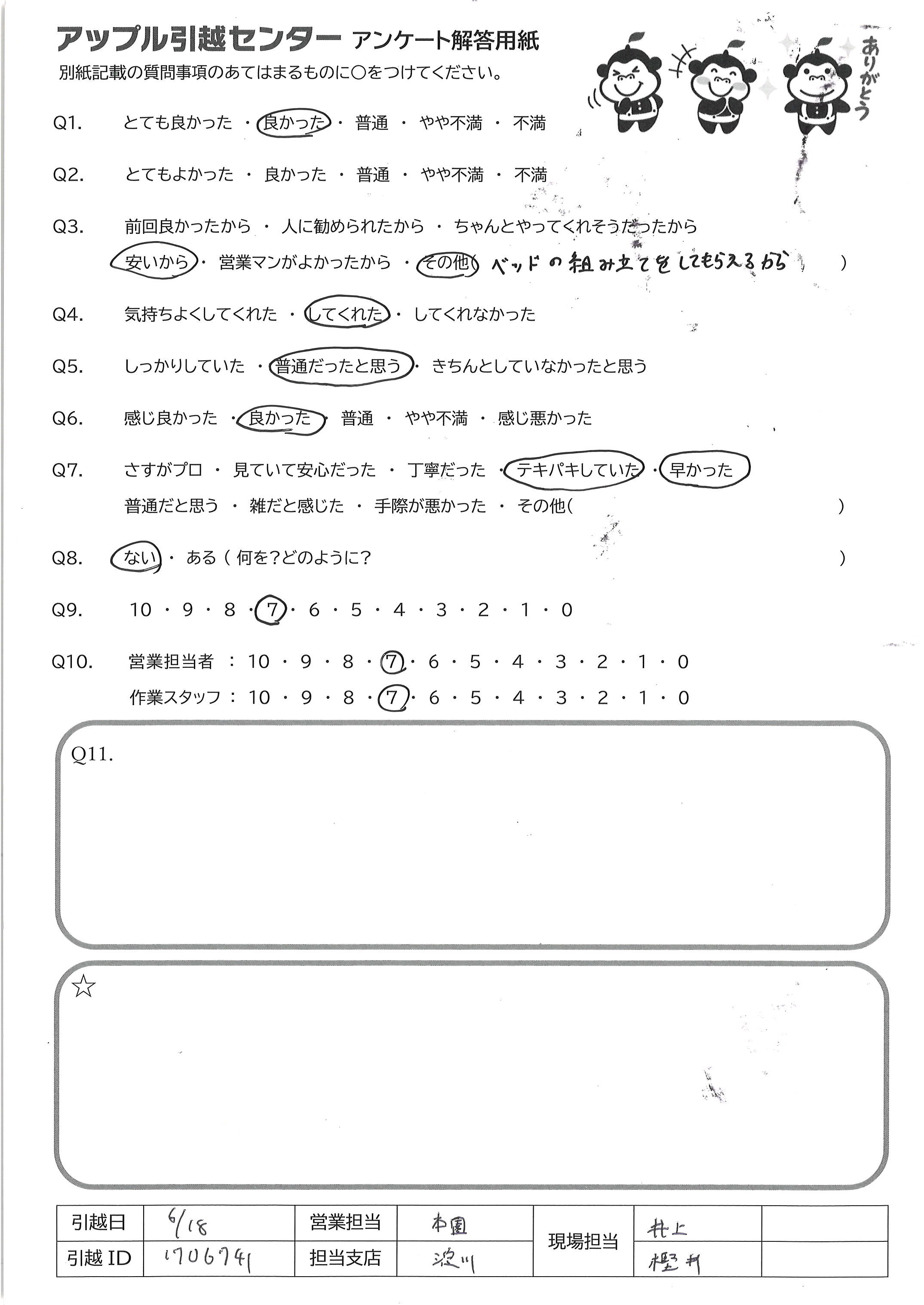 A.ワンルームの狭い部屋でごちゃごちゃしていて運びにくかったと思いますが、手際よくあっという間に作業を終えていただきました。 不要品回収もベッドの組み立ても本当に助かりました。 初めての引越しで不安でしたが、面倒なやり取りもなく大変ありがたかったです。 本当にありがとうございました。