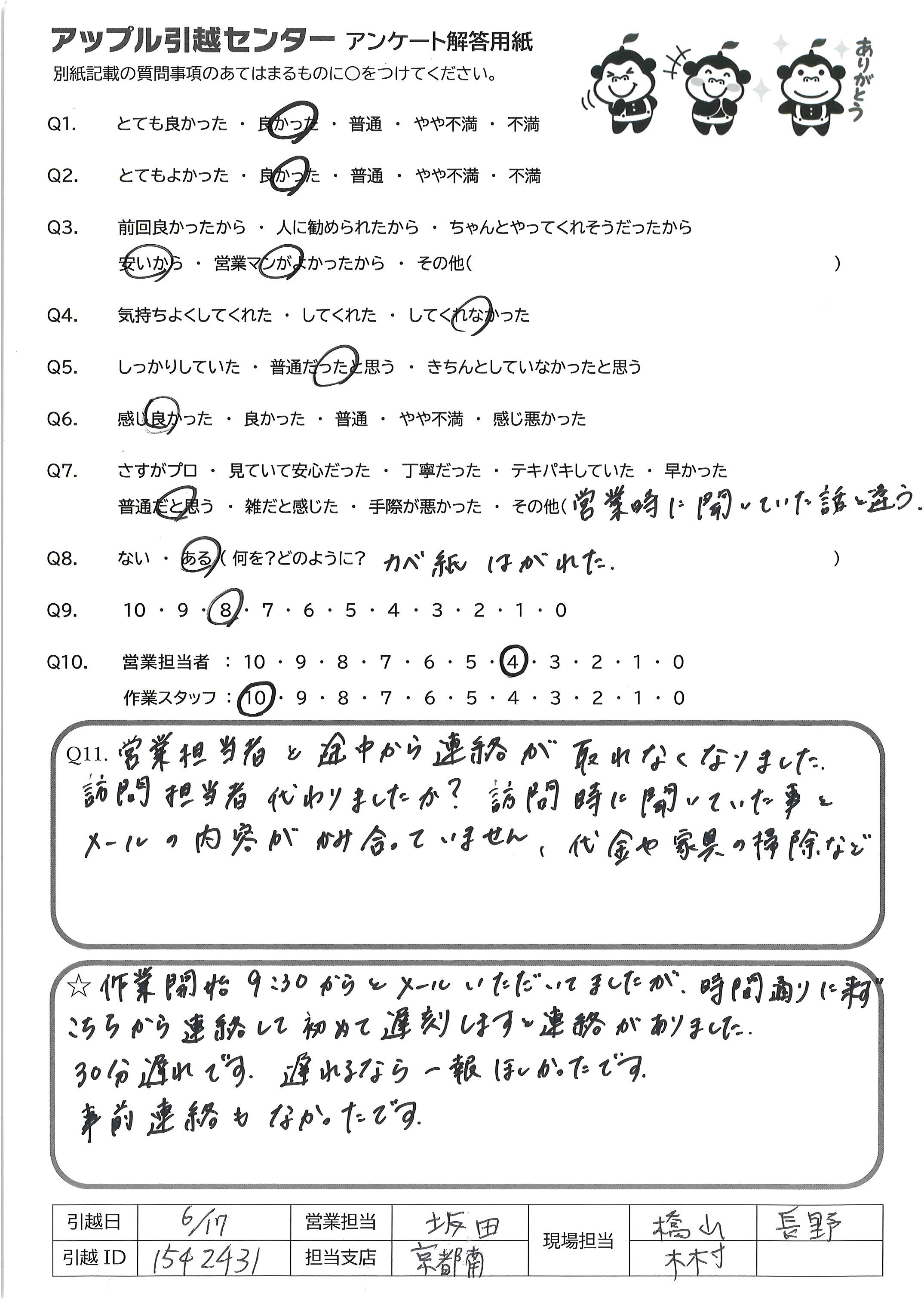 A.ダンボールの引き取りの時間で、受付の人と作業スタッフの 情報共有ができてなくて少し残念。 また引き取りにきた方がかなりたばこ臭く具合悪くなり そうでした。引っ越し日はよかったのに最後が残念・・・・