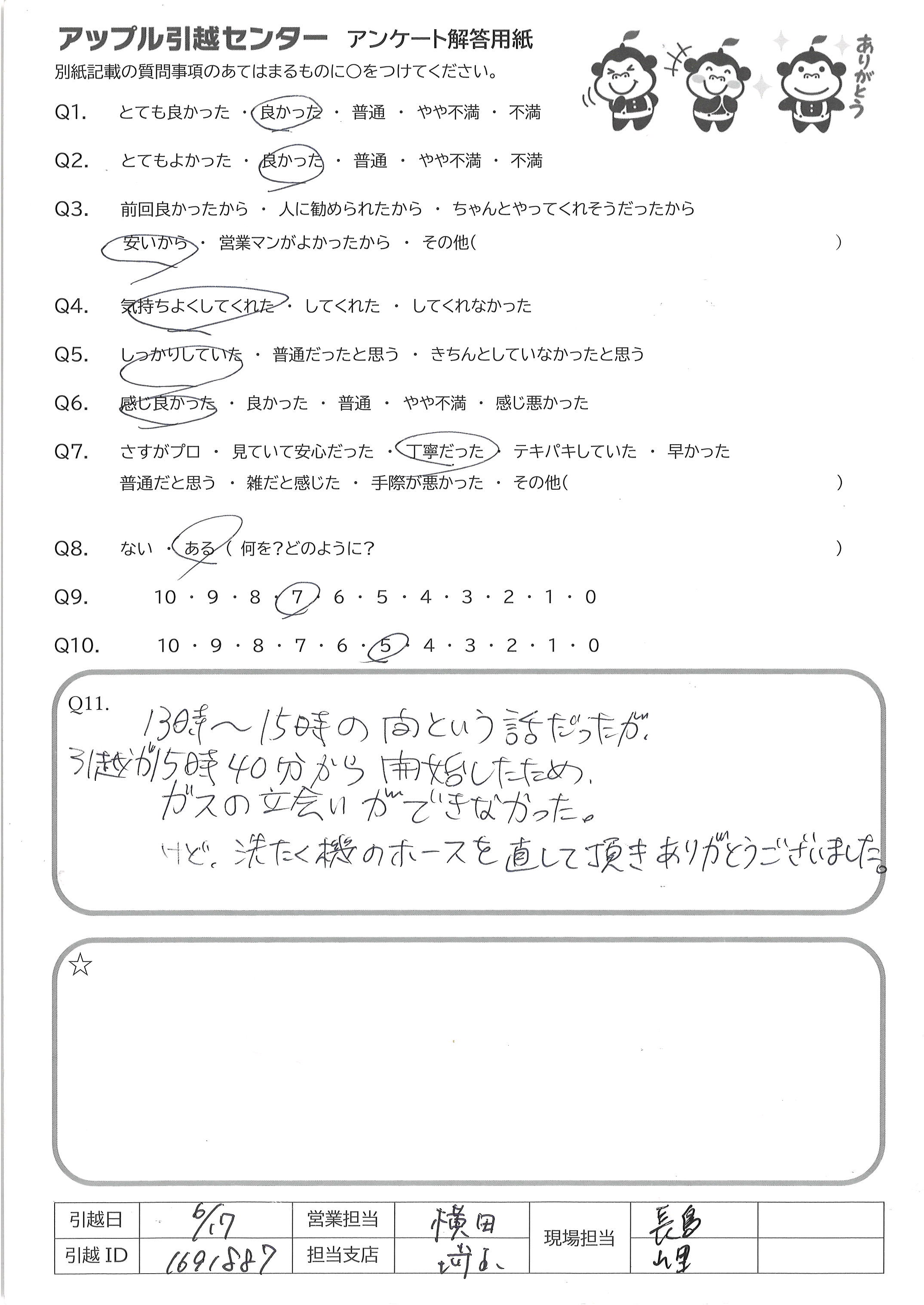 A.13時~15時の間という話だったが 引越が15時40分から開始したため ガスの立ち会いができなかった けど、洗たく機のホースを直して頂きありがとうございました
