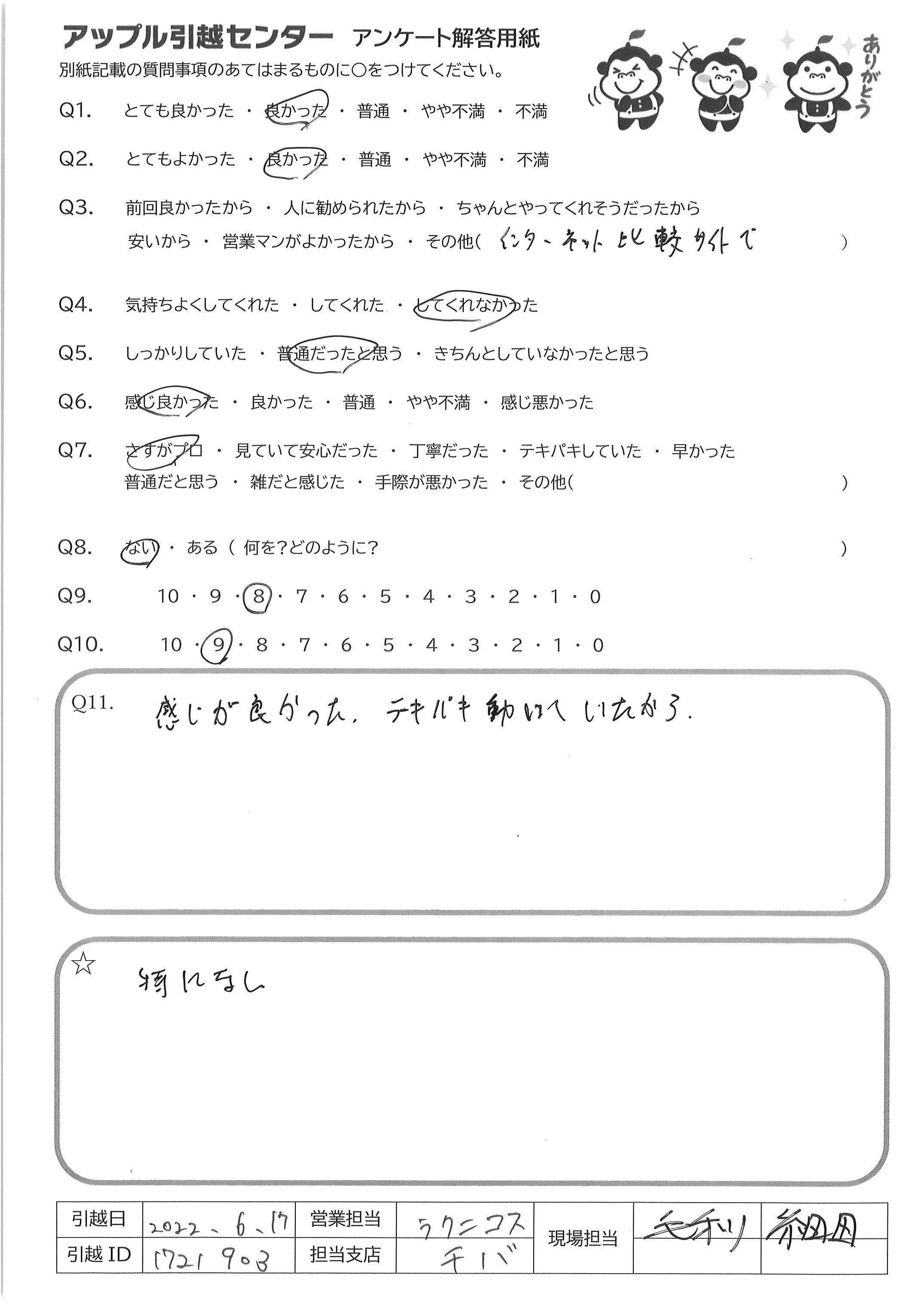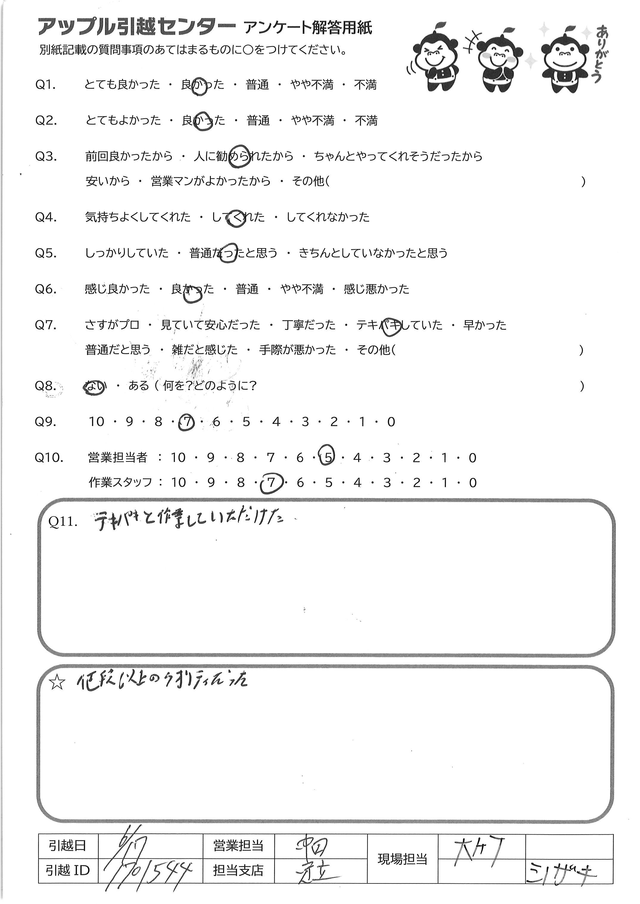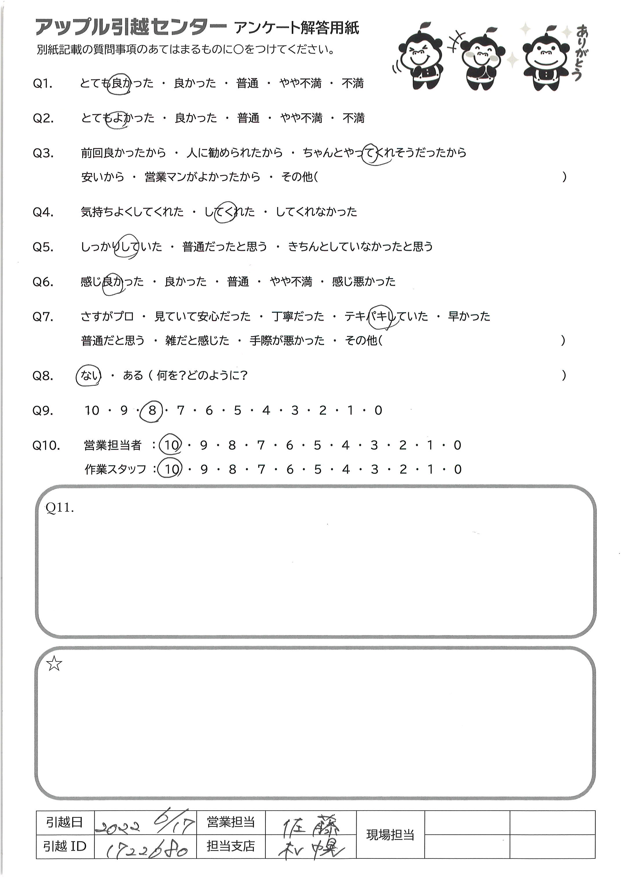 A.作業スタッフの3名のみなさまとても感じもよく今までの引っ越しの 時のどのスタッフの方と比べても1番よかったです 次、引っ越す際も今回の3名の方々がよいです。引っ越しの際は 見積りの時の対応が良くても作業スタッフの方があんまり。。という事も ありますが、今回は逆でした。とても良い引越になりました。 ありがとうございました