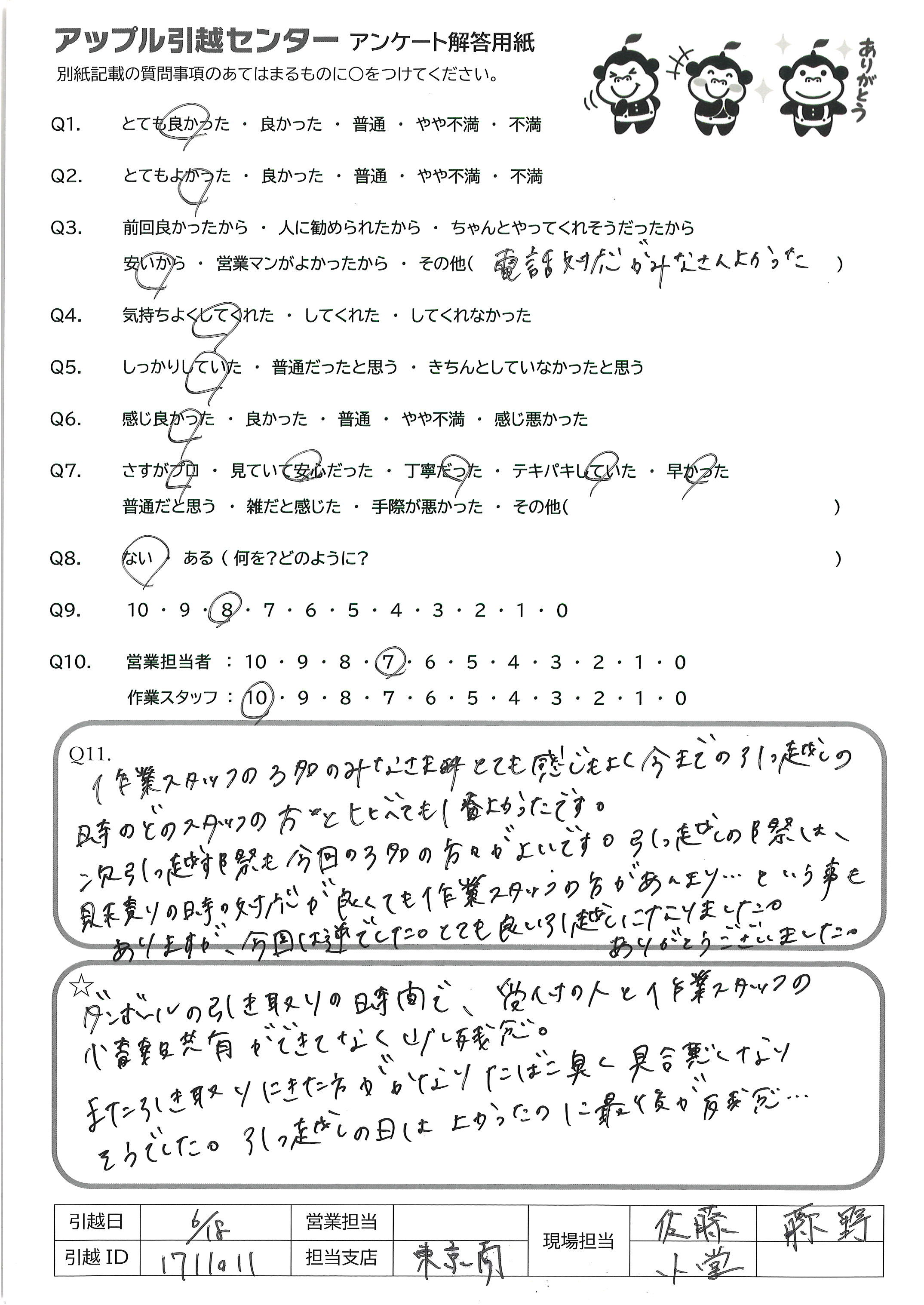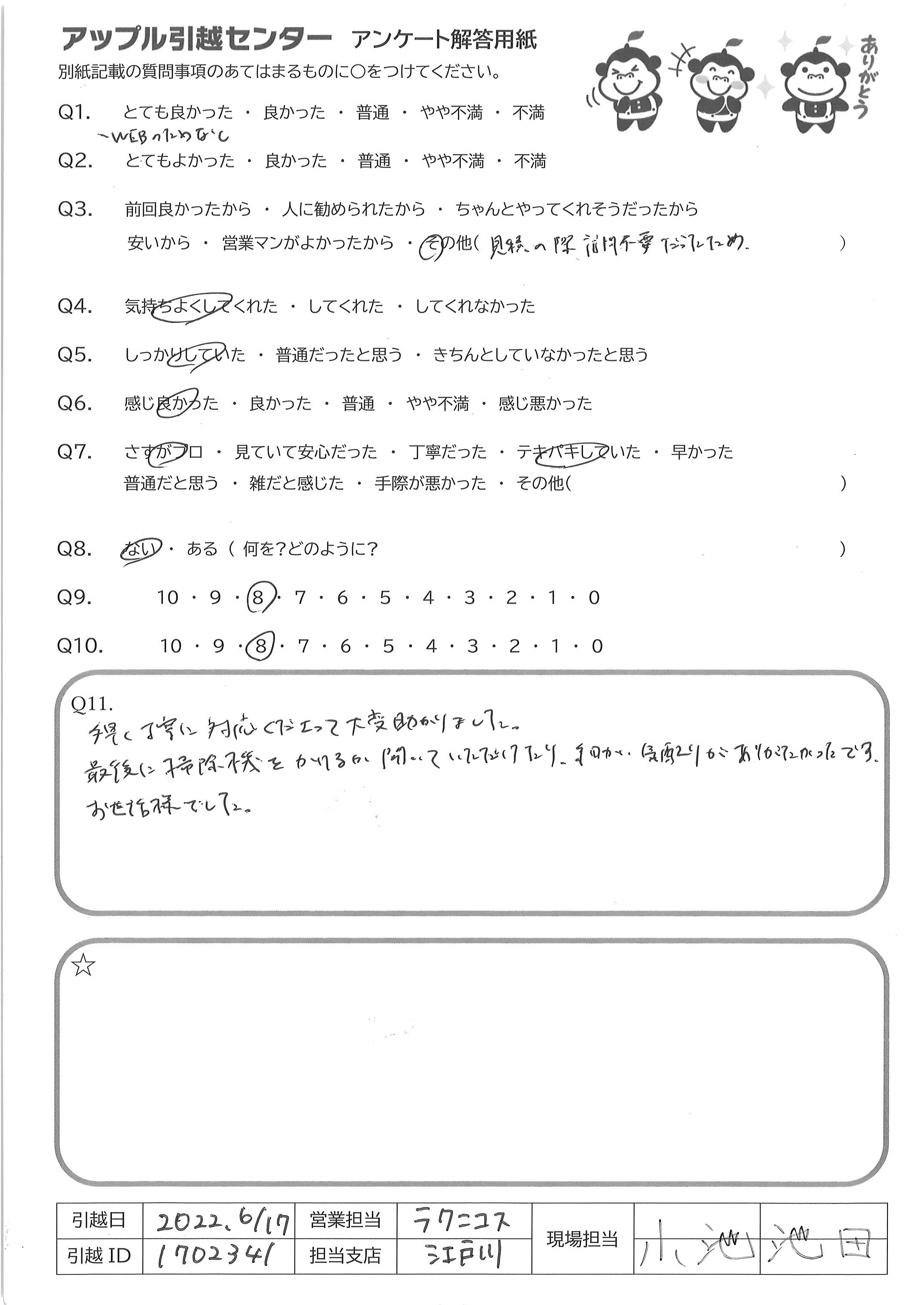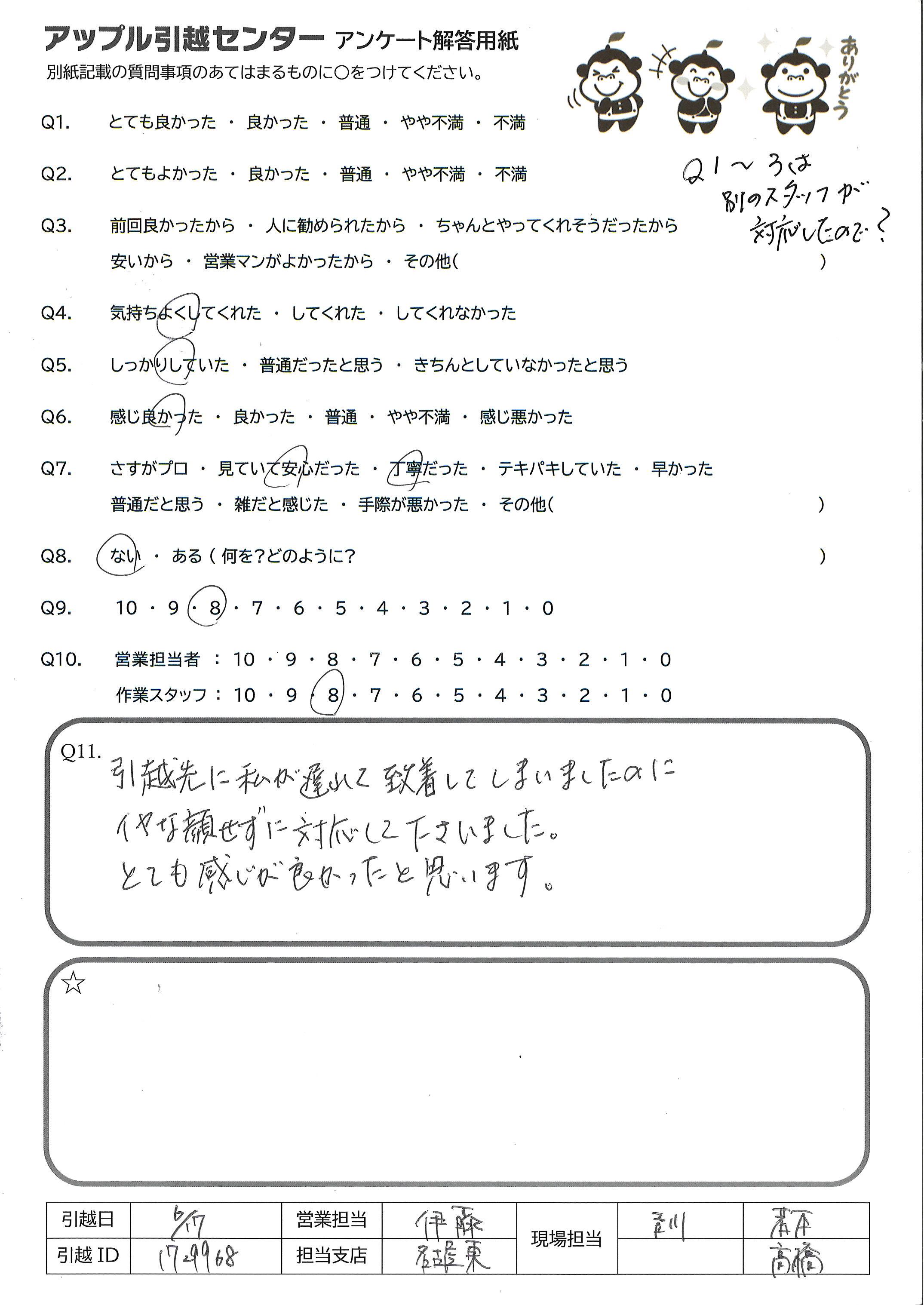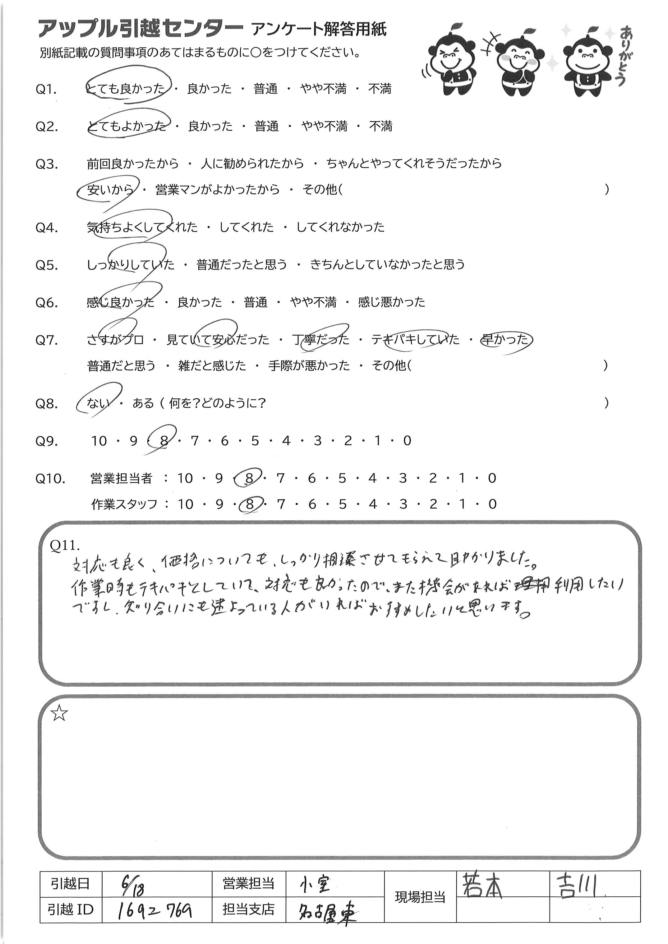 A.作業スタッフの3名のみなさまとても感じもよく今までの引っ越しの 時のどのスタッフの方と比べても1番よかったです 次、引っ越す際も今回の3名の方々がよいです。引っ越しの際は 見積りの時の対応が良くても作業スタッフの方があんまり。。という事も ありますが、今回は逆でした。とても良い引越になりました。 ありがとうございました
